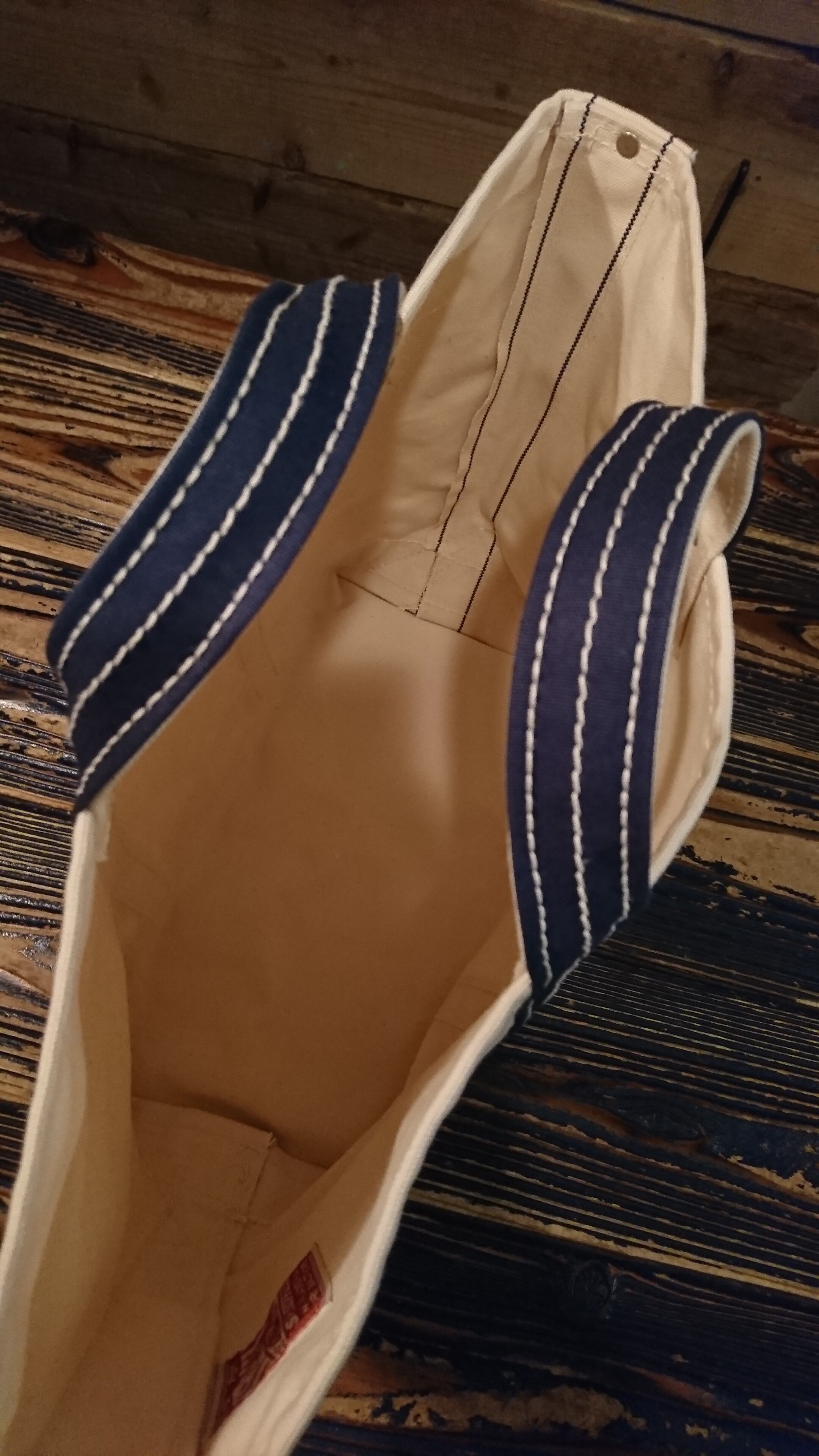 使われるオリジナルキャンバスは硬く、生地にしっかりとした張りを与え、そのまま自立できるほどのバッグになってます。