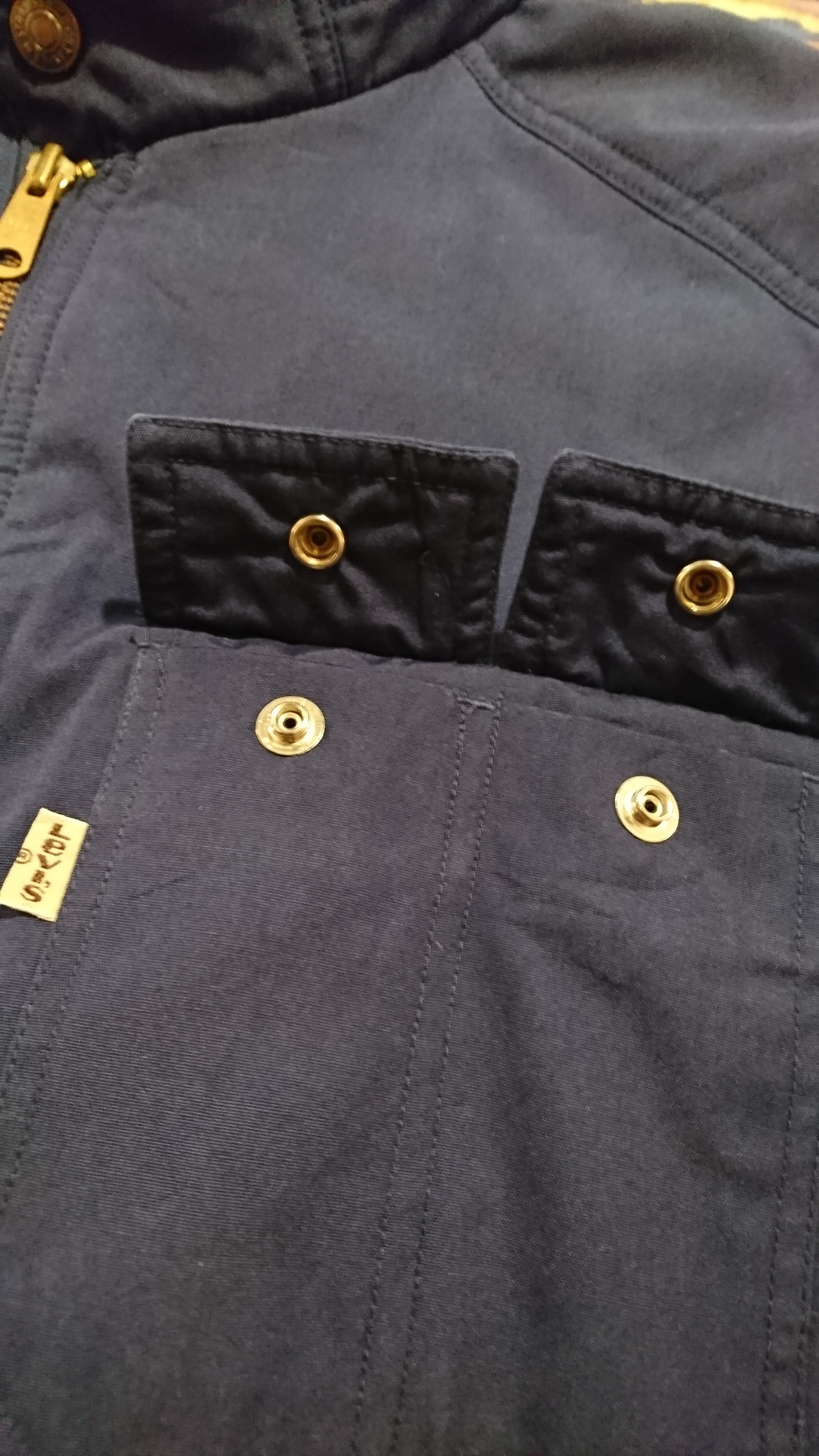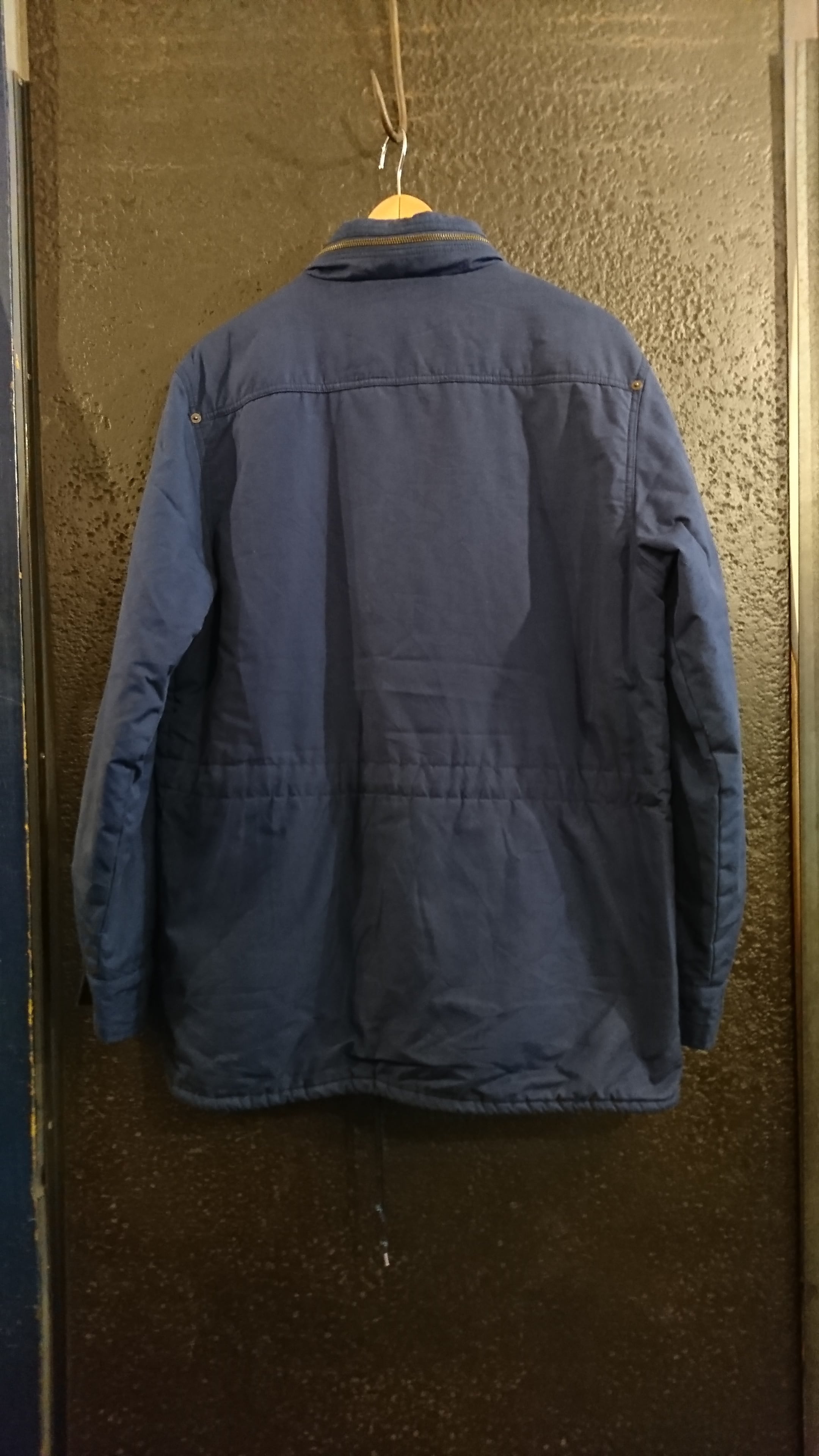 フードは襟に収納式。両肩前後にリベットうち。裏地はネル素材になります。着用感ありますが