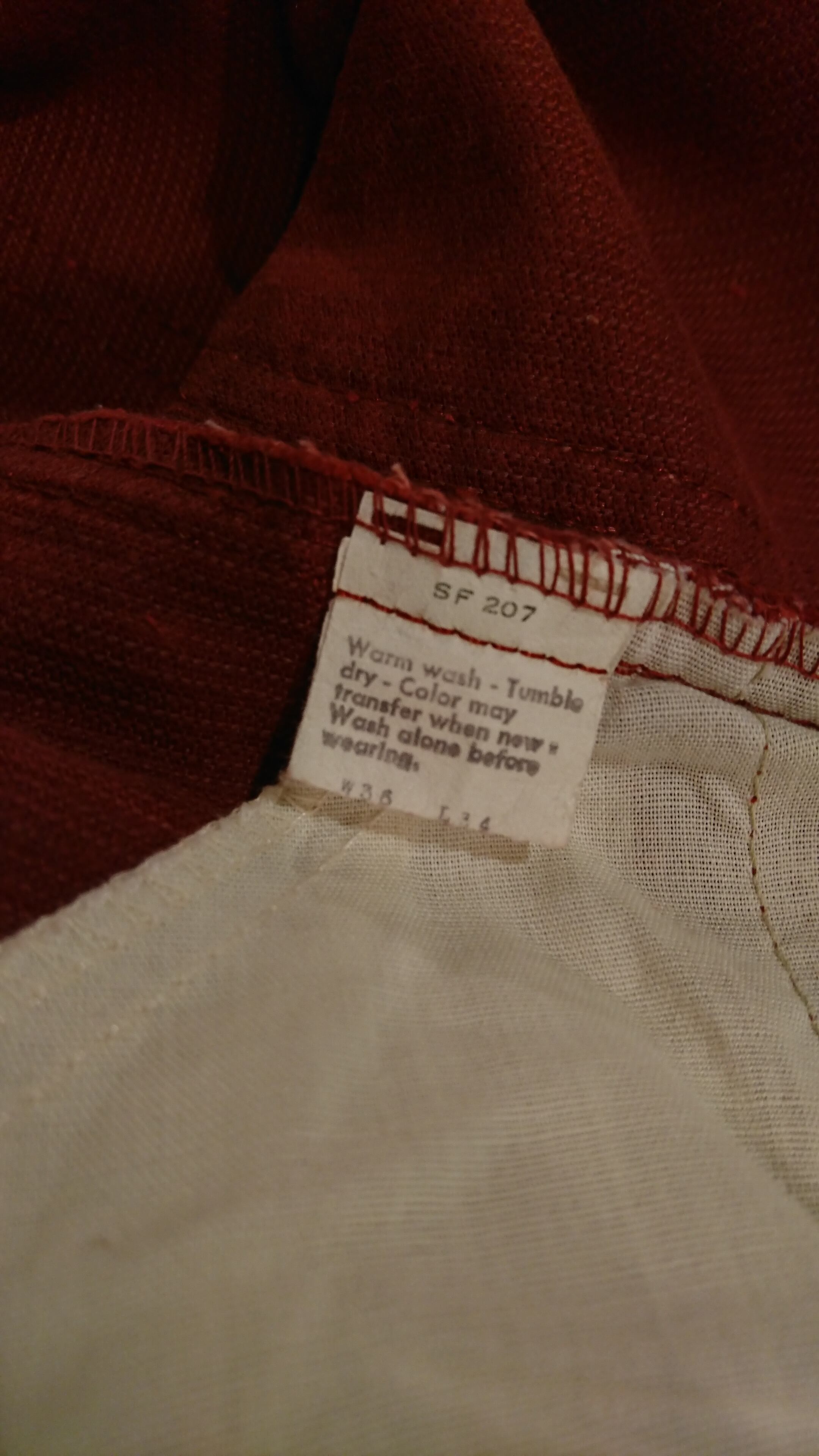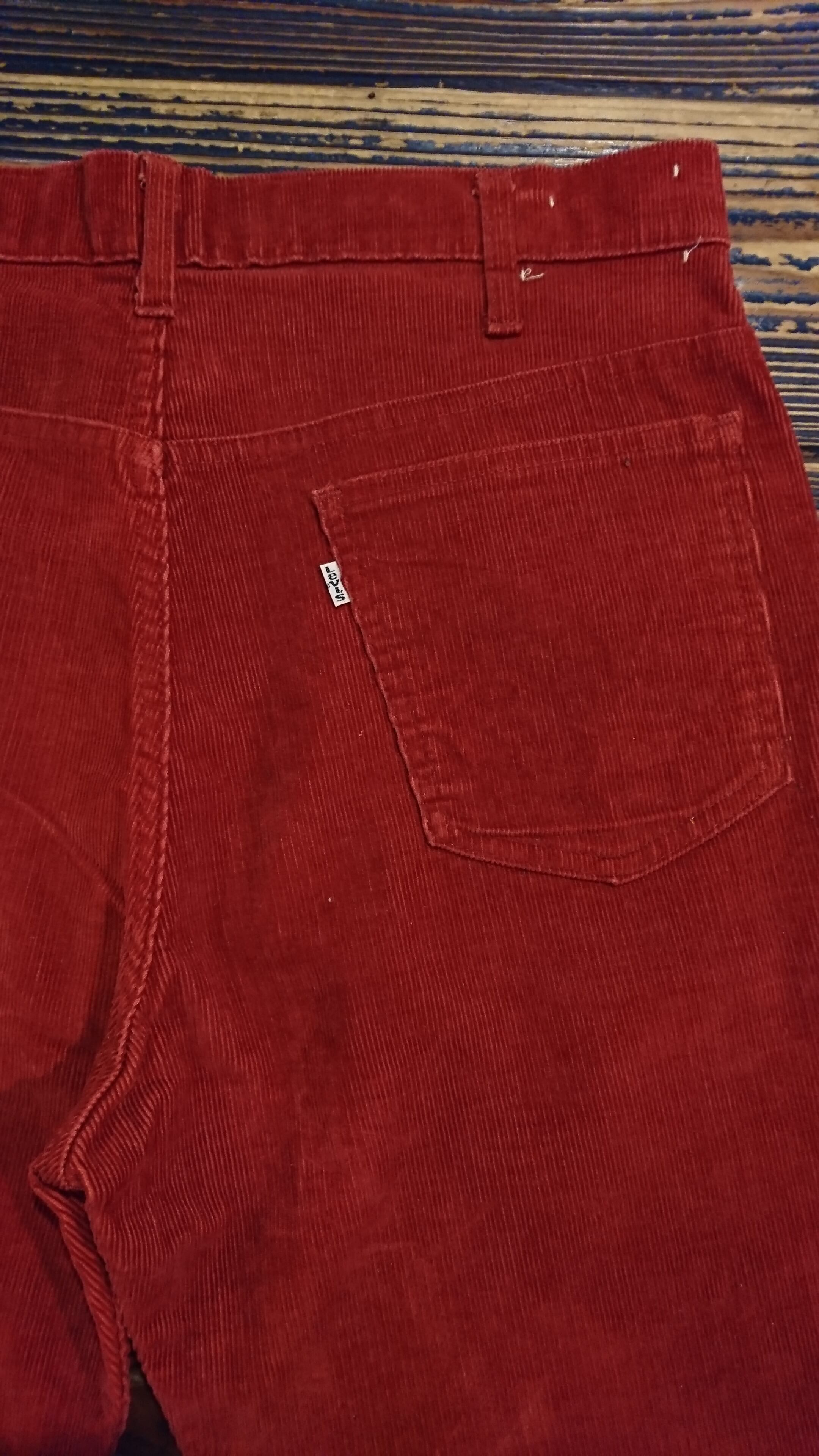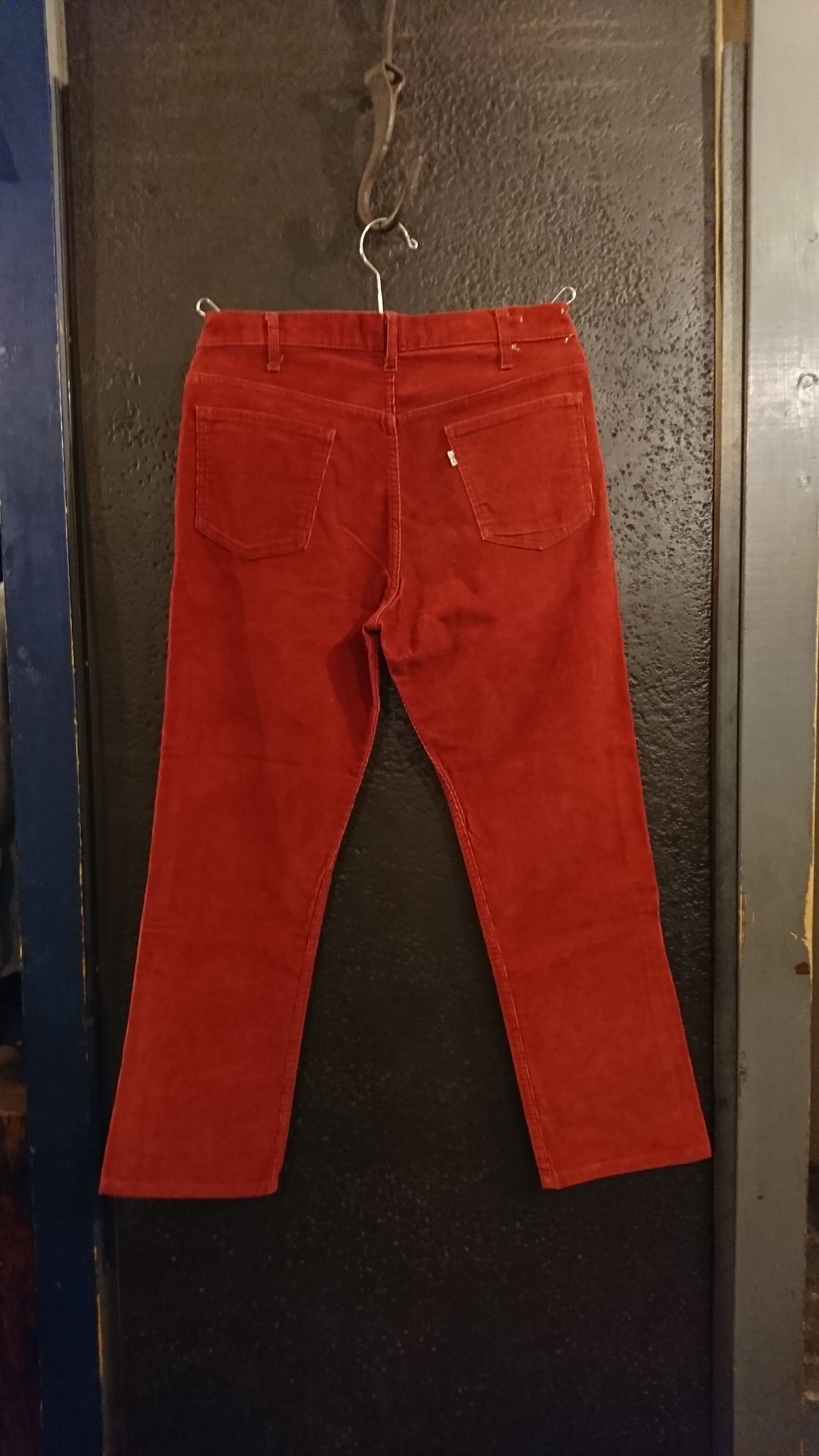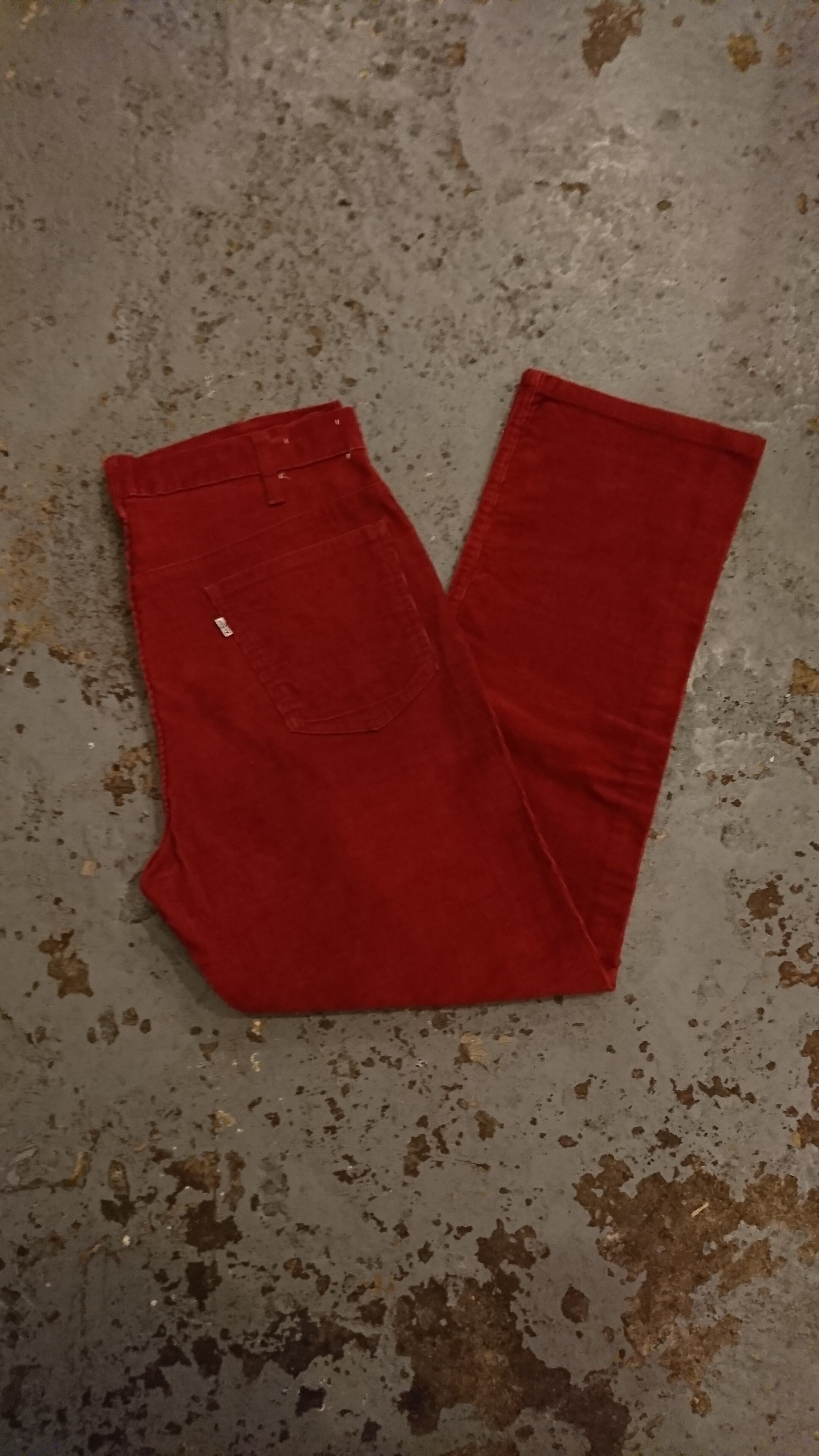 カラーはレンガ色。全体的にコンディションは良いほうで、右足に1ヶ所汚れと裾はオリジナルレングスではなく直してます。気になった方いかがでしょうか。