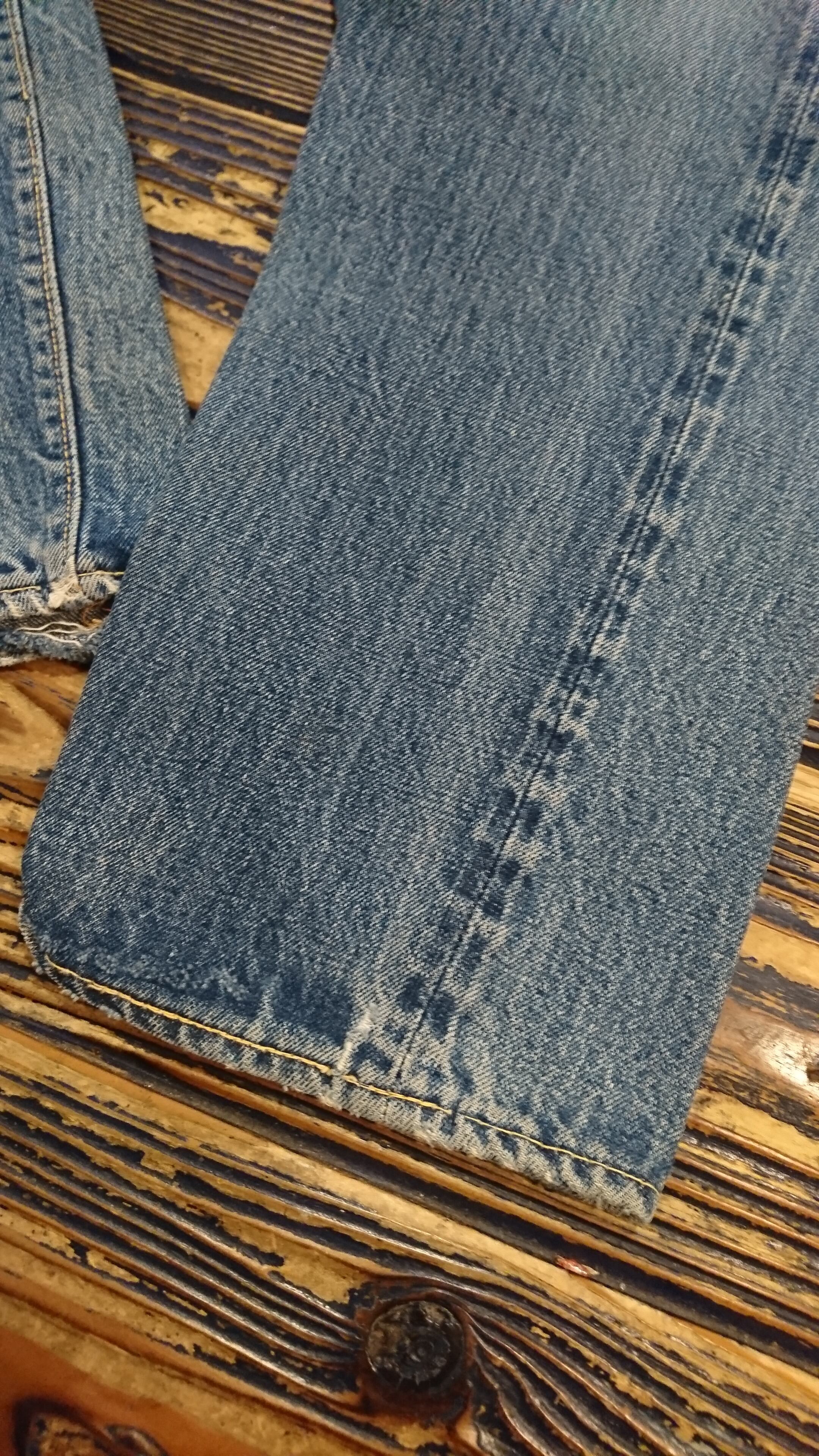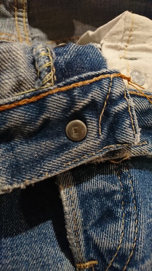 フロントのボタンホールにリペアあり。裾はオリジナルレングスで両足裾1ヶ所づつ抜糸あり。