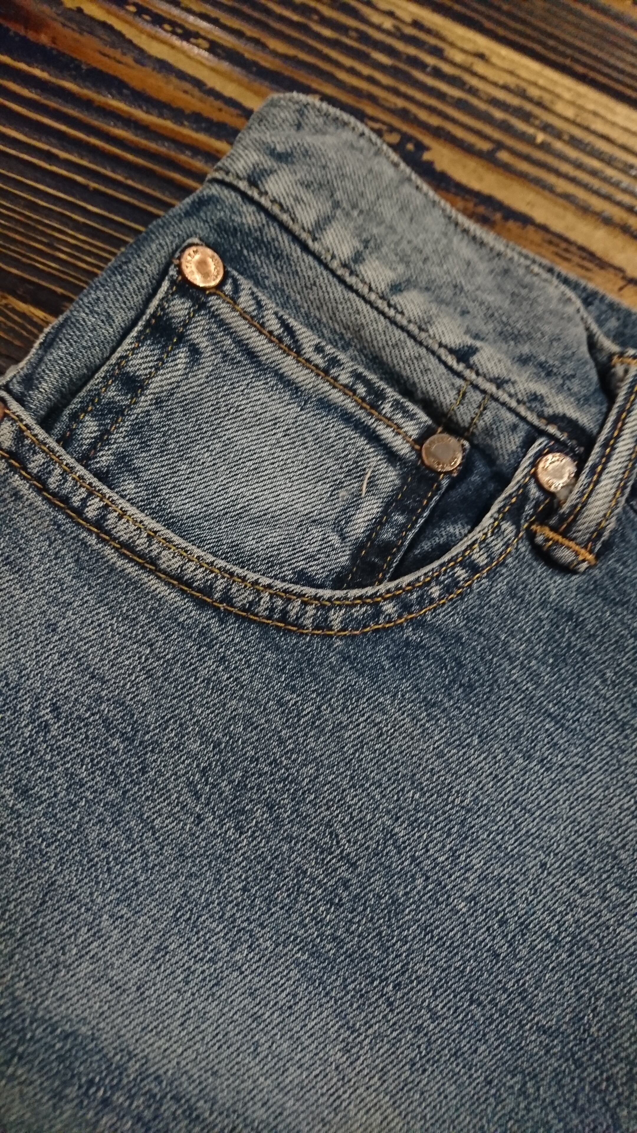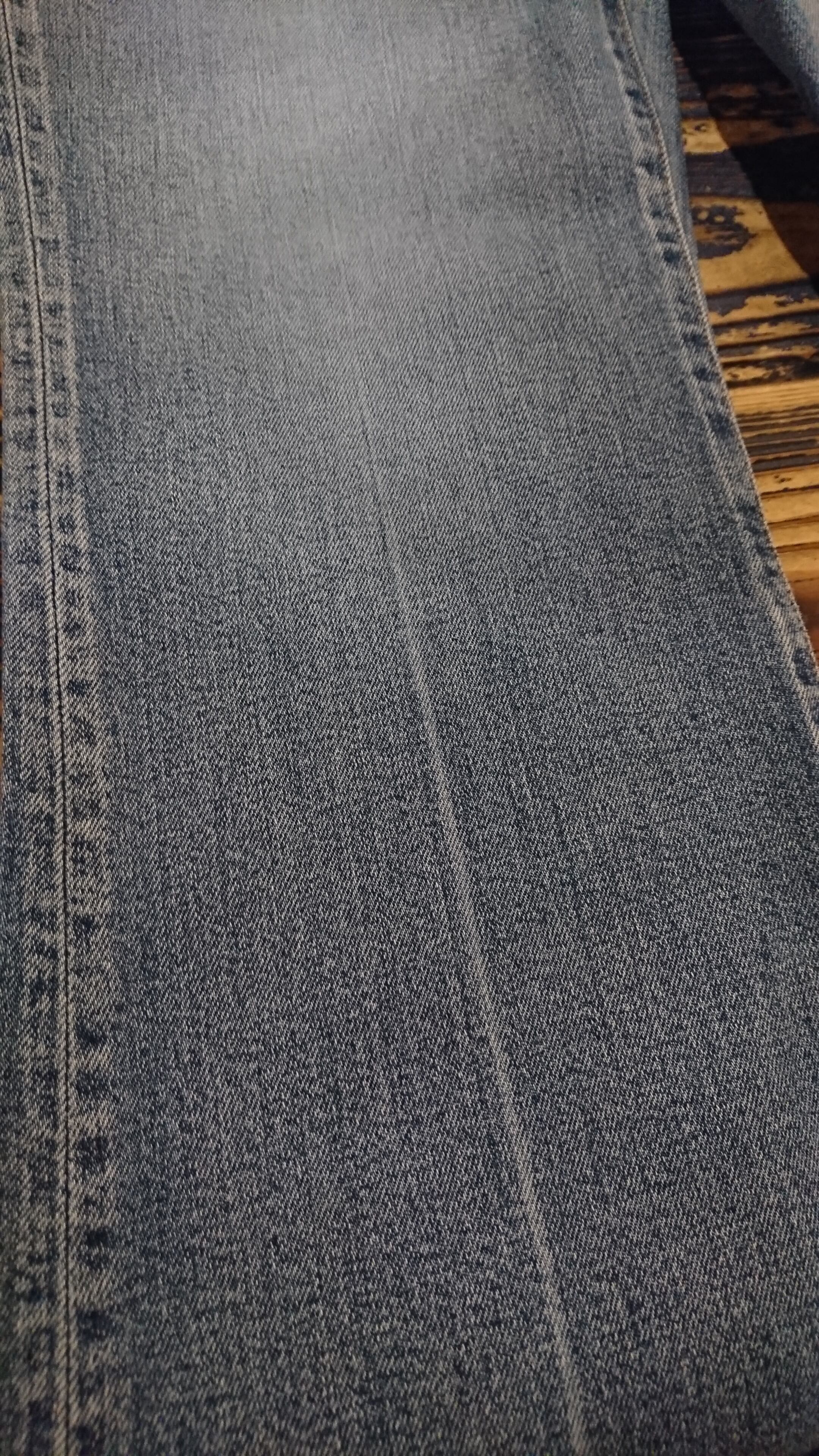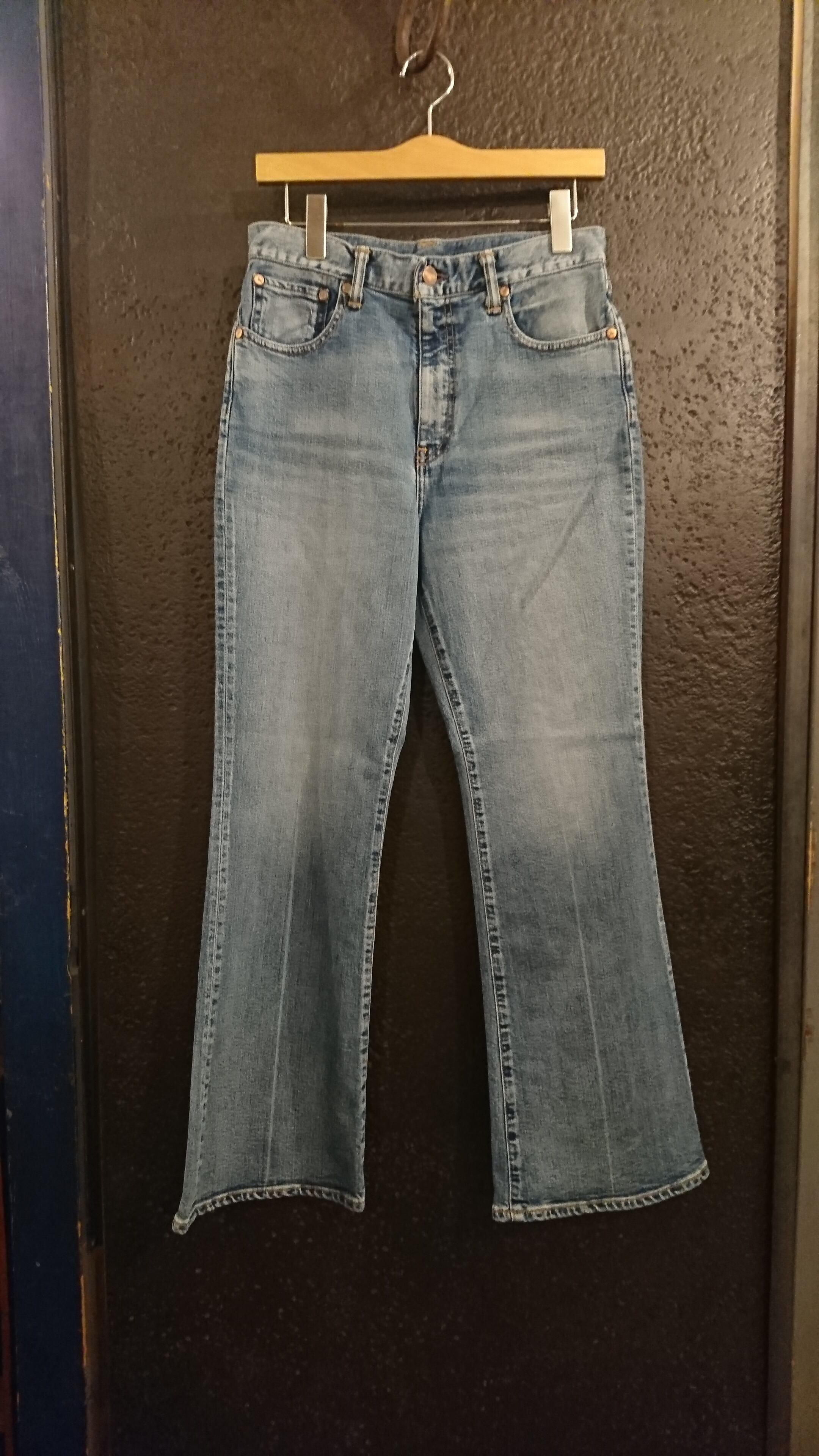 廃棄された不要糸が原料の再生スパンデックス糸を採用したリサイクルストレッチデニム。カイハラデニムと共同で開発したオリジナル生地。最新のレーザーマシンやオゾン加工を使い、環境に配慮し水の使用量を削減した生産工程に拘って作成。70年代を彷彿させるブーツカットフィットが新鮮。