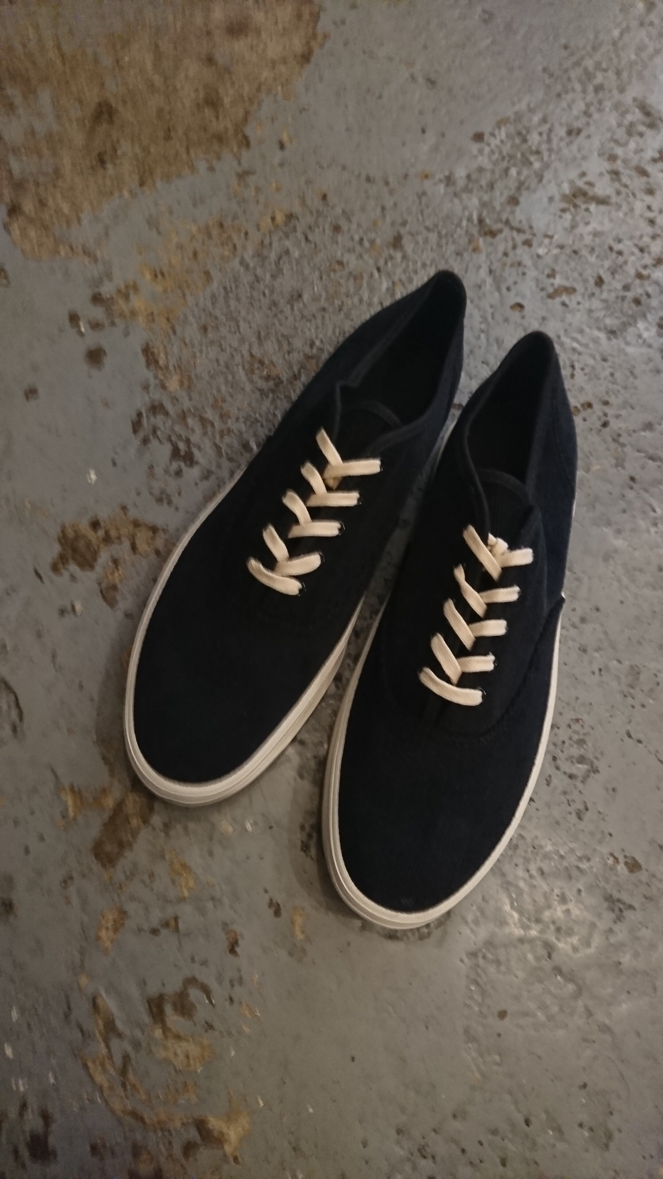 BALL BANDのトレードマークである赤丸がヒールパッチにつきます。1970年代には消滅したスニーカーブランド。ブラックコーデュロイのデッキシューズ。デザイナーブランドからリリースされてるようなデザイン。洒落すぎる一足です。