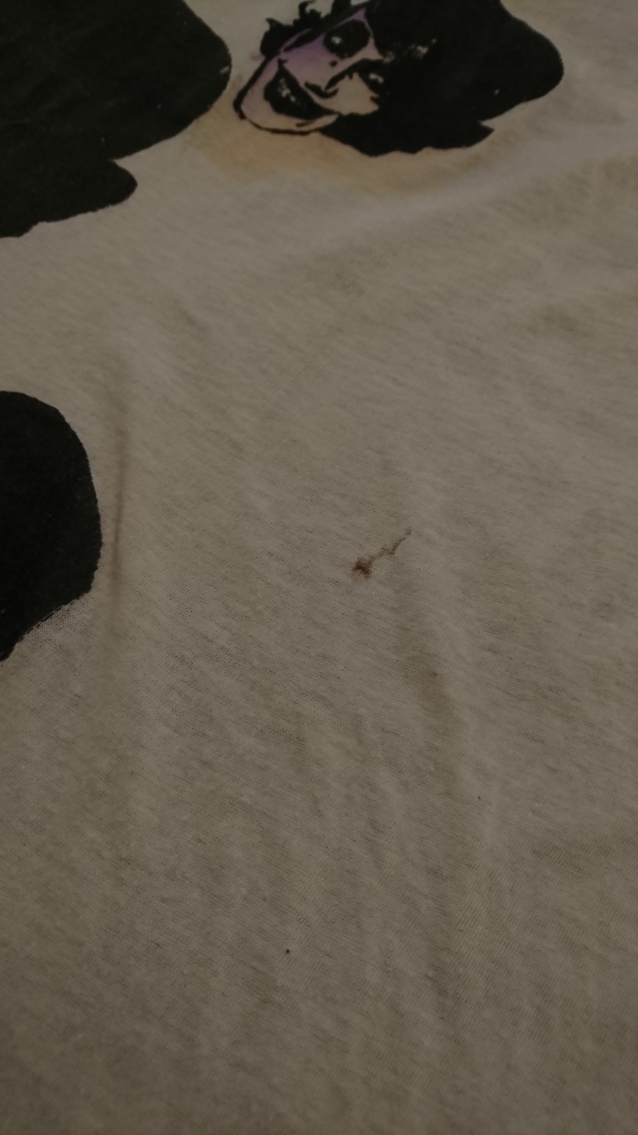 フロントのプリントの横にインク汚れがありますが、おそらく手刷りの際についたものだと思います。着用感ありますが致命的な傷等はありません。