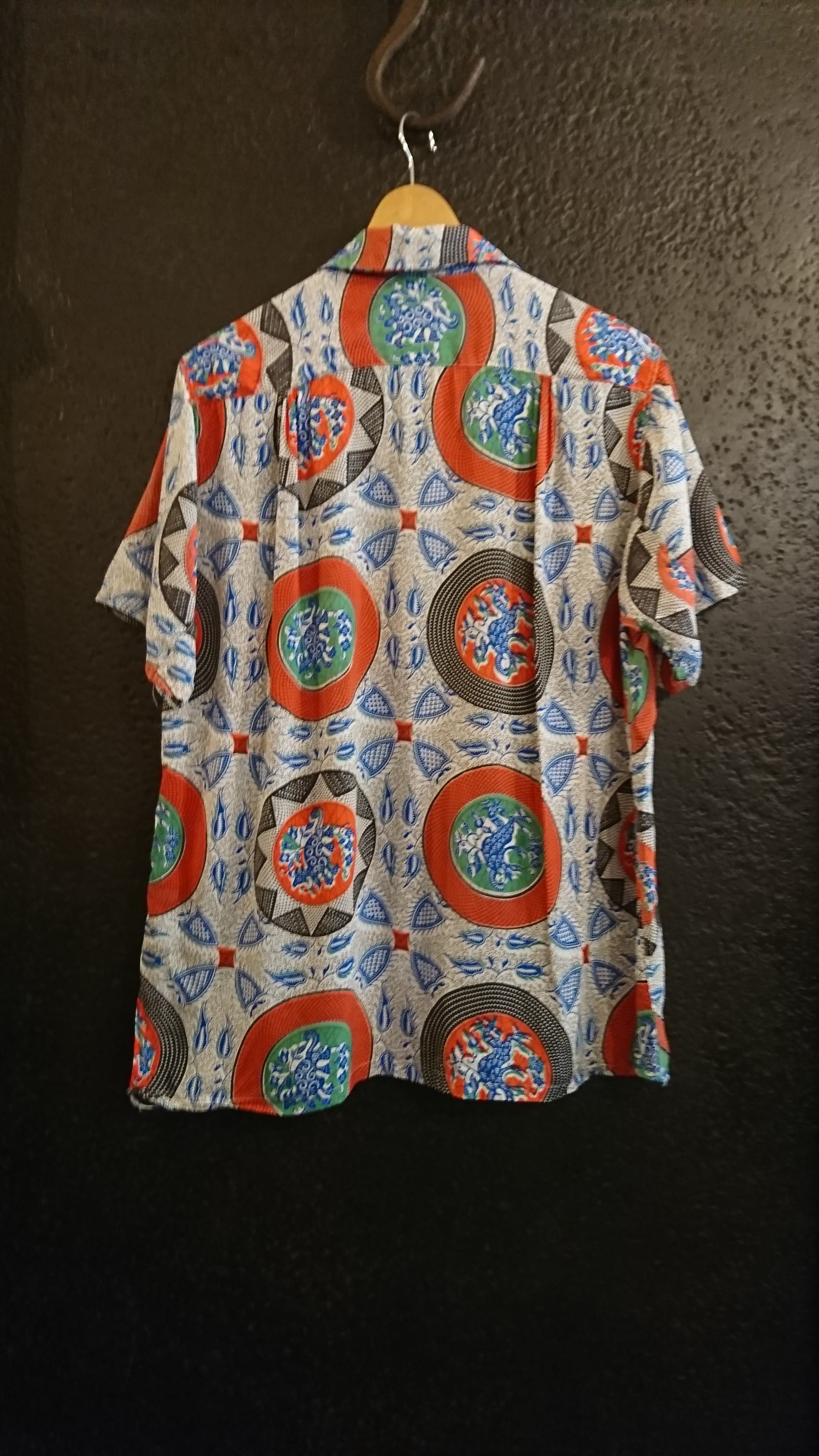 40年代 TOPFLIGHTのレーヨンハワイアンシャツになります。アフリカぽい民族的柄でしょうか、