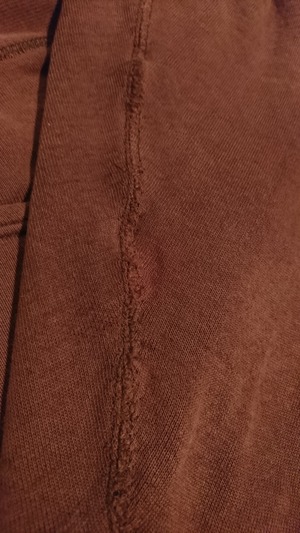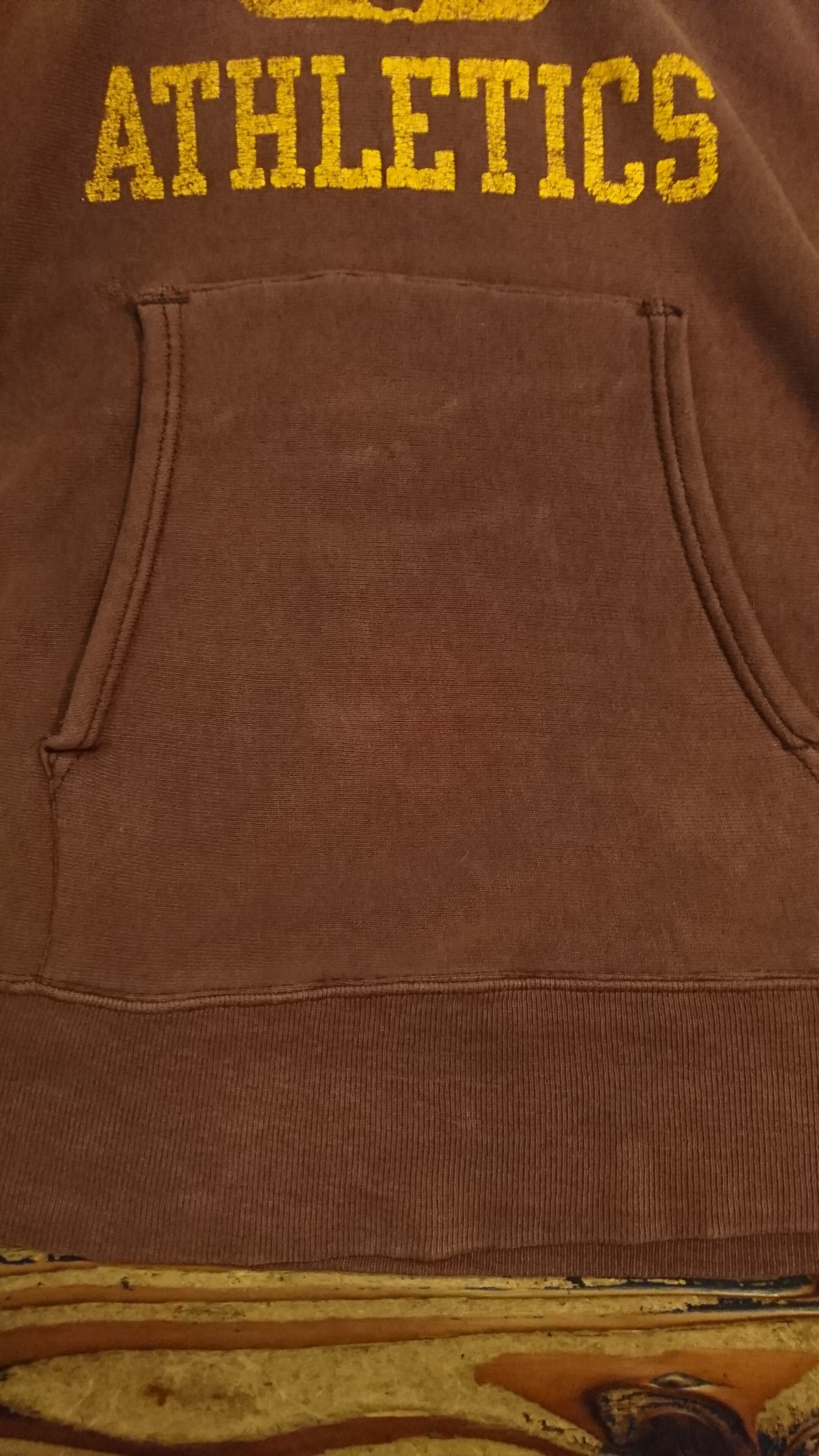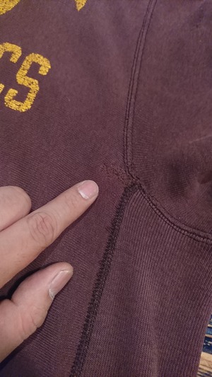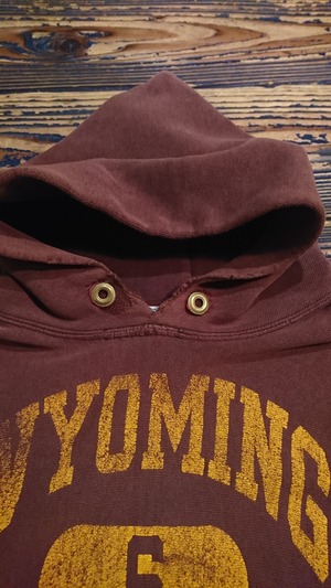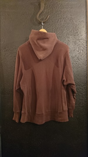 全体的に色褪せ、フード部分、ボディ、腕等所々にリペア箇所がありますがその雰囲気がまた男前。ブラウンカラーのフードで良いプリントも