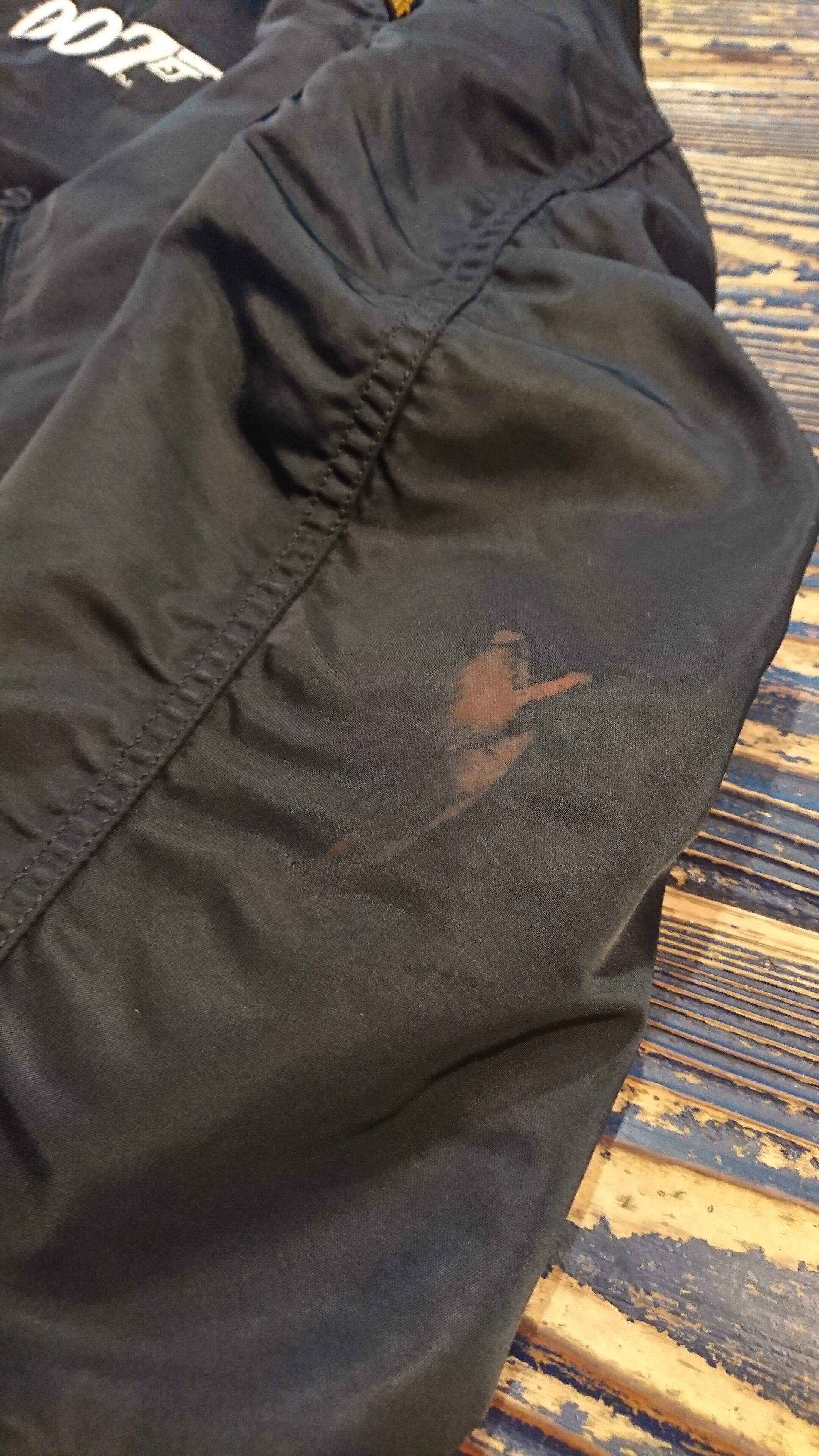 裏のオレンジ面の右側ポケットのスナップ欠損しています。両腕に汚れあり。致命的な傷はないので着用に問題はありません。