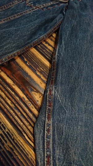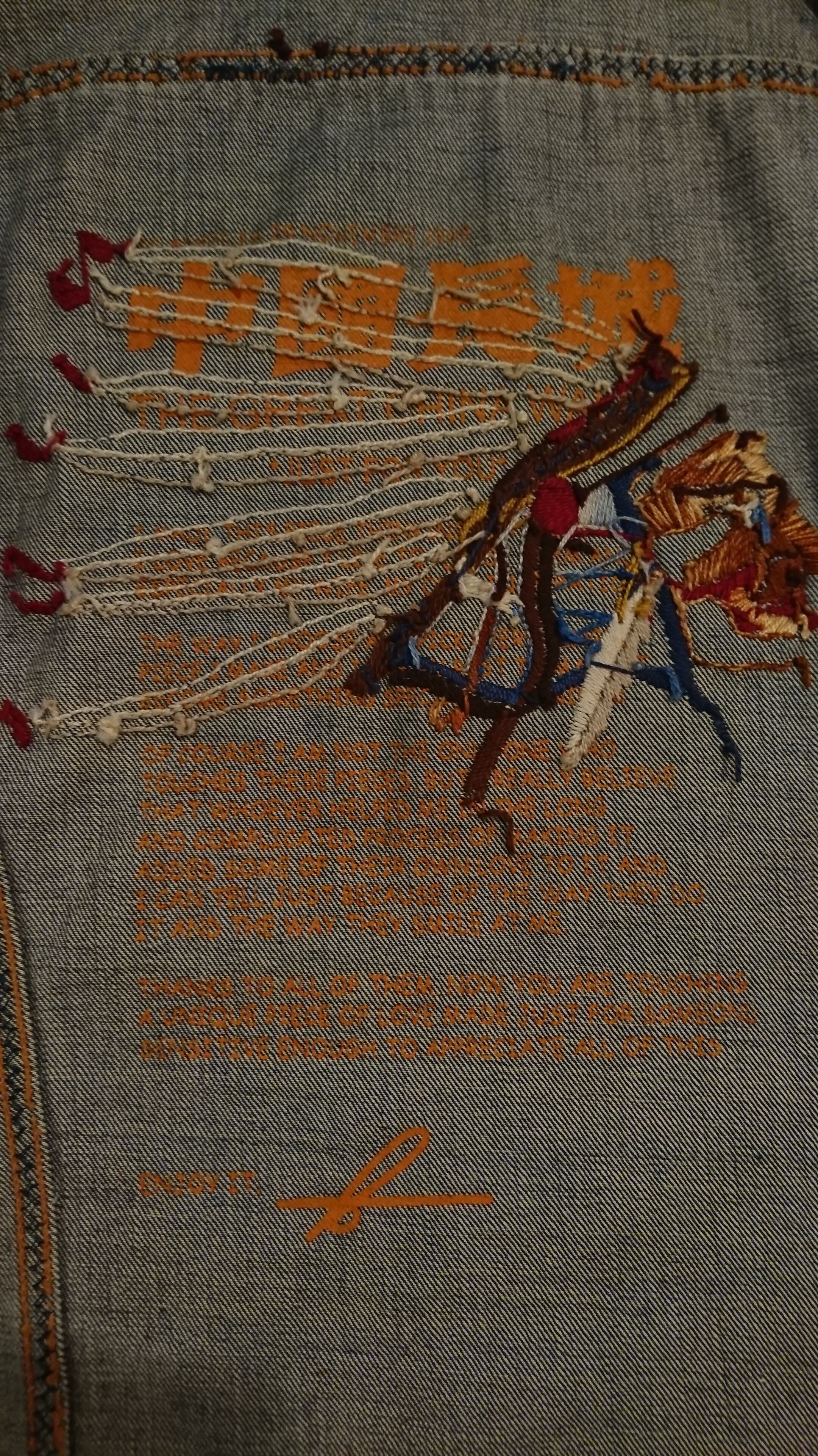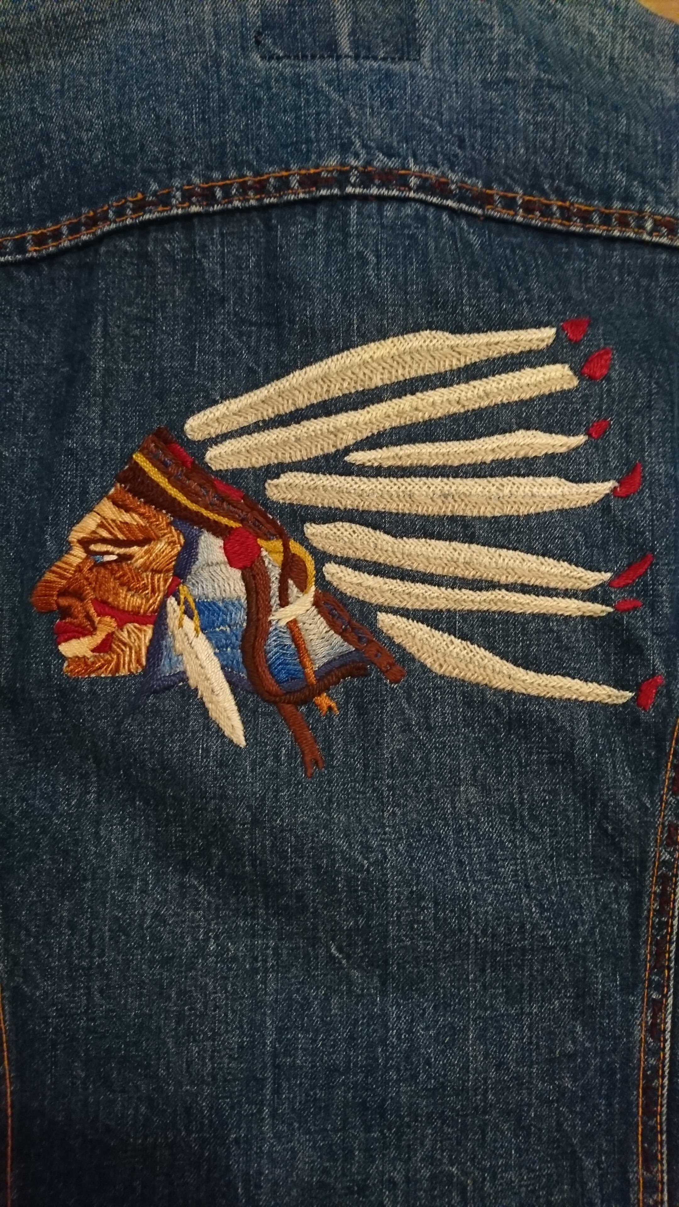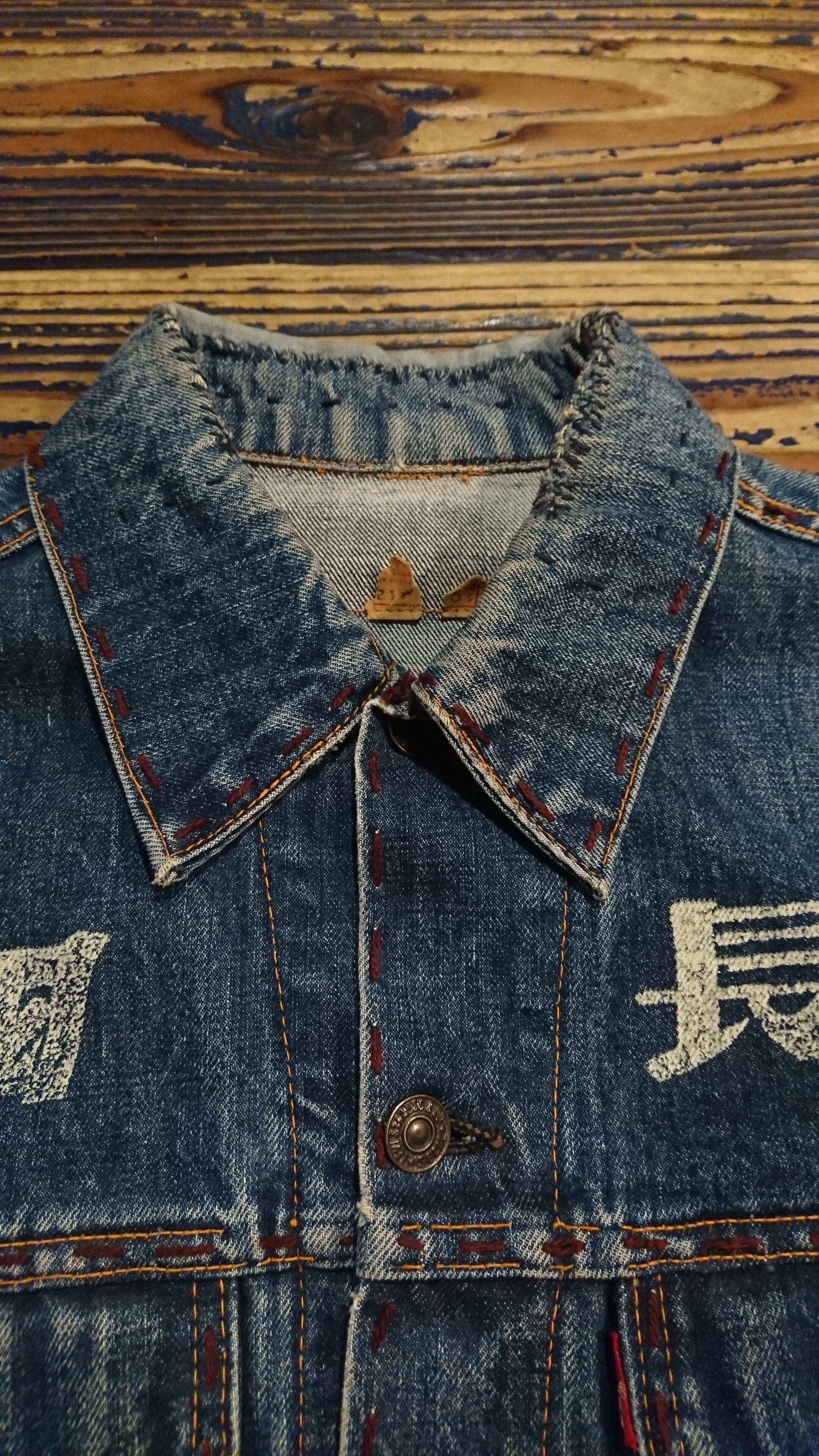 カスタムしたものでフロントには中國長城のプリント、ステッチワーク、背中にはインディアンフェイスの刺繍が入ります。色落ちも良く、襟もとや右袖のリペアも良い雰囲気。