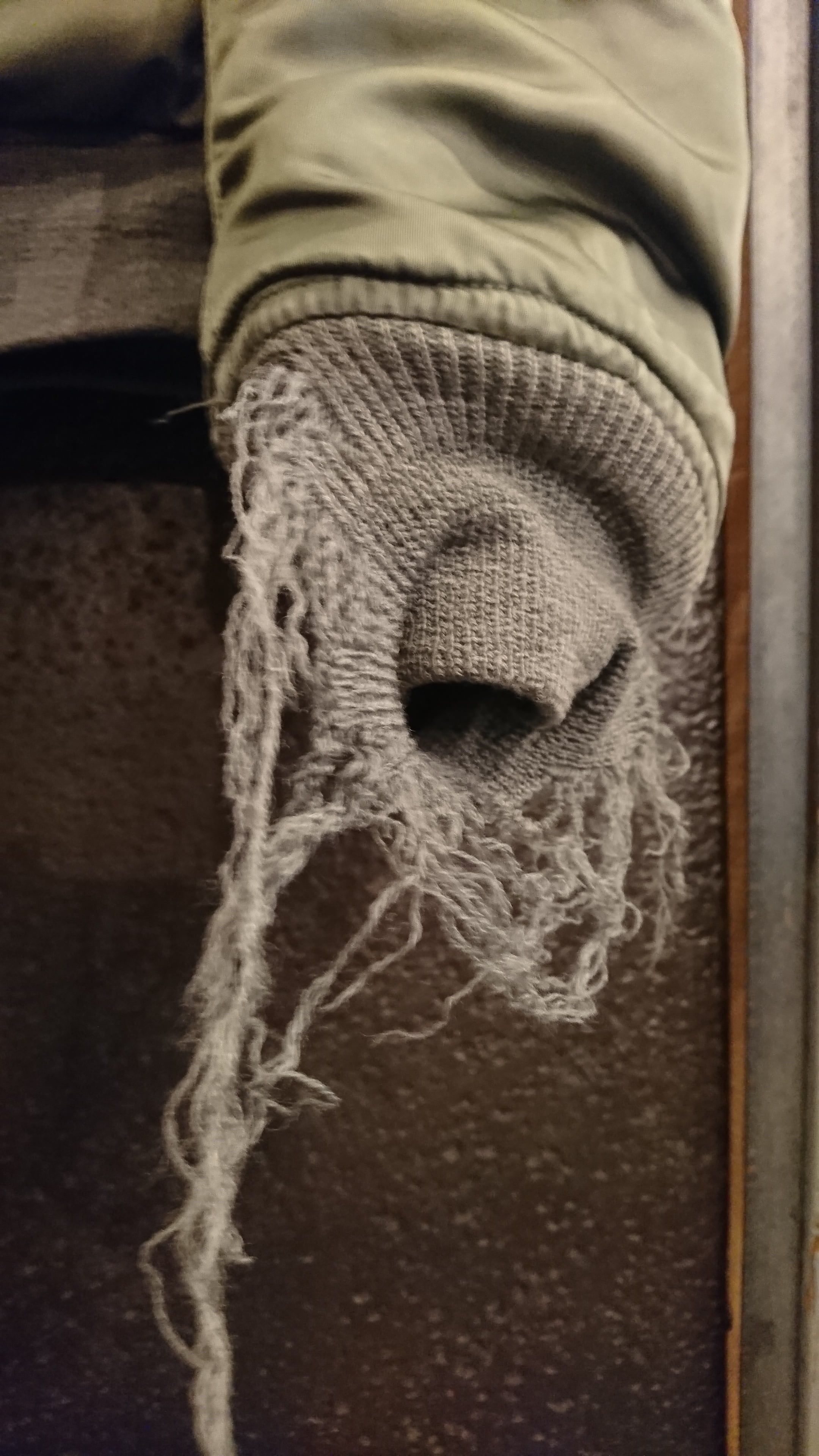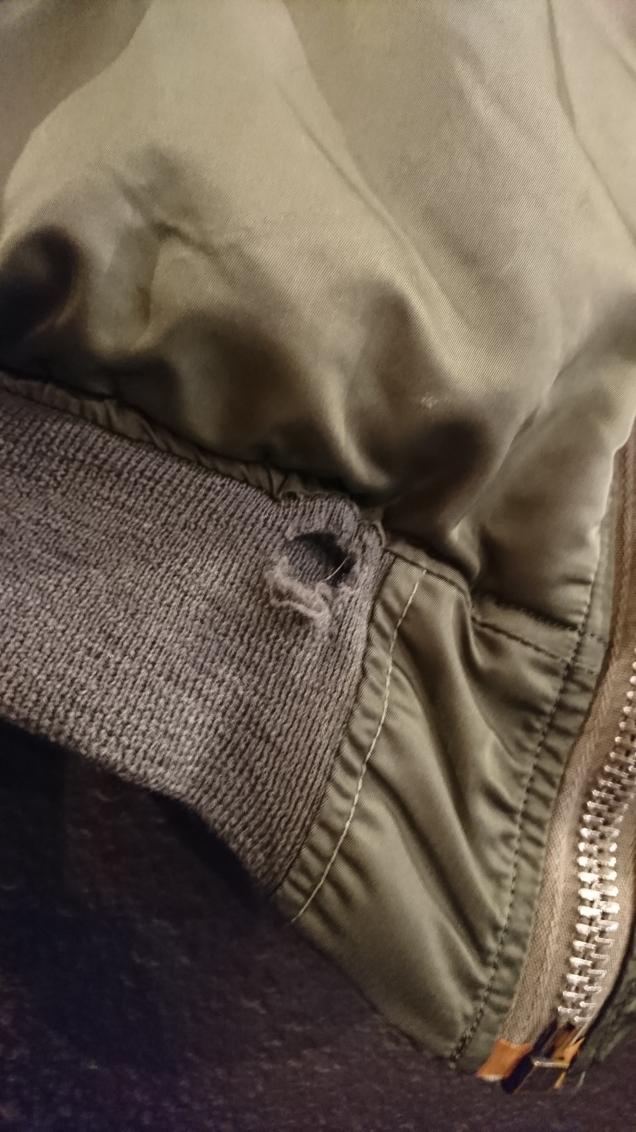 両袖リブにダメージがあってほつれやボロくなってますがそこが個人的にはプラス要素。右裾リブにもホールあり。裏のオレンジ面の首もと下に少し汚れあり。その他致命的な傷等は着用には問題はありません。