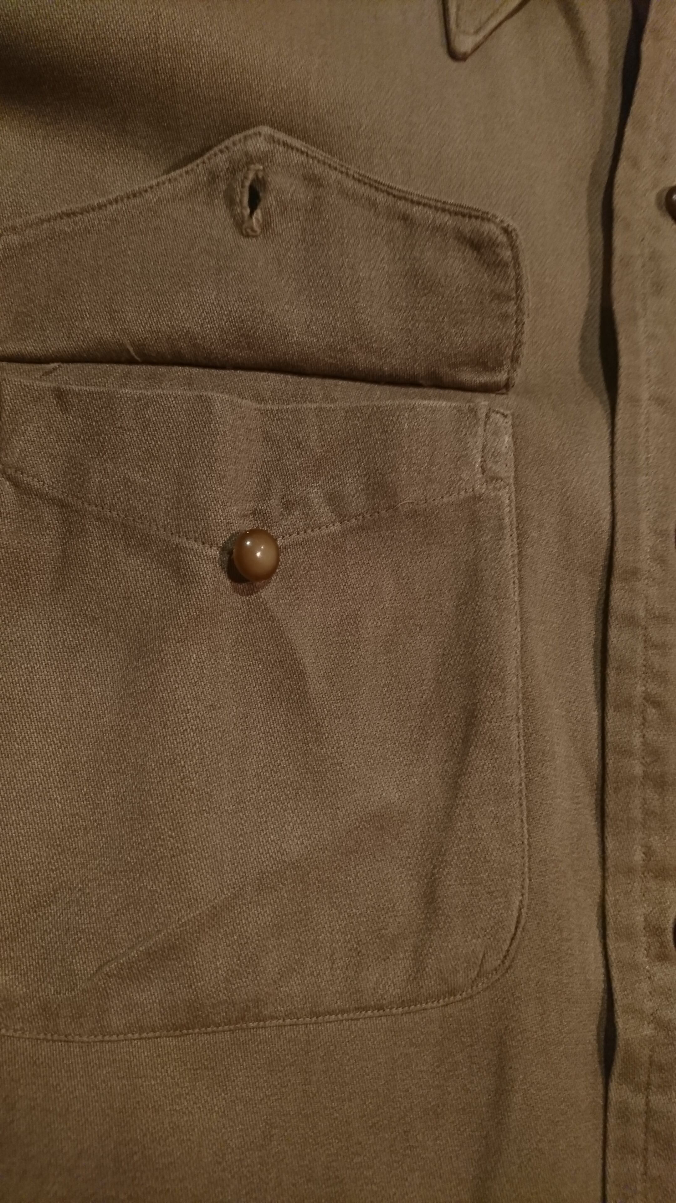 ままで着てたのであろう、まだ部分的に糊が残っています。ボタンはスナップではなく練りボタン。欠損なしで残っております。マチ付きタイプ。左マチ横辺りに小さな傷あり。