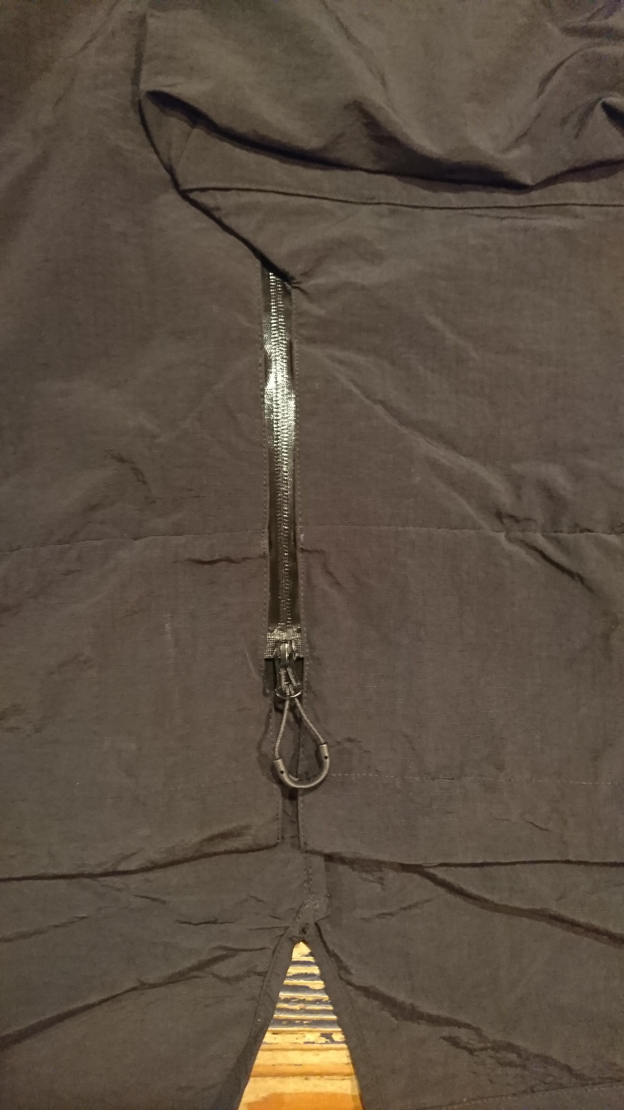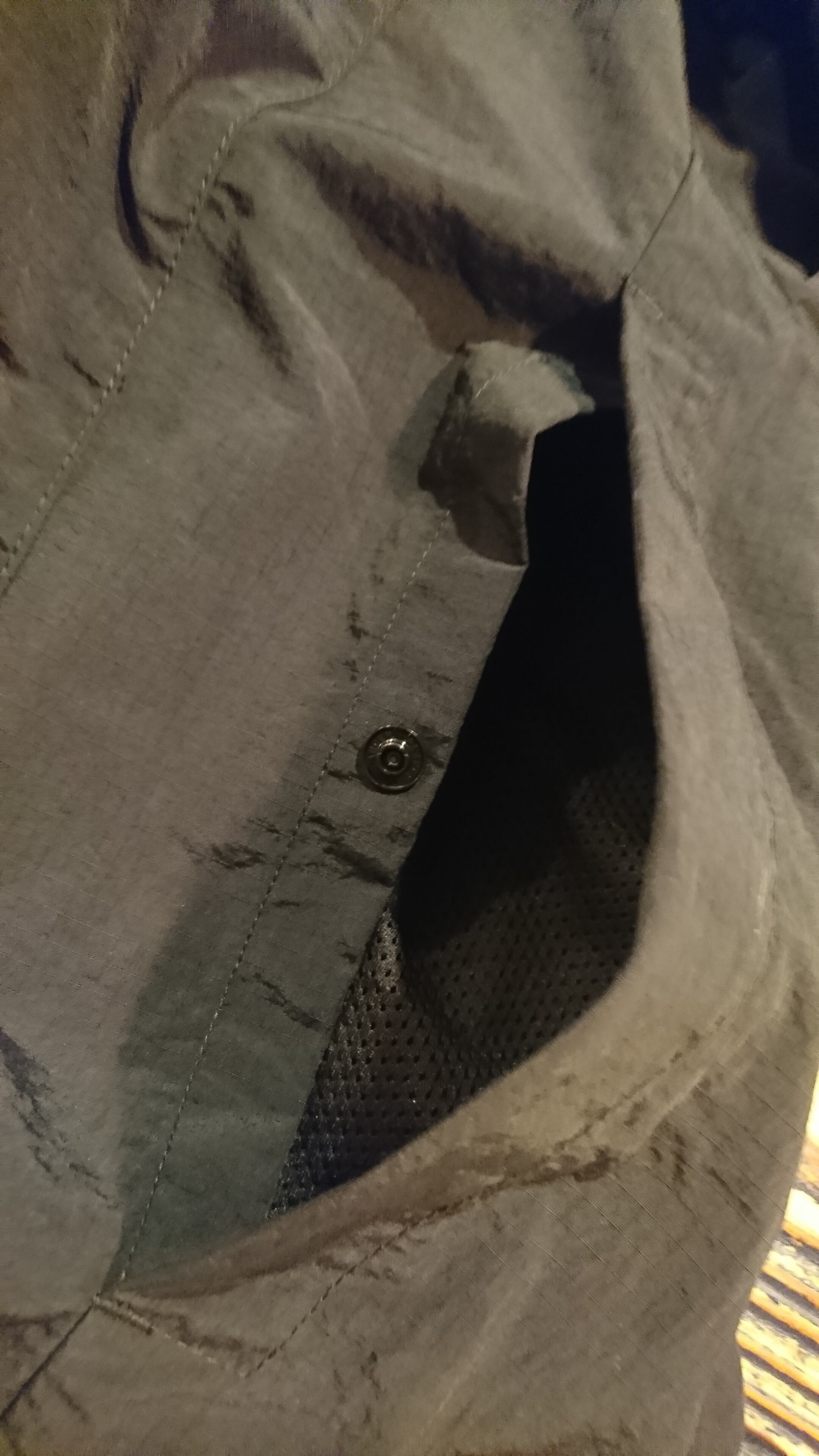 シワシワ撥水ナイロンで構成。大きい胸ポケットはサコッシュの様に使え、裏返してパッカブルとしても使用可能。襟部分にはフードが収納。