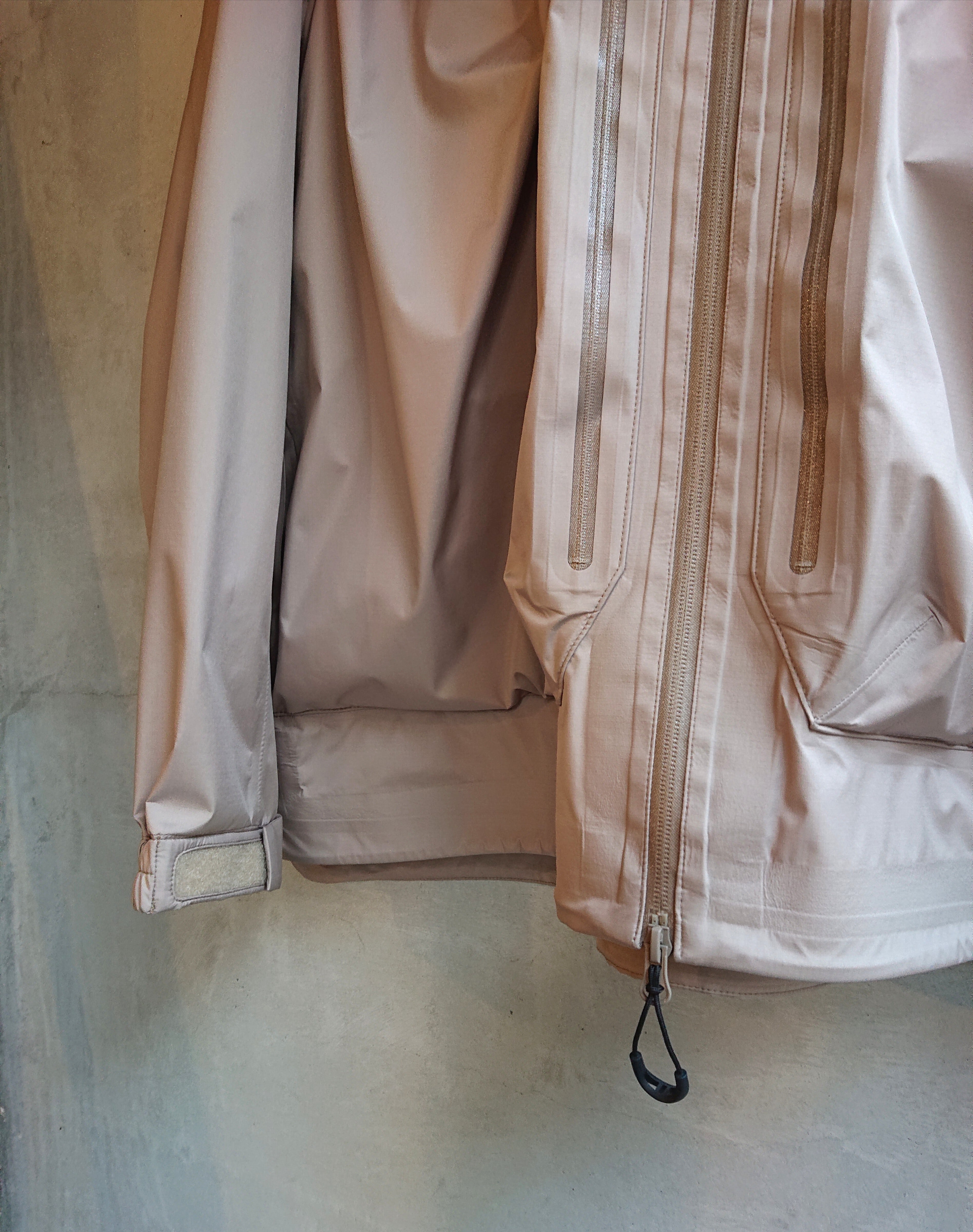 耐水20000、透湿20000のフルシームシェル。前面に大きな小物を整理できるポケットを配した。右胸と左ポケットですぐ出したいもの、大事に持っておきたいものでディテールを変えてある。