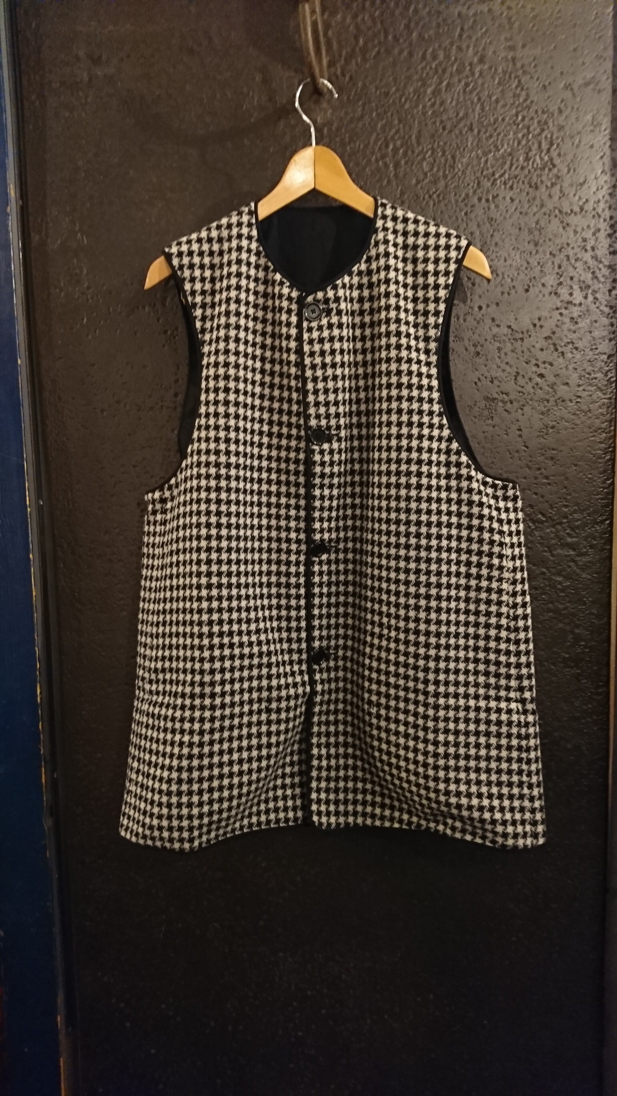 柄の大きさ、形状を最優先して上質なウール100%素材にて織って作成頂いたオリジナルの千鳥格子。デザインポイントとしてビッグシルエットで着丈も長く大きめサイズでアウターの上にも重ね着できる様なバランス感にて作成しました。