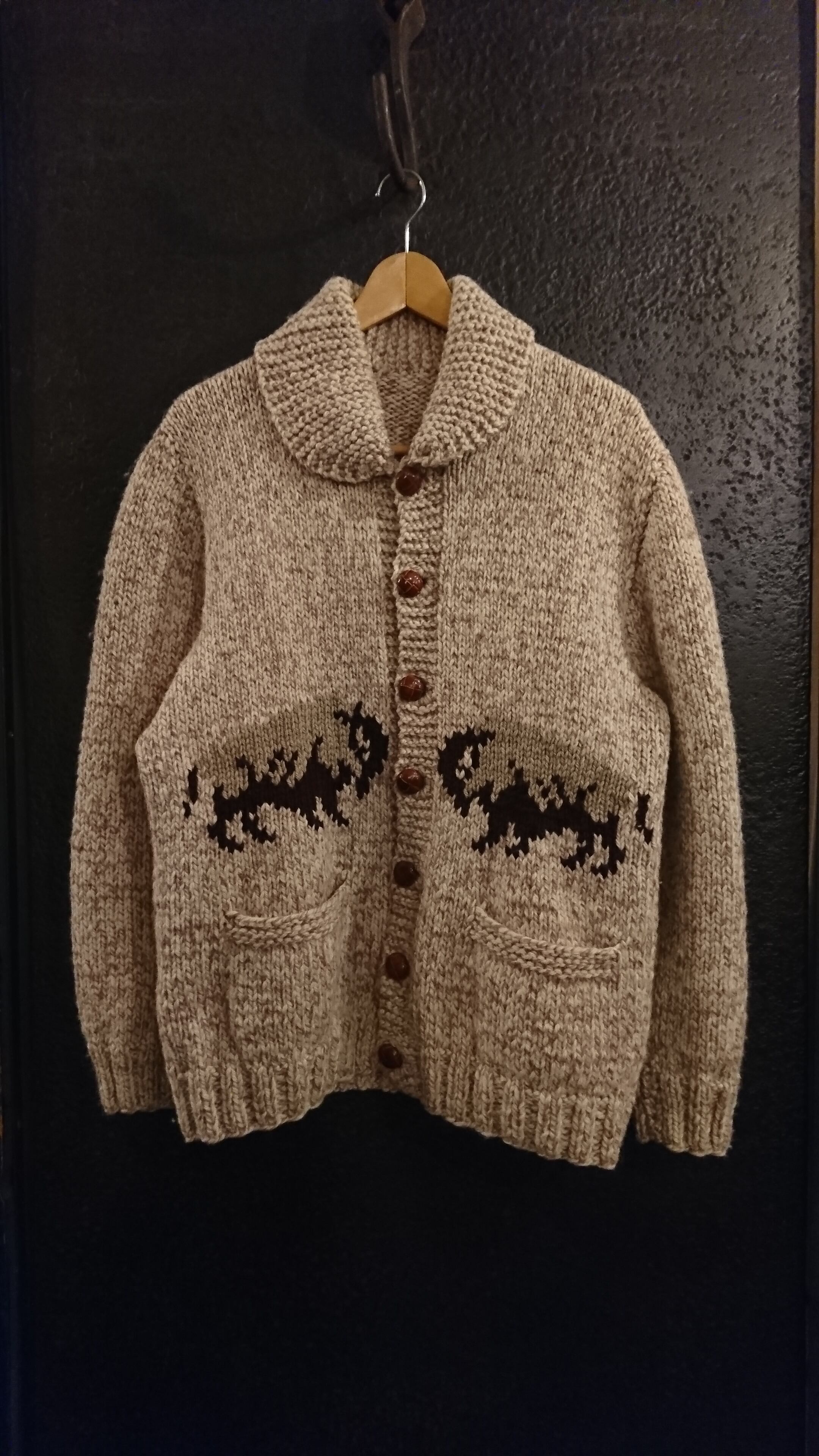 ヴィンテージ バッファロー柄のカウチンセーター。フロントはボタン仕様。胸元と背中に