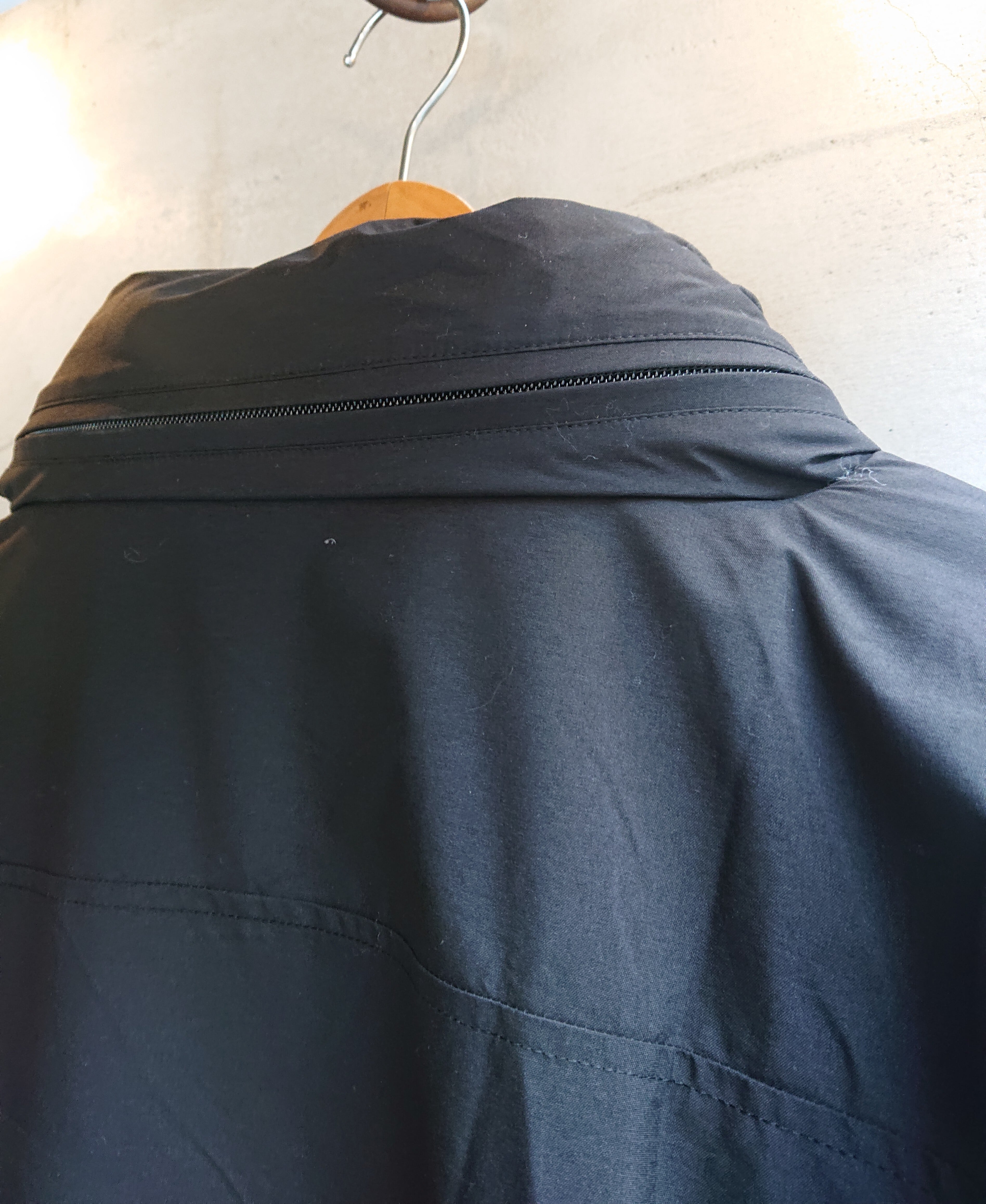 グローブを着用しながらも着脱ができる大きく配置されたベルクロの前立てや、ジッププル付きのダブルジップなど細部にまで機能性を考慮した仕様です。大きく首に沿うネック部分は中に分厚いアウターを着用した状態でも襟やフードを妨げないゆとりがあり、襟元のファスナーを開くと収納されたフードが出てきます。