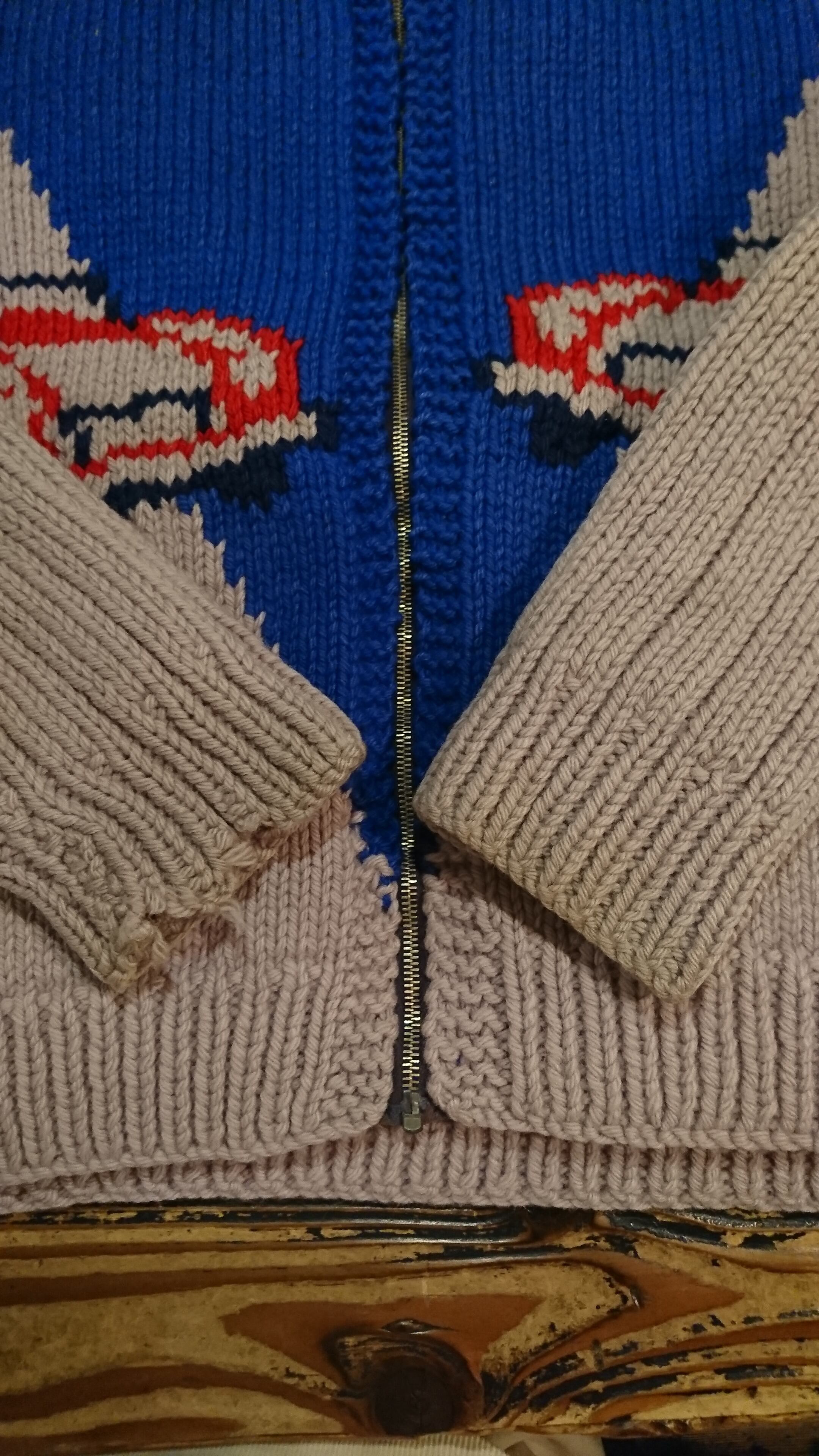 60年代 レーシングカー柄のカウチンセーターになります。裏地がネル生地のタイプ。