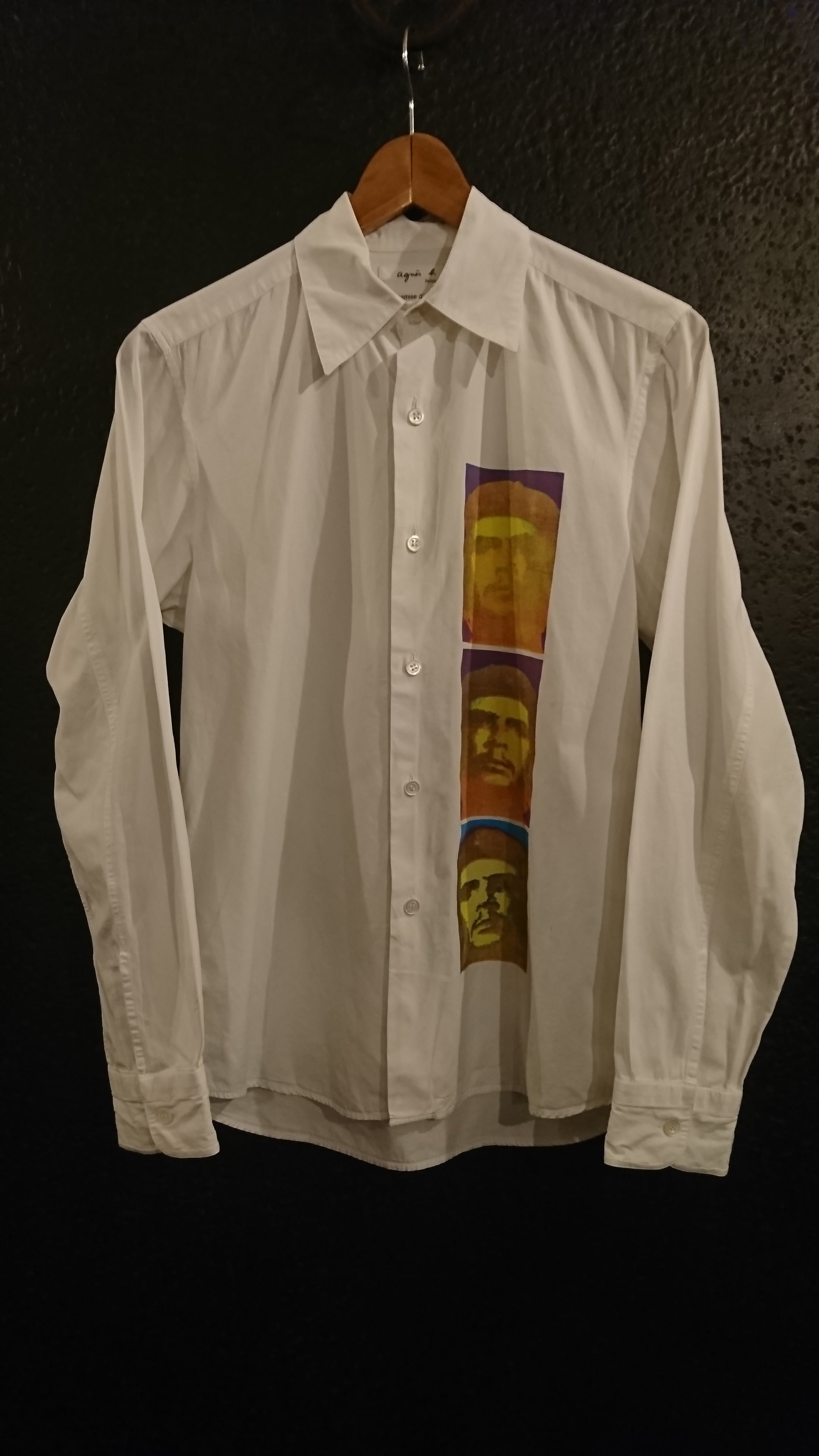 白シャツにアートなゲバラの顔が縦に並んだデザインシャツ。サイズが小さめなので男女共にオススメ。気になった方いかがでしょうか。