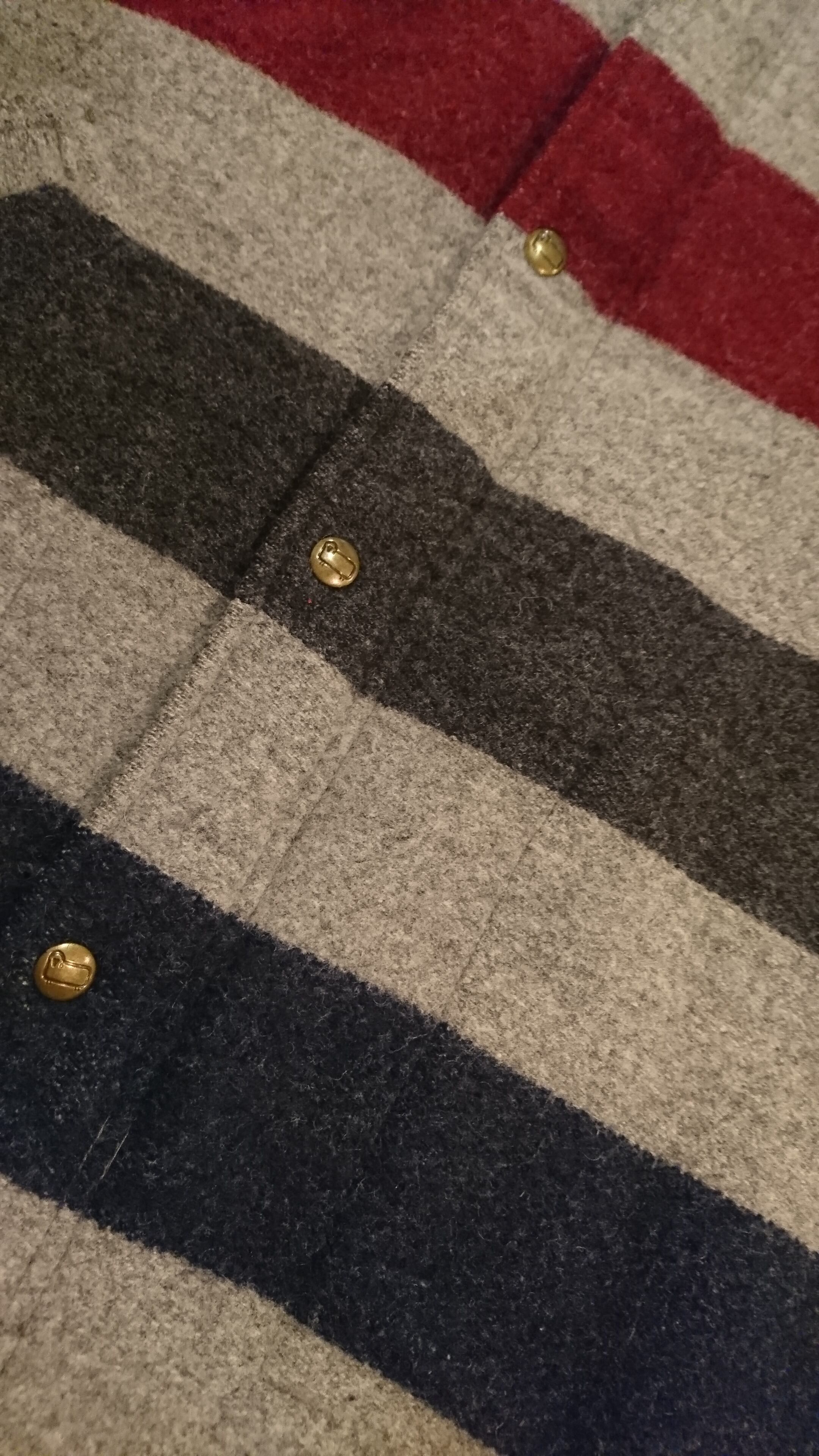 70年代 WOOLRICH ブランケットコートになります。フード付きで前後には3本、袖には1本ボーダーが入ります。サイズ表記が薄くて読みとれないですが実寸からしてM位かと。アウターとしても