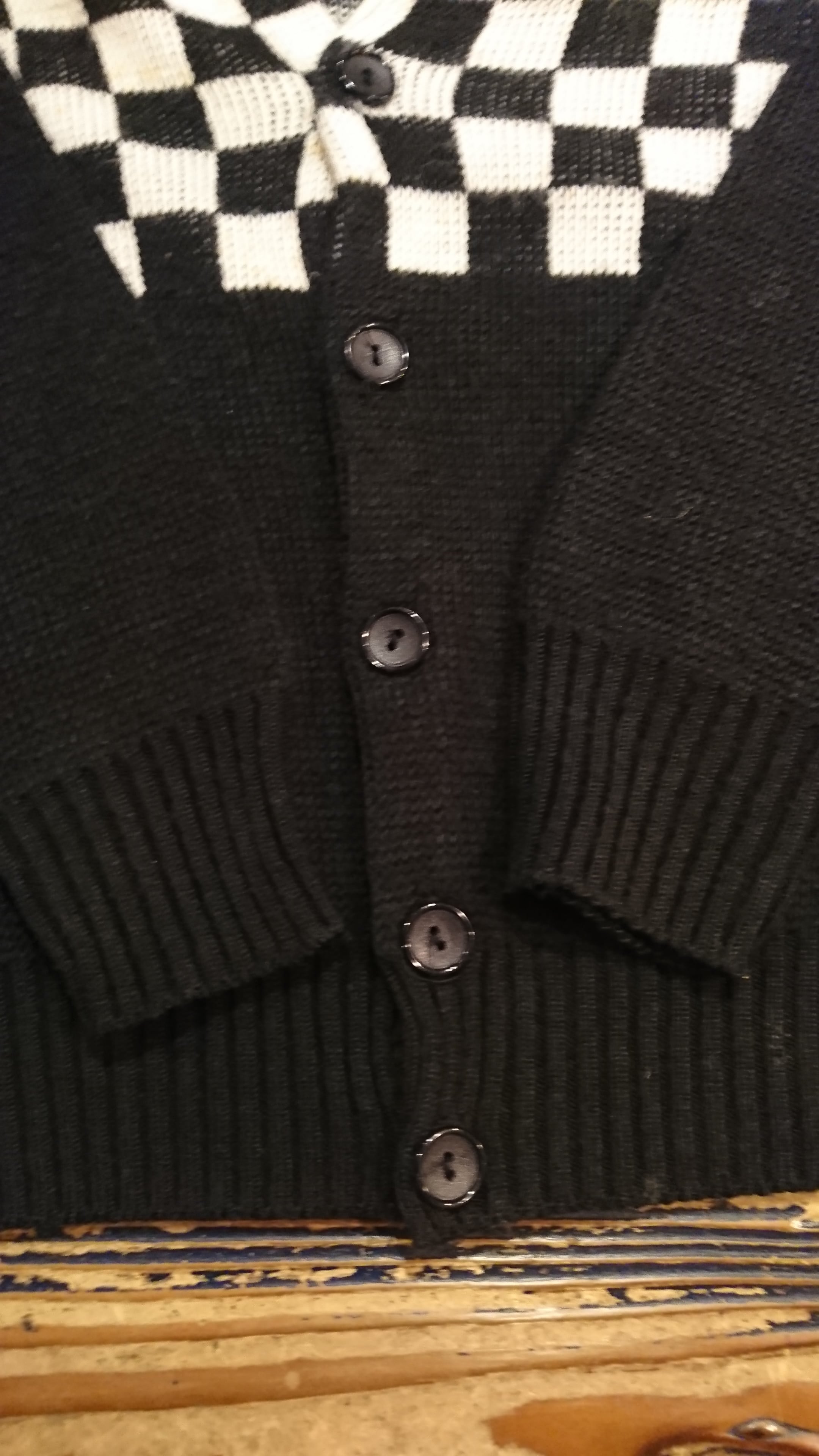 イギリス製チェッカーフラッグのカーディガンになります。胸元から背中、両腕に入るチェッカーフラッグ。黒×白の配色も男前。モードな雰囲気すら感じる1着です。素材はアクリル 100%。