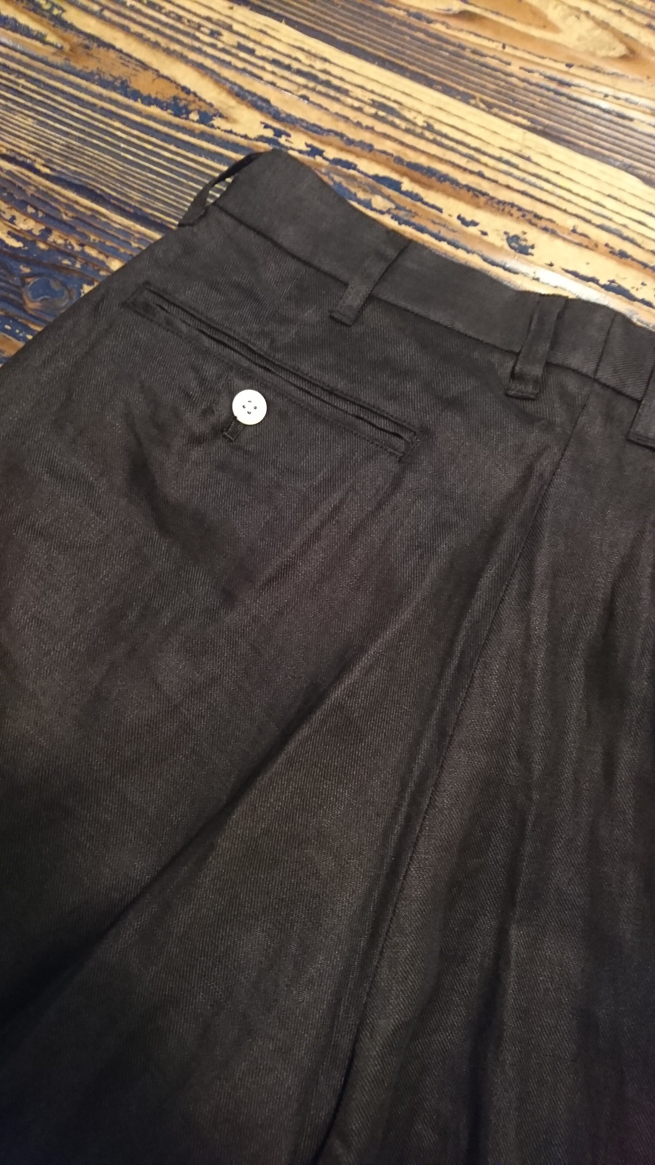 ツータックのスラックス。ゆとりある腿から裾にかけテーパードしたシルエット。フロントはボタンフライでスラックスとワークパンツを合わせたようなデザイン。