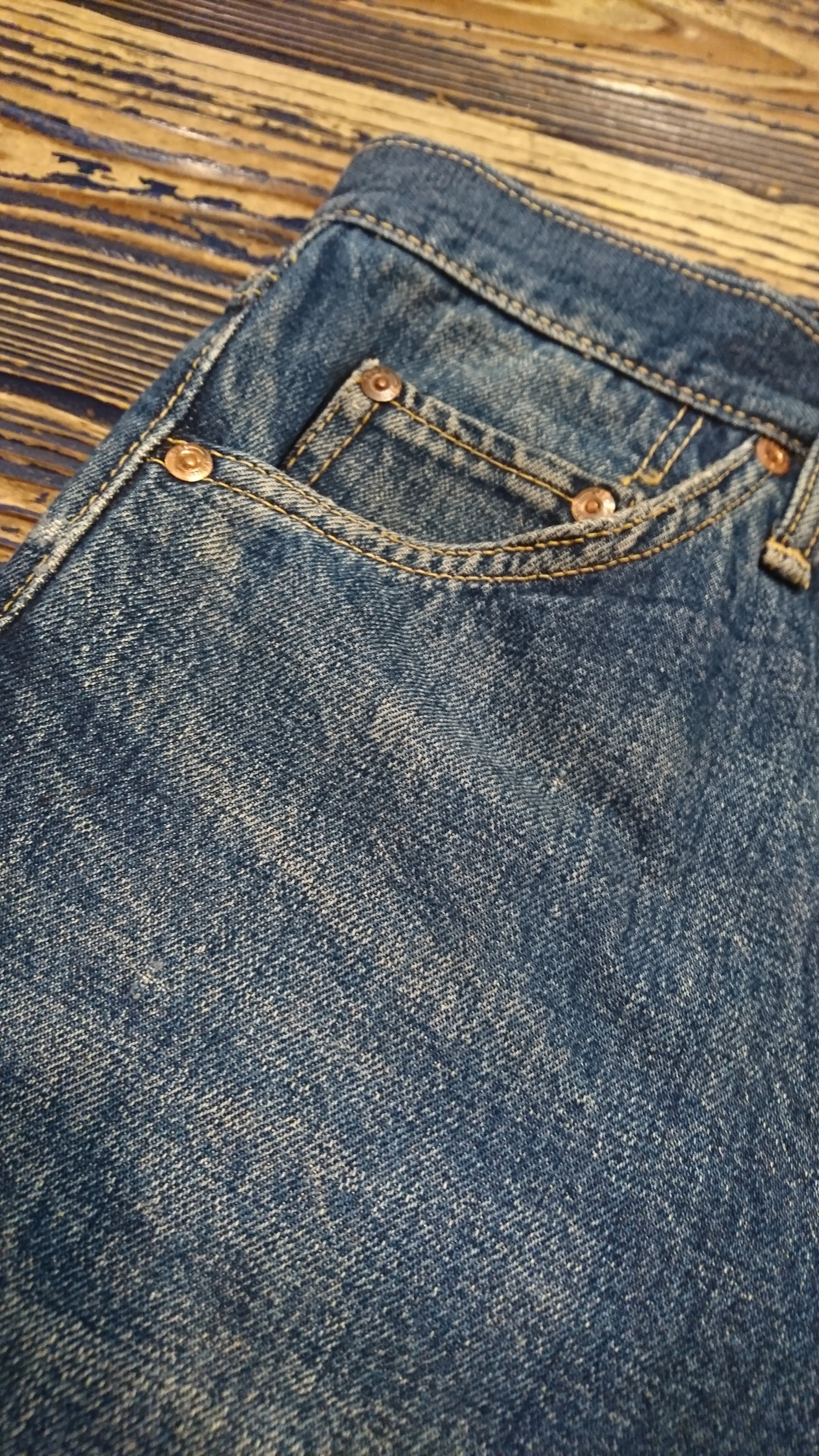 モデル。フロントはTALONジッパー。色落ちしたデニムの雰囲気も抜群。アメリカ ヴィンテージデニムの高騰。なかなか手が出せなくなってきてる昨今。ジャパンブランドのヴィンテージデニムを手にしてみませんか。かなりオススメです。