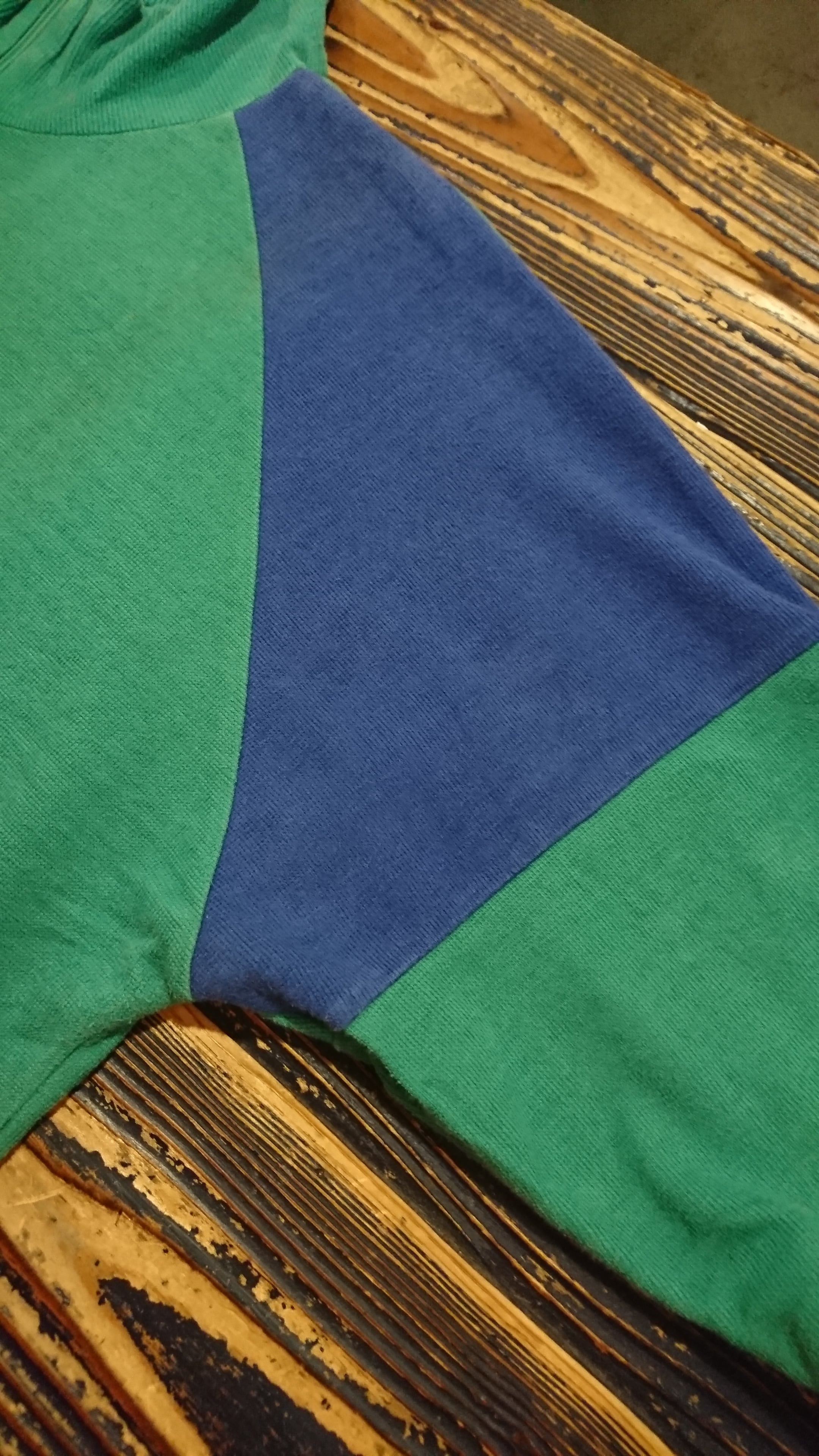 首回りから斜めに縫い付けられたラグランスリーブ。ラグランに沿って淡いブルーの切り替えに、エッジの効いたデザインは性別を問わず着ていただけ、着映えする個性的なプルオーバーです。
