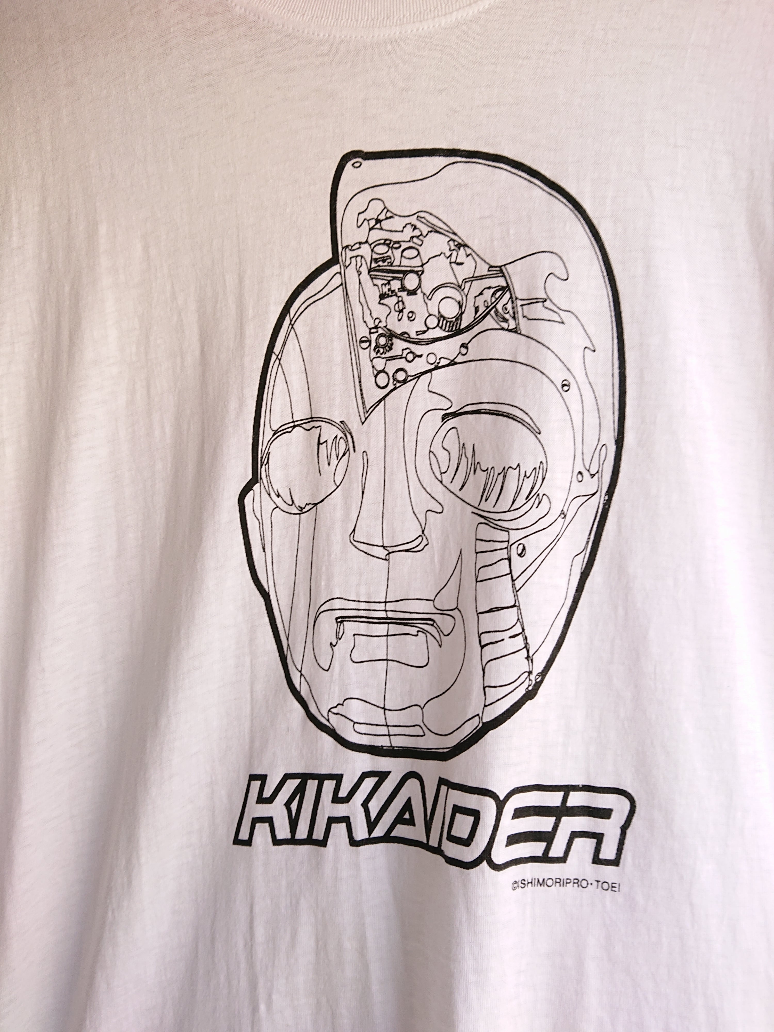 人造人間キカイダーは1972年放送で翌年キカイダー01が登場します。 ホワイトボディにキカイダーの顔のブラックプリント。シンプルで格好良い1着。こちらのキカイダーTシャツは1990年後半にリリースされた、 バンダイによる特撮系クレーンゲームの景品だったものになります。