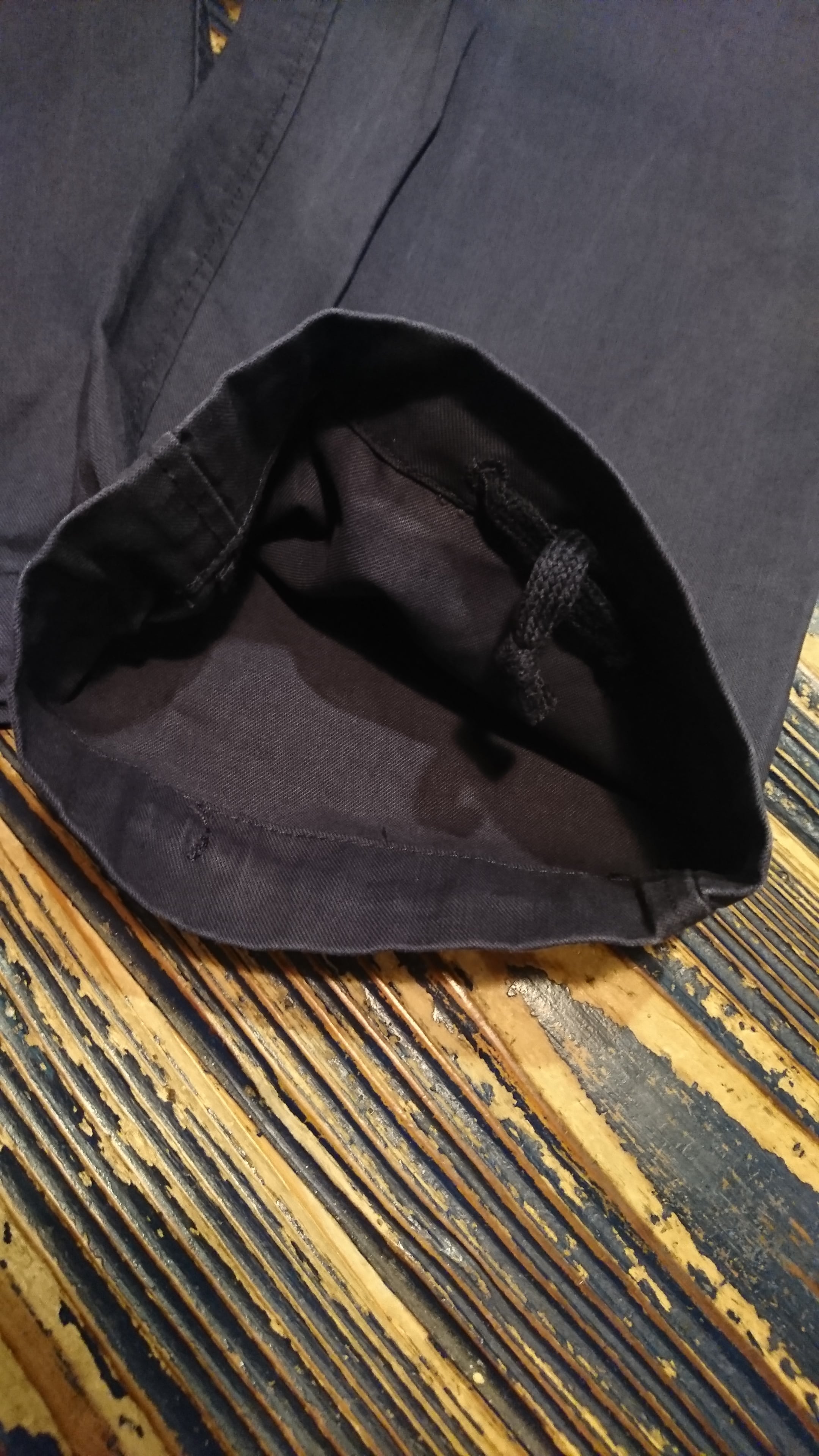 ウエスト部分にはボタンループによるサイズ調整可能なアジャスター付き。裾にはドローコード。