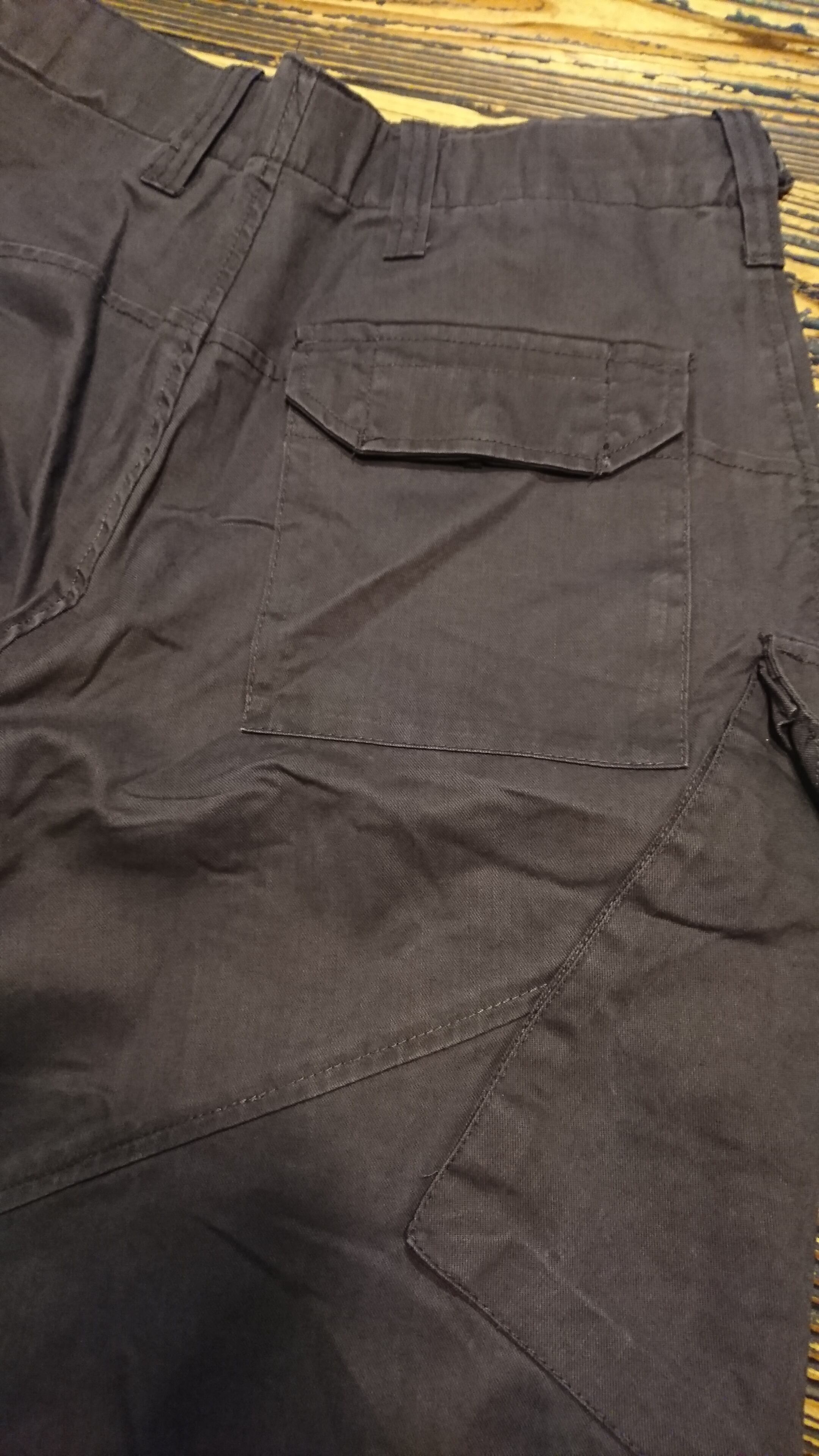 フロントの両サイドとヒップの右側片方だけにフラップつきポケットが装着。膝周りのカーゴポケットは斜めのデザインで付けられていて見た目の
