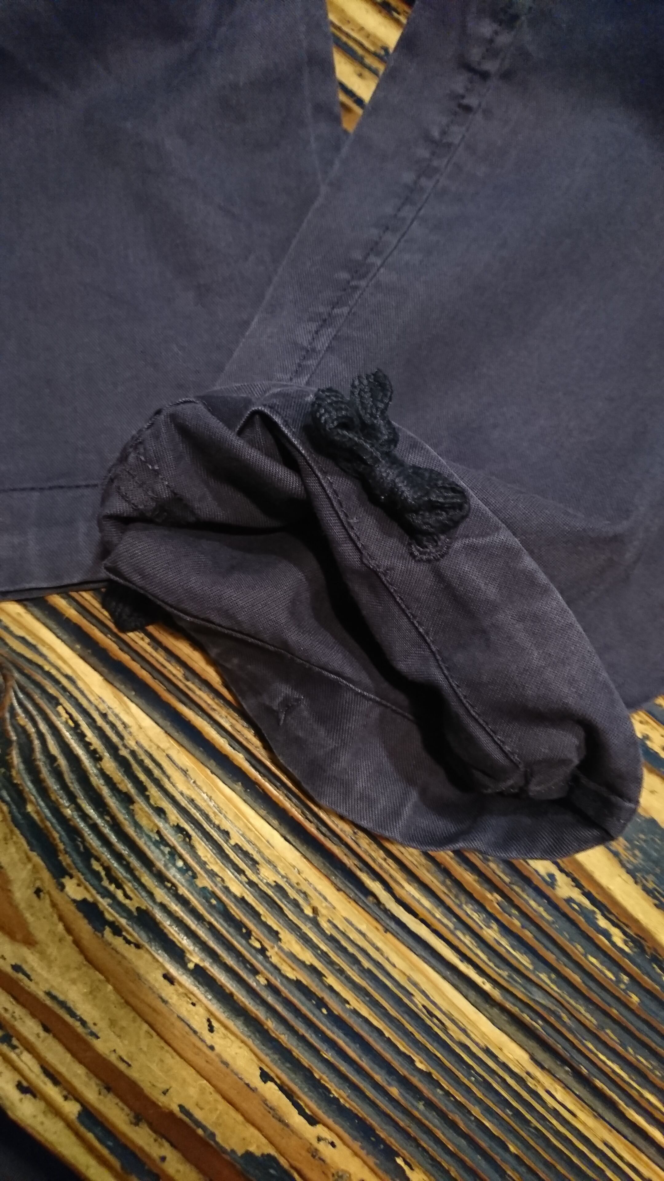 ウエスト部分にはボタンループによるサイズ調整可能なアジャスター付き。裾にはドローコード。