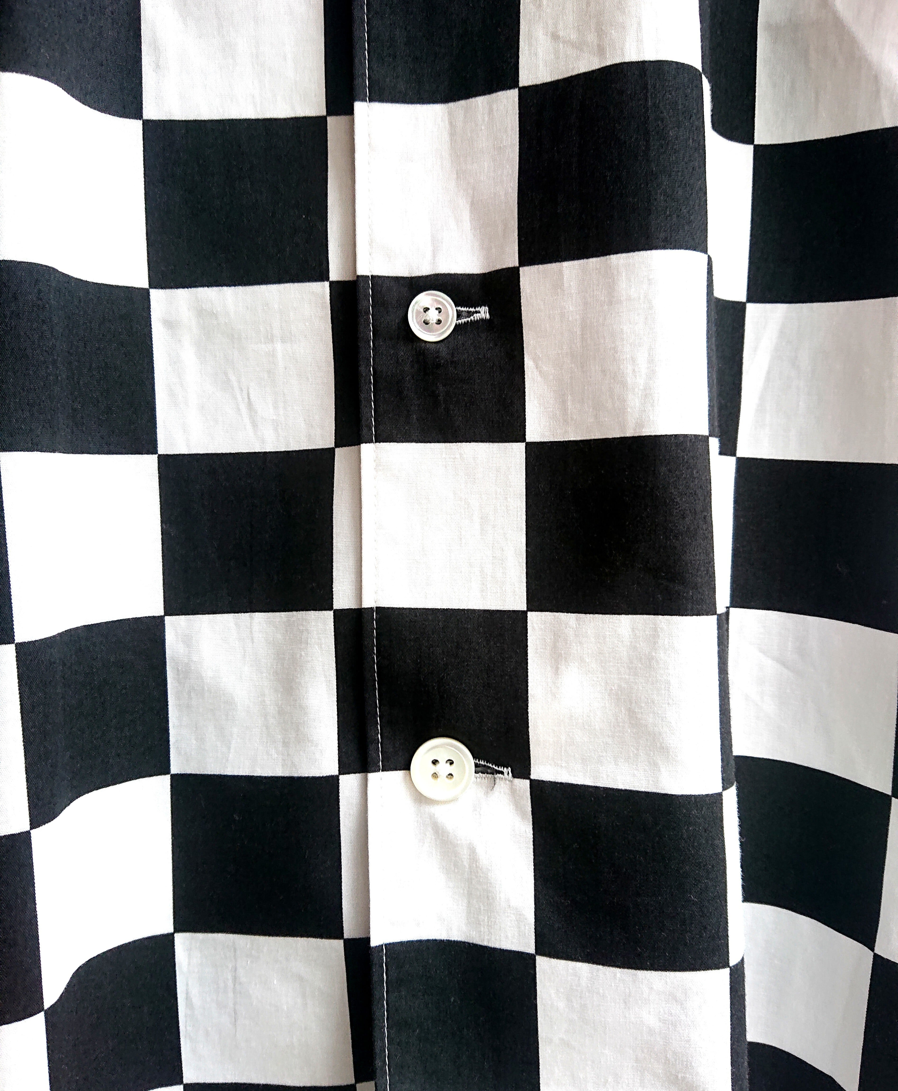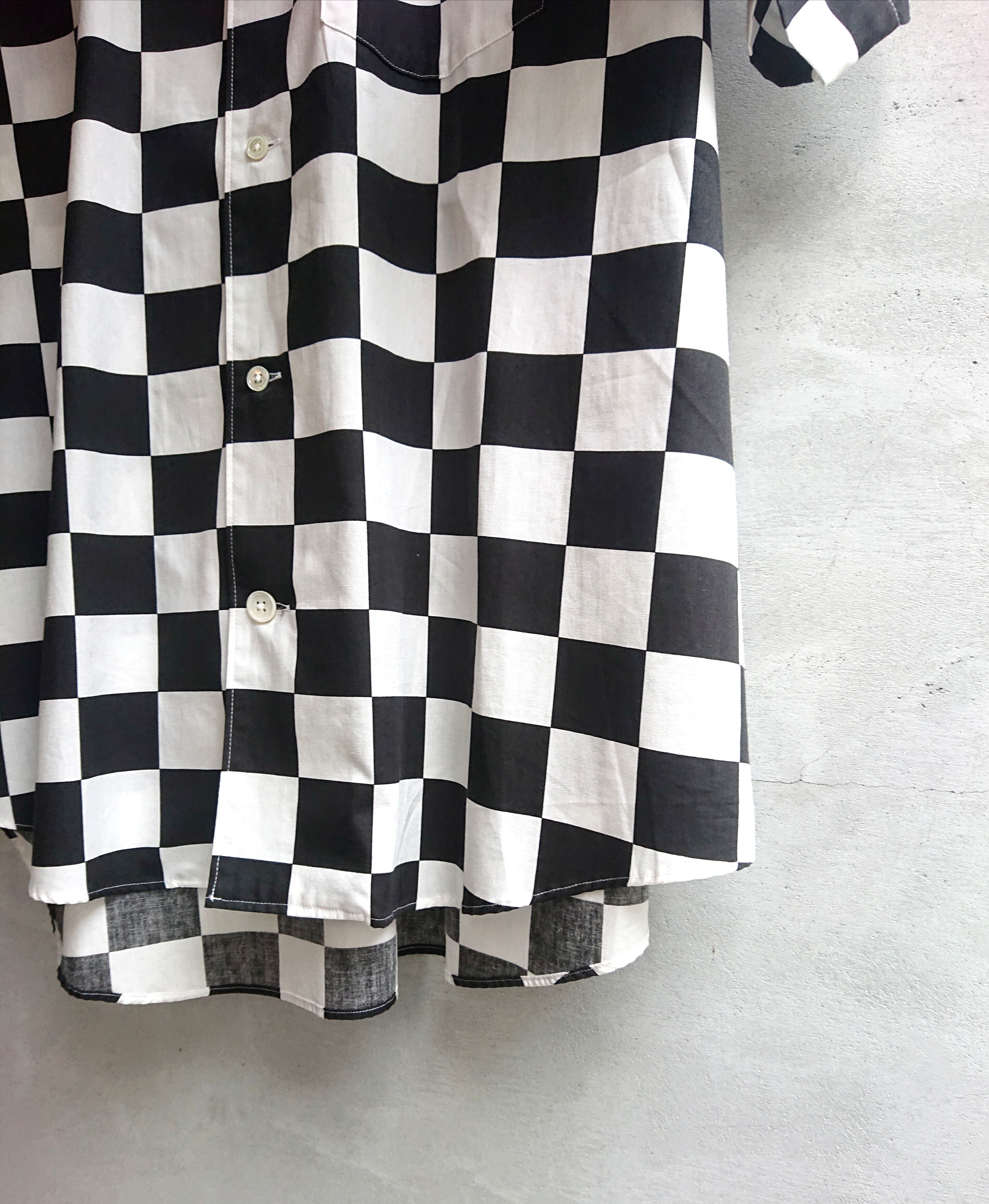 少し大きめなサイズ感で着用時にゆったりしたシルエットになる様に製作。拘りとしてオープンカラーの場合、通常裾のディティールはストレートなのですが、あえてゆるいラウンド仕様にして着丈も少し長めに設定。フロント前開ききボタンを13mmを使用しましたが最下ボタンのみ15mmボタンを使用させて頂き良い違和感が出してます。