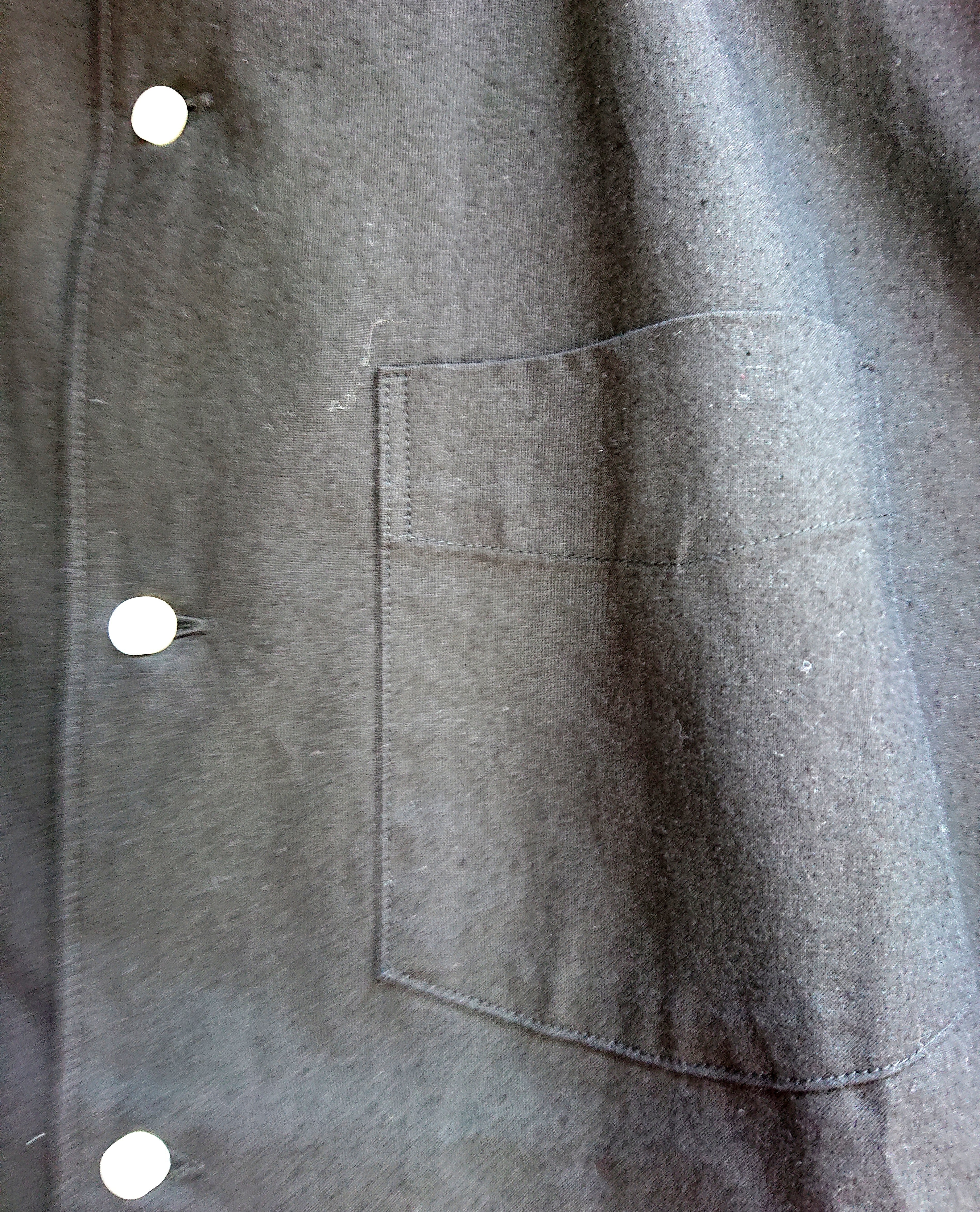 加えて前見返しと地衿にジグザクの飾りステッチを入れ、古い時代の芯地を止め付ける仕様を現代的にディティールとして復活?させて落とし込んだデザイン。COTTON 90% LINEN 10%でシャツ生地としてはしっかりした素材。