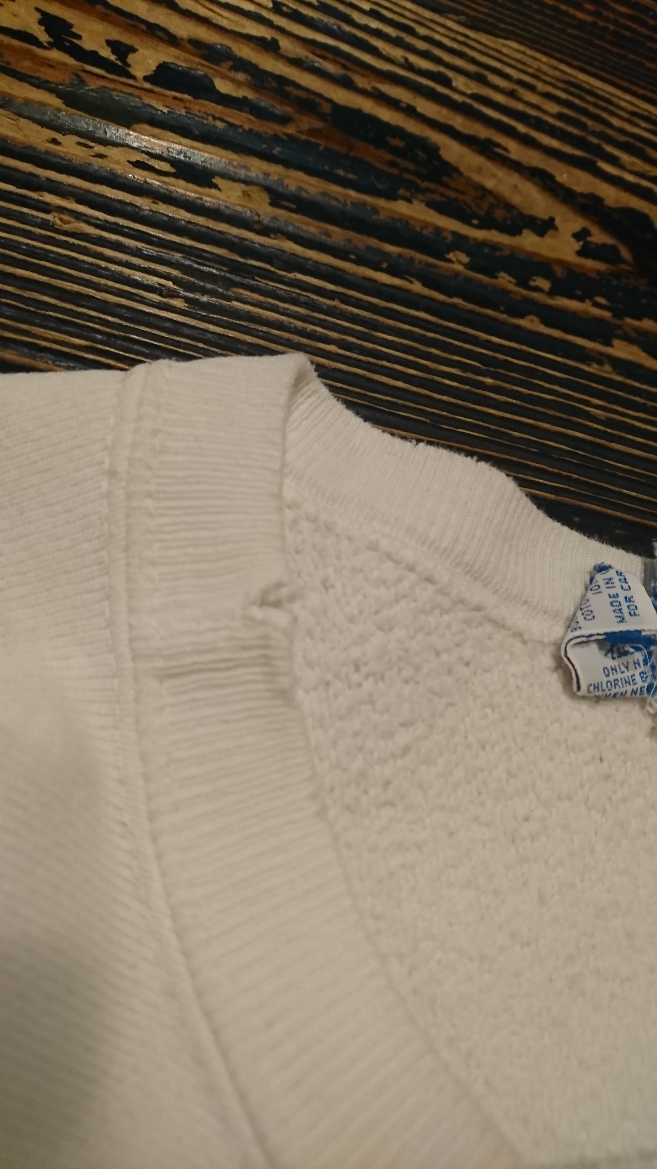 ホワイトカラーのプリント無し。タグが割けてるのとネック、両腕に小さな傷、数ヵ所小さな汚れもありますが着用に問題はありません。