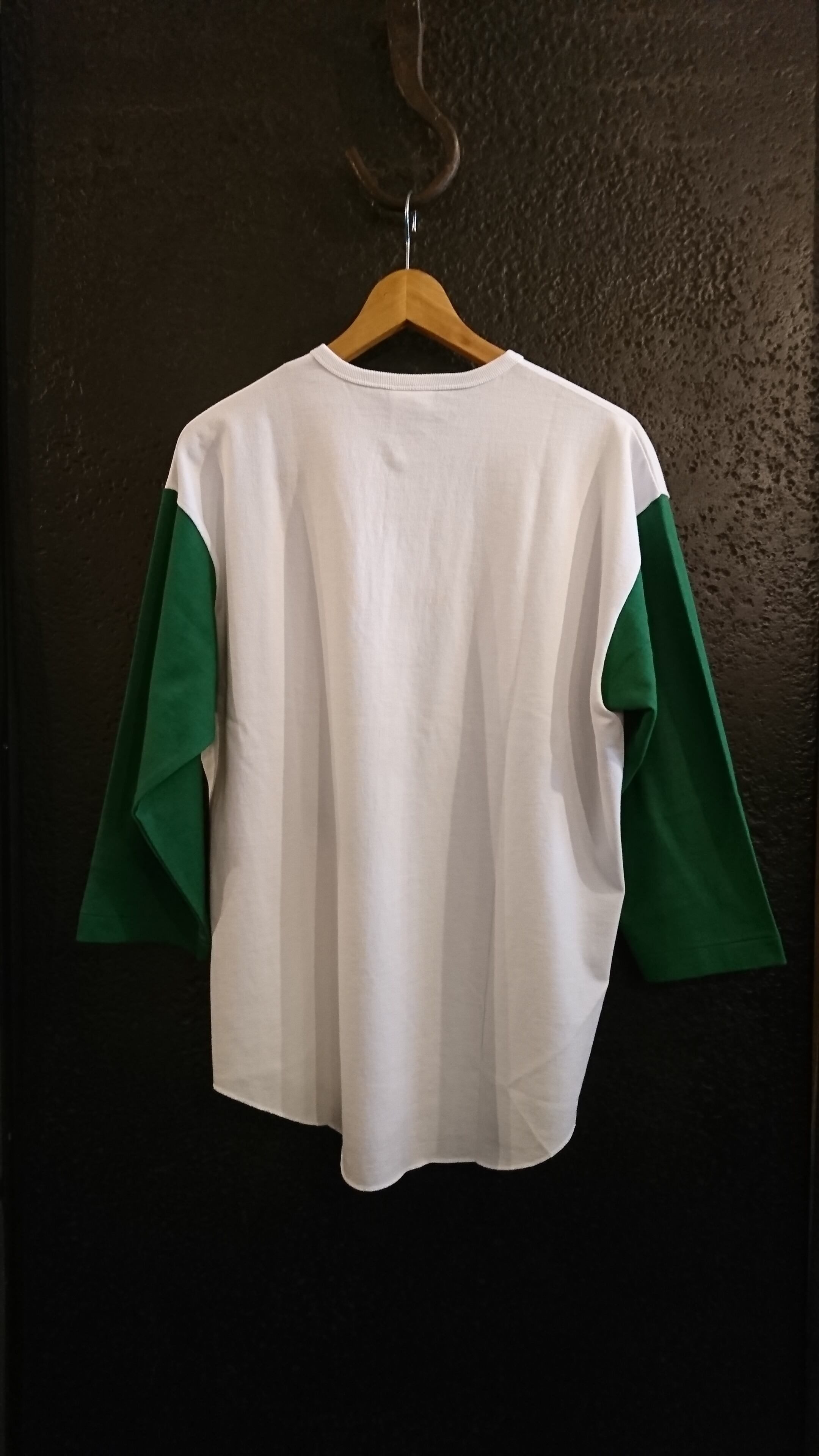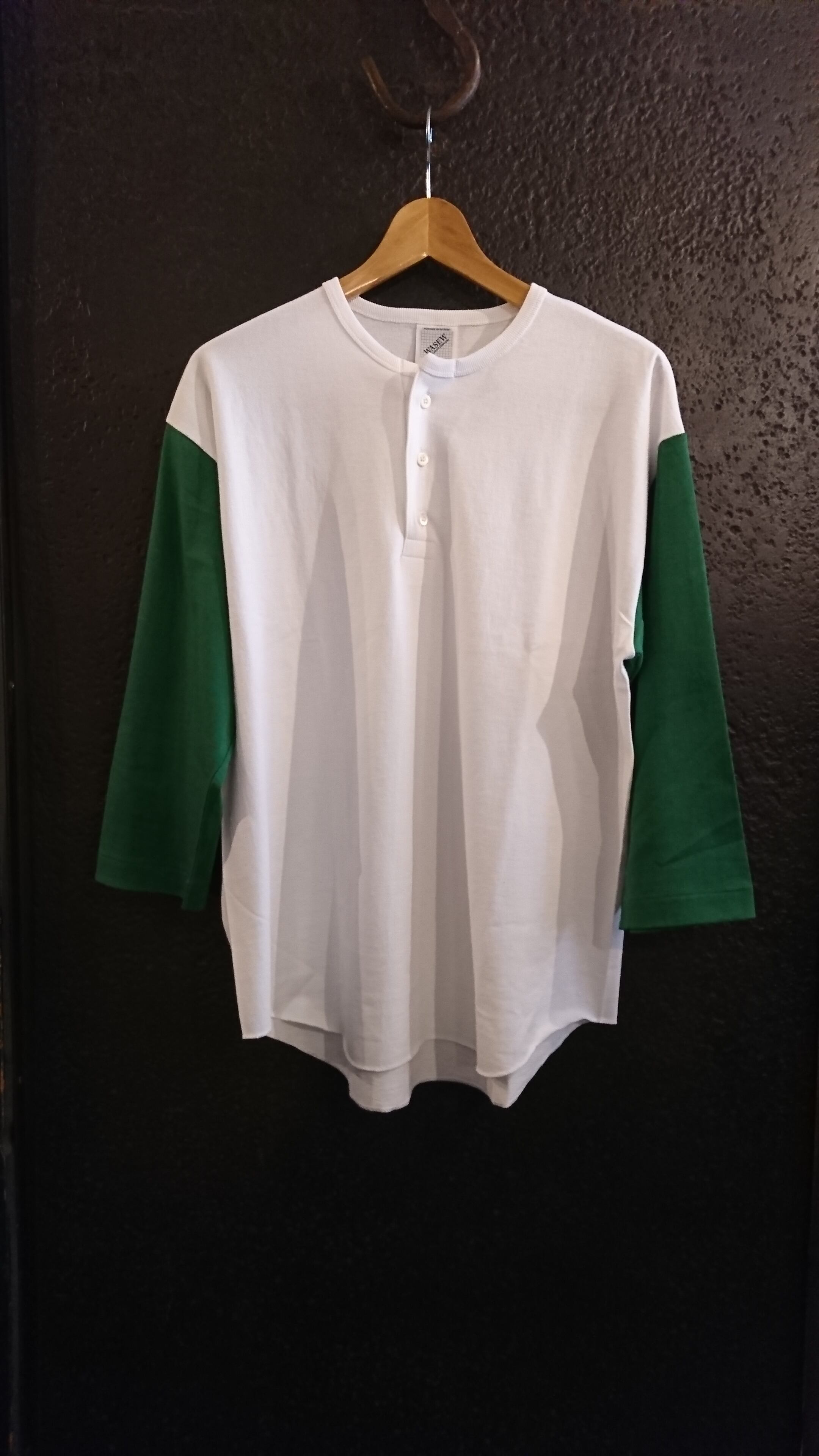 70sのフットボールTをサンプリング。首元の細幅のバインダーヘンリーネック仕様などディテールや縫製は忠実に再現しながらも、WASEW独自のアップデートを加えています。身幅や肩幅は程よくルーズに設定し、生地は度詰めで腰のあるしっかりとしたWASEWオリジナル丸胴天竺を使用。しっかりとした生地感でアメリカのタフな印象を与えるため、オープンエンドの糸を使ってザラ感とドライ感をプラス。袖はネイビー、グリーン、イエローの3色展開にしています。