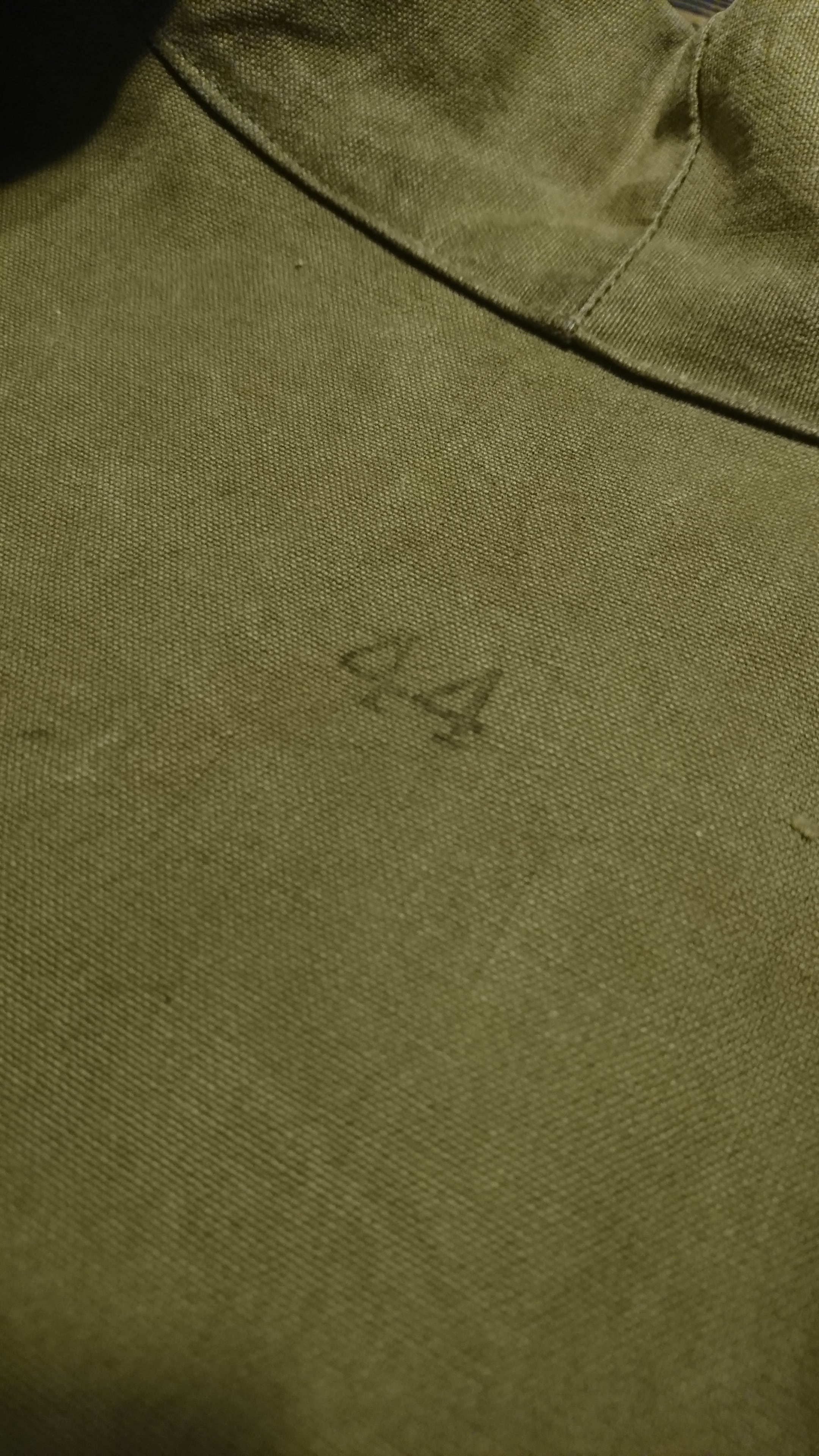 ブランドタグは無く、サイズも44とプリントされています。左胸にBROWNと落書きがされており、全体的に色褪せし汚れもありますがそこが男前。