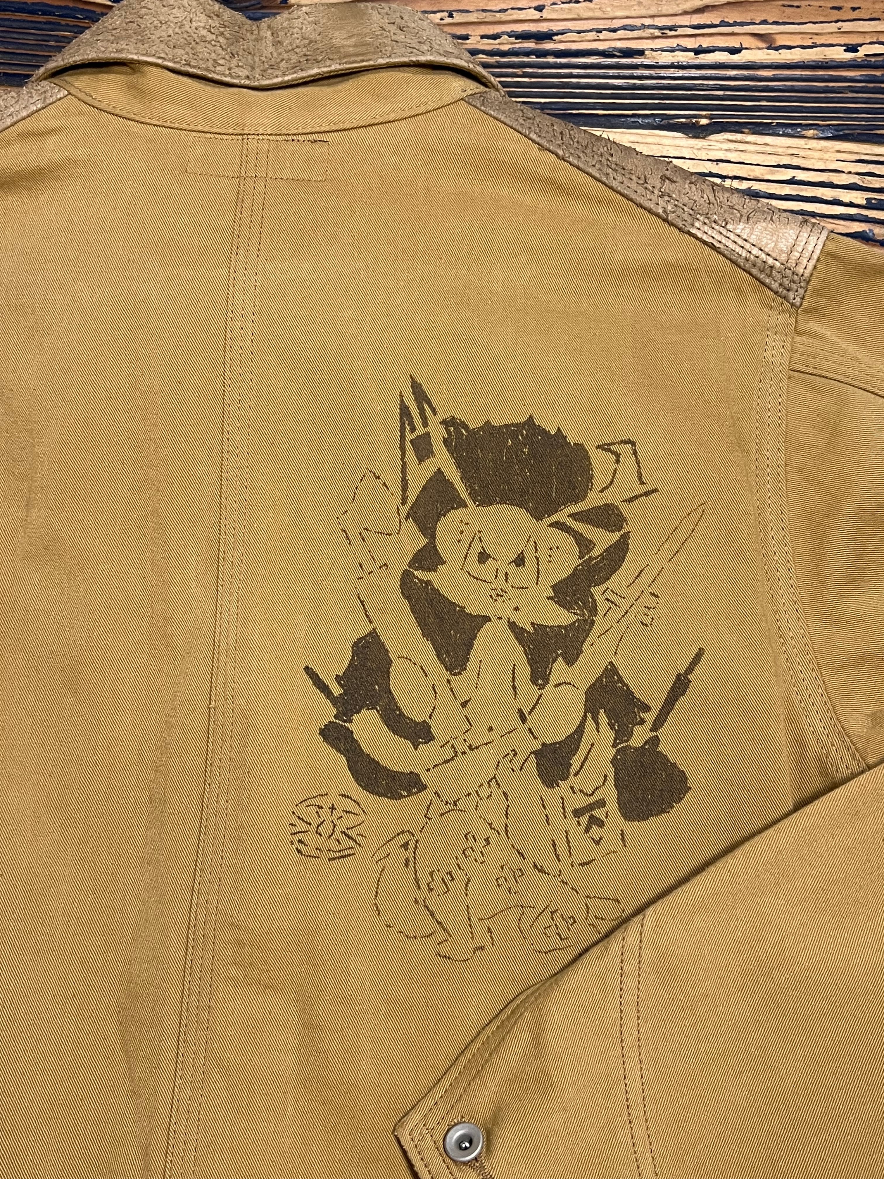 個人的にも懐かしいこの作品、FEE時代に私が、デザインさせて頂きリリースしたカバーオール。ディアスキンとコットンツイルの2種類の素材を掛け合わせ、ヴィンテージからトレースしたキャラクターをプリント致しました。発売当初は、定価7〜80000のプライスだったと記憶しております。1着のみ倉庫で保管しておりました個体を販売致します。