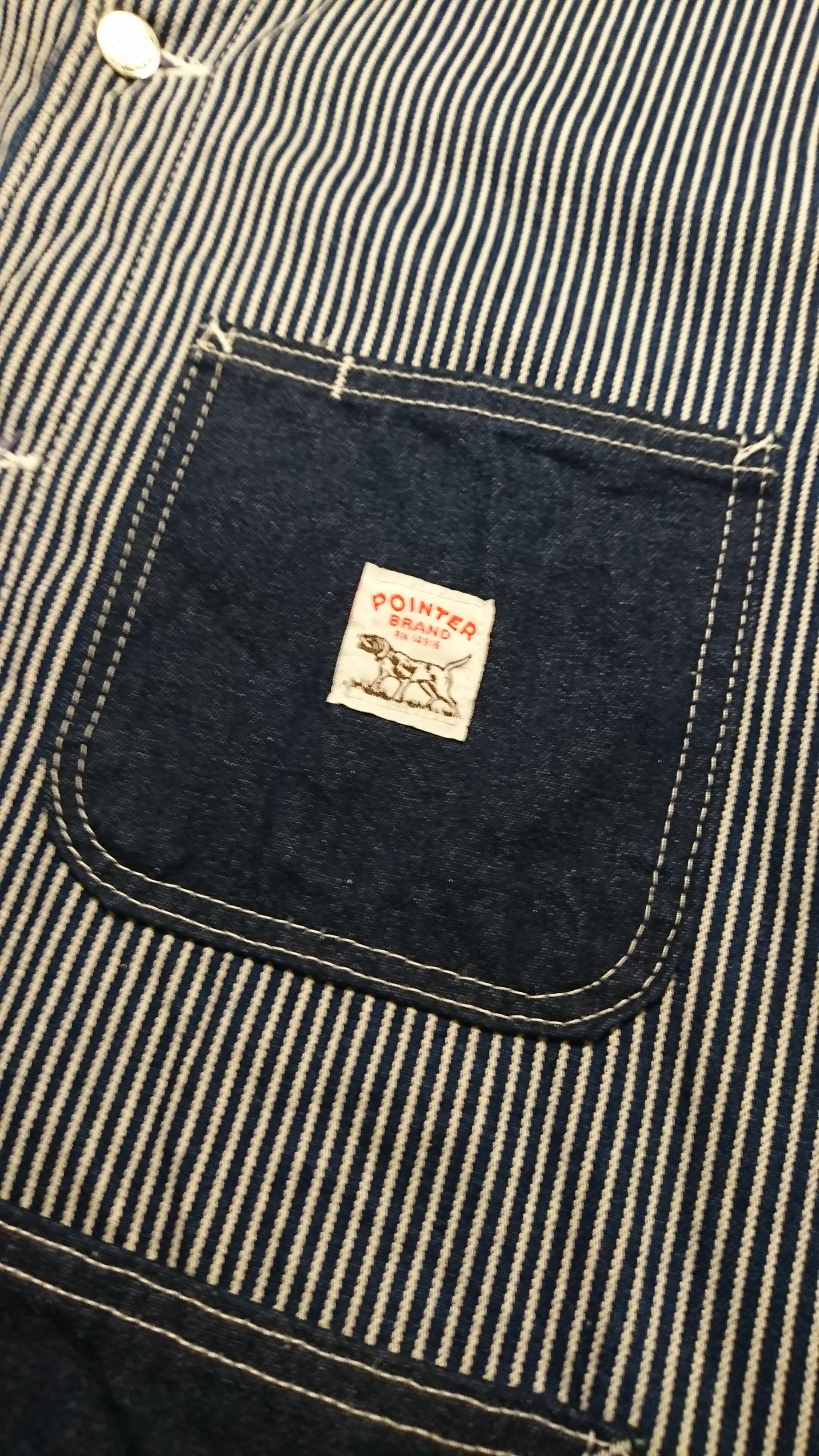 90年代 POINTER BRANDのデニムカバーオールになります。ヒッコリーとデニムの切り替えになったタイプになります。襟、ポケット、袖口がデニム。全体的にコンディションも良い1着。