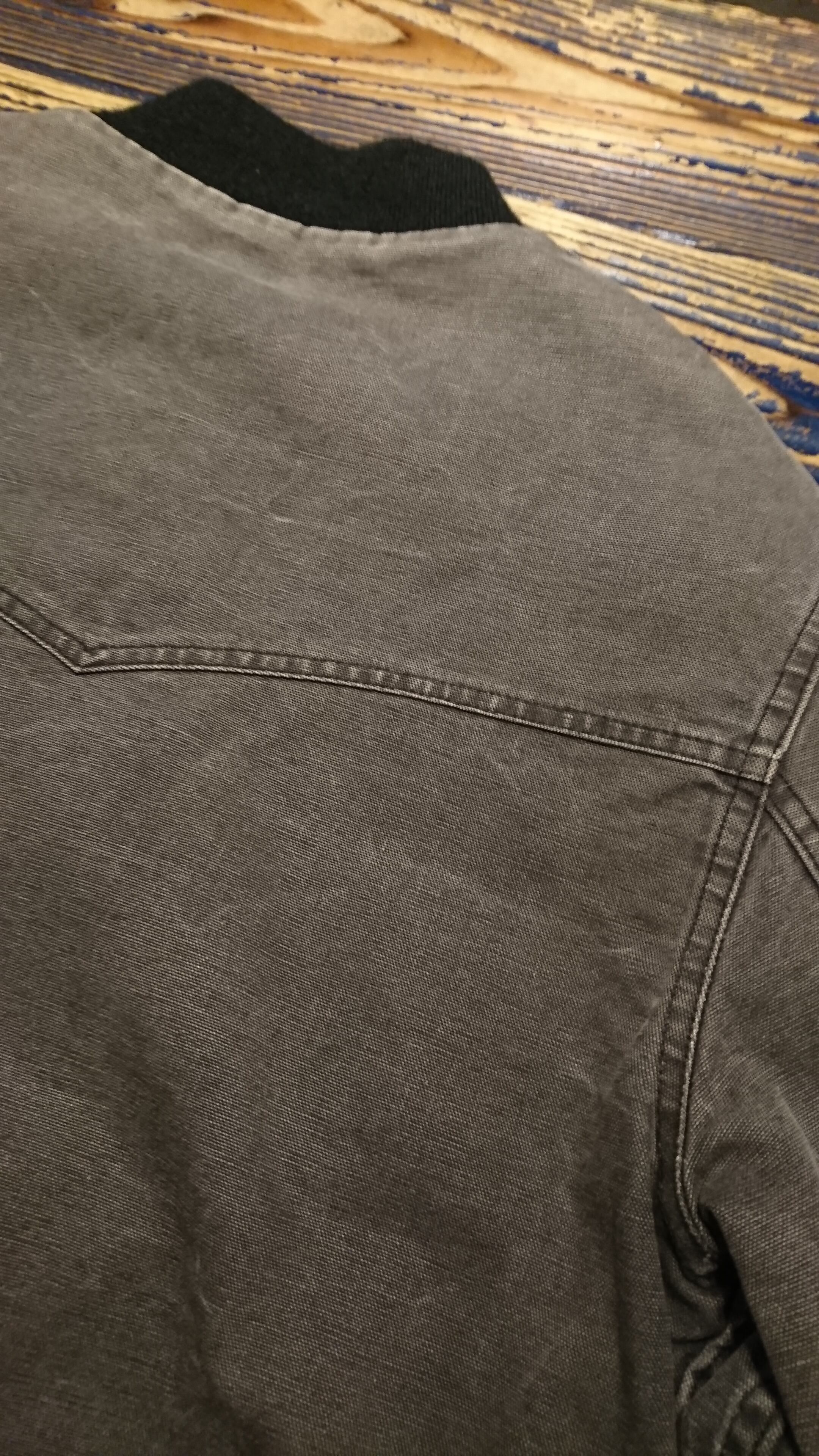 ヨーク切り替えでモデルはサンタフェジャケットと似てますが、襟ではなくリブ仕様になったタイプになります。グレーカラーで色褪せした雰囲気も良し(写真三枚目が実際の色目)。裏地はメッシュ地。リブに擦れ、数ヶ所ペンキ汚れもありますが着用に問題はありません。