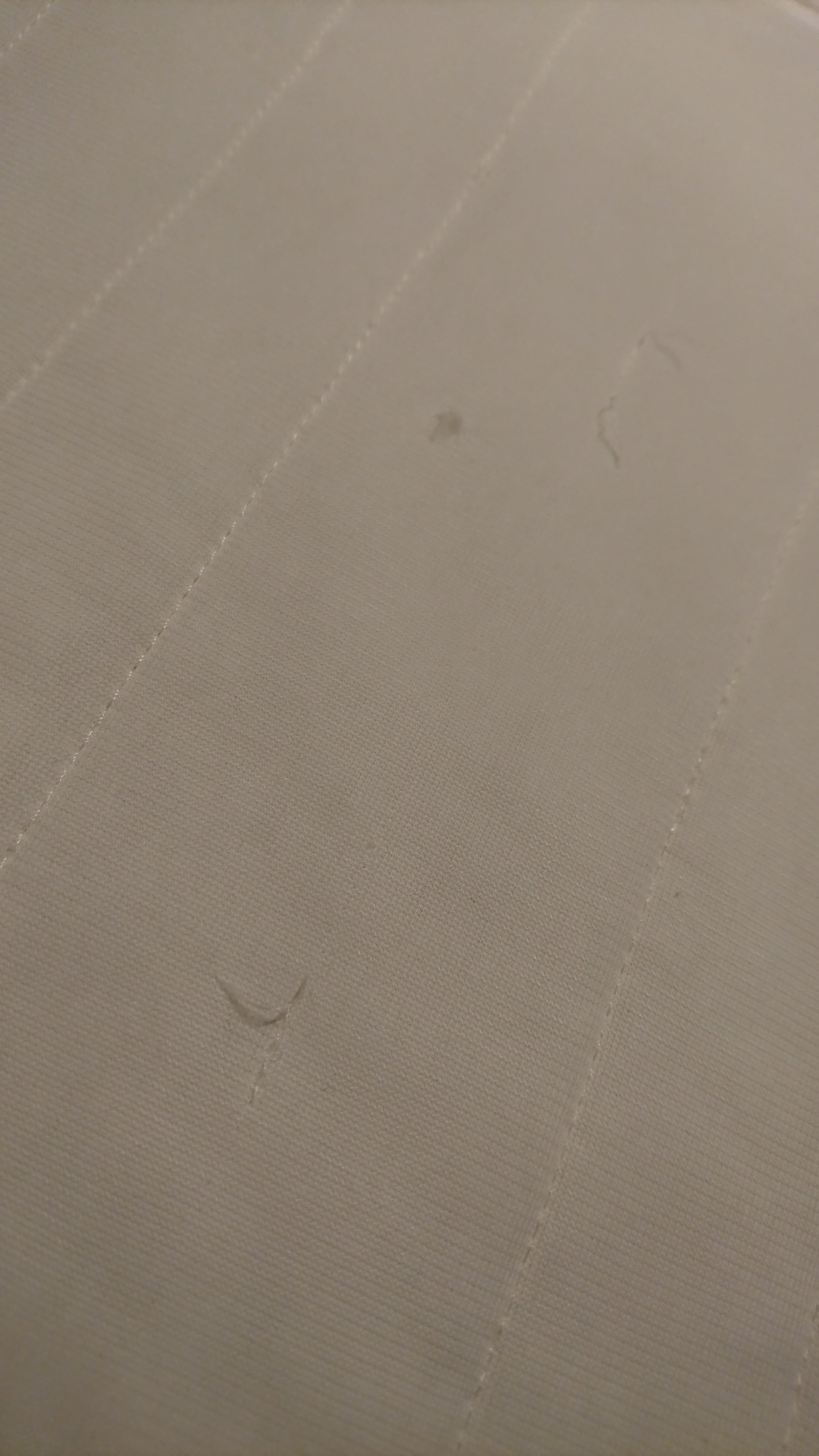 右ネックつけねに少し傷、左ワキ辺りに擦れと汚れ、左袖リブに染み汚れがあります。