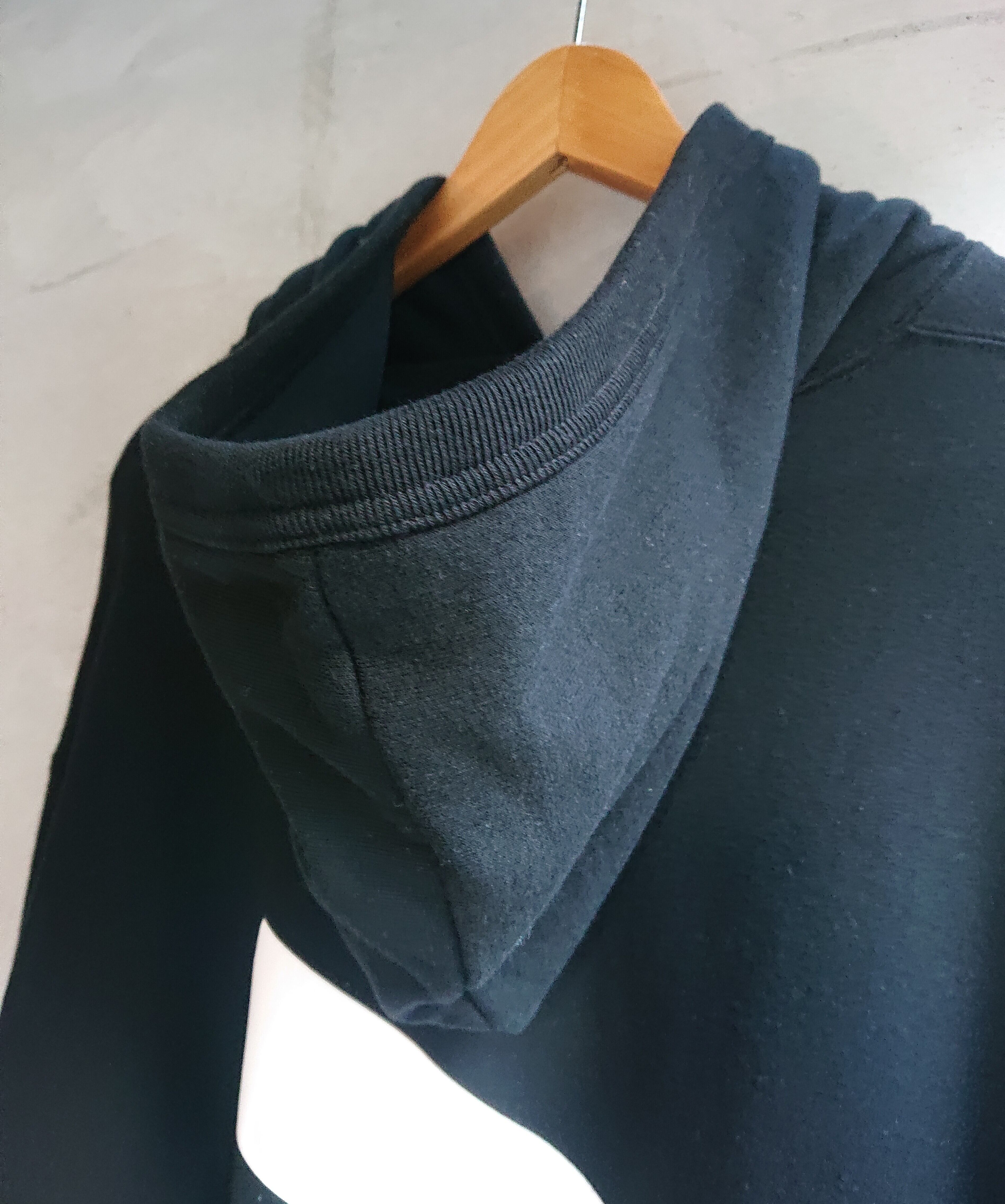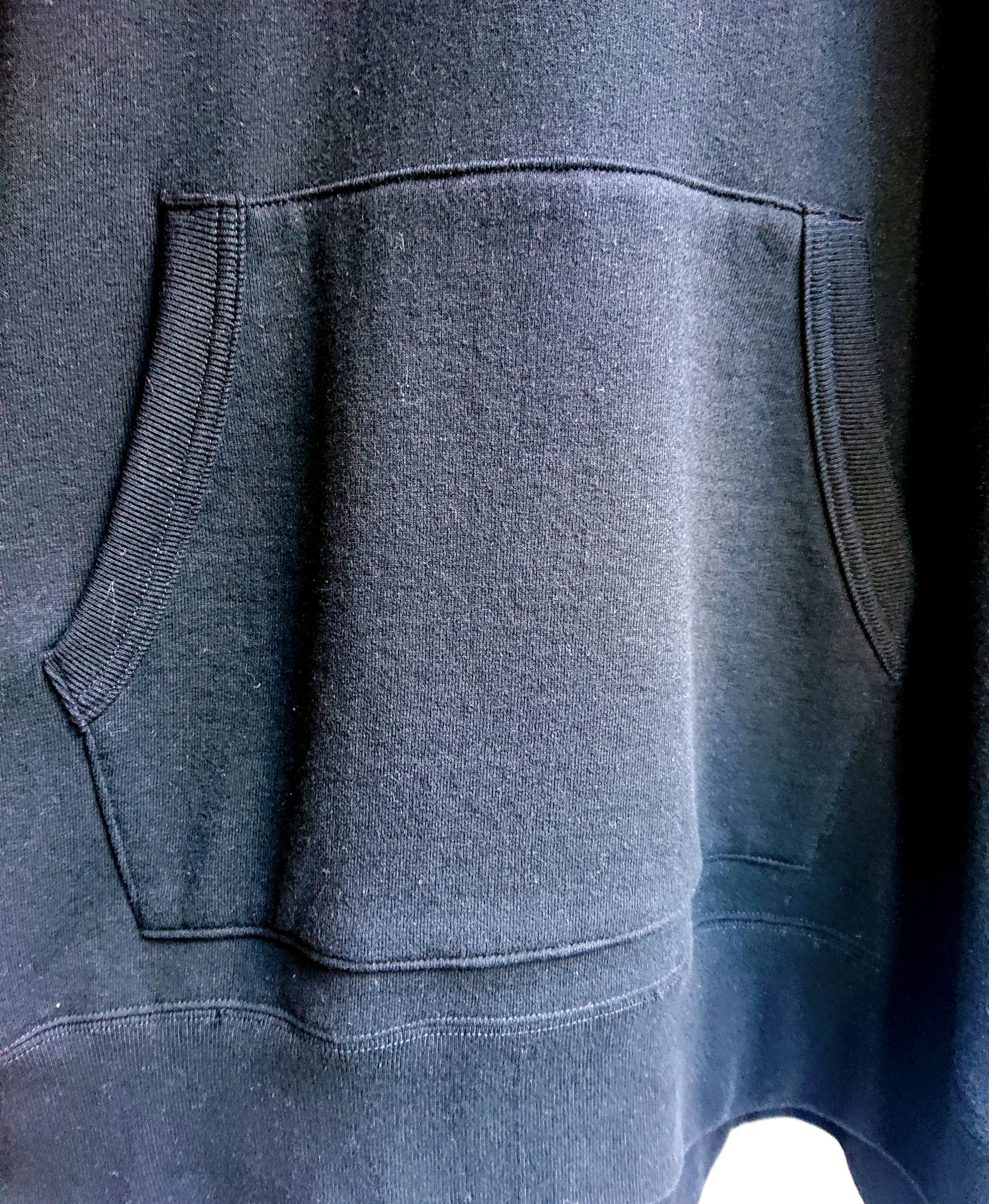 ポイントととしては身頃、袖の太さに比べて衿ぐりの大きさを小さめに設定し、フードを下ろした状態でもの上に乗っかる感じで立ち上がる様に作成する拘り。勿論フード部分は被っても充分な大きさに。加えてフード口と前身頃たたき付けポケット。ポケット口をバインダー始末にて処理する事でクラシック感を感じて頂ける様になってます。