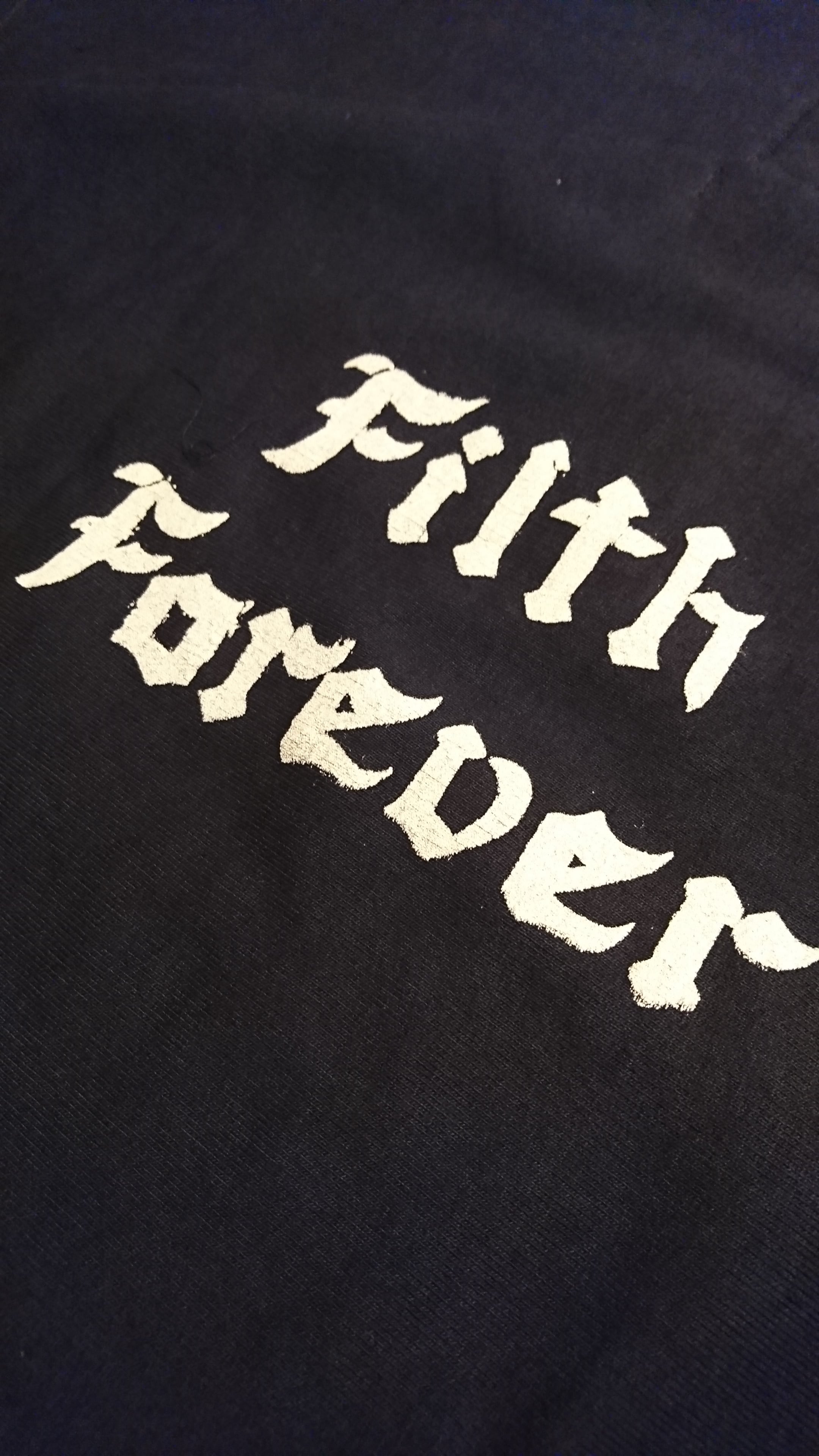プリントは、経年変化最高を表現したワードに、作業で破れた意味合いを表すプリントと、その擬音ワードをプリント。