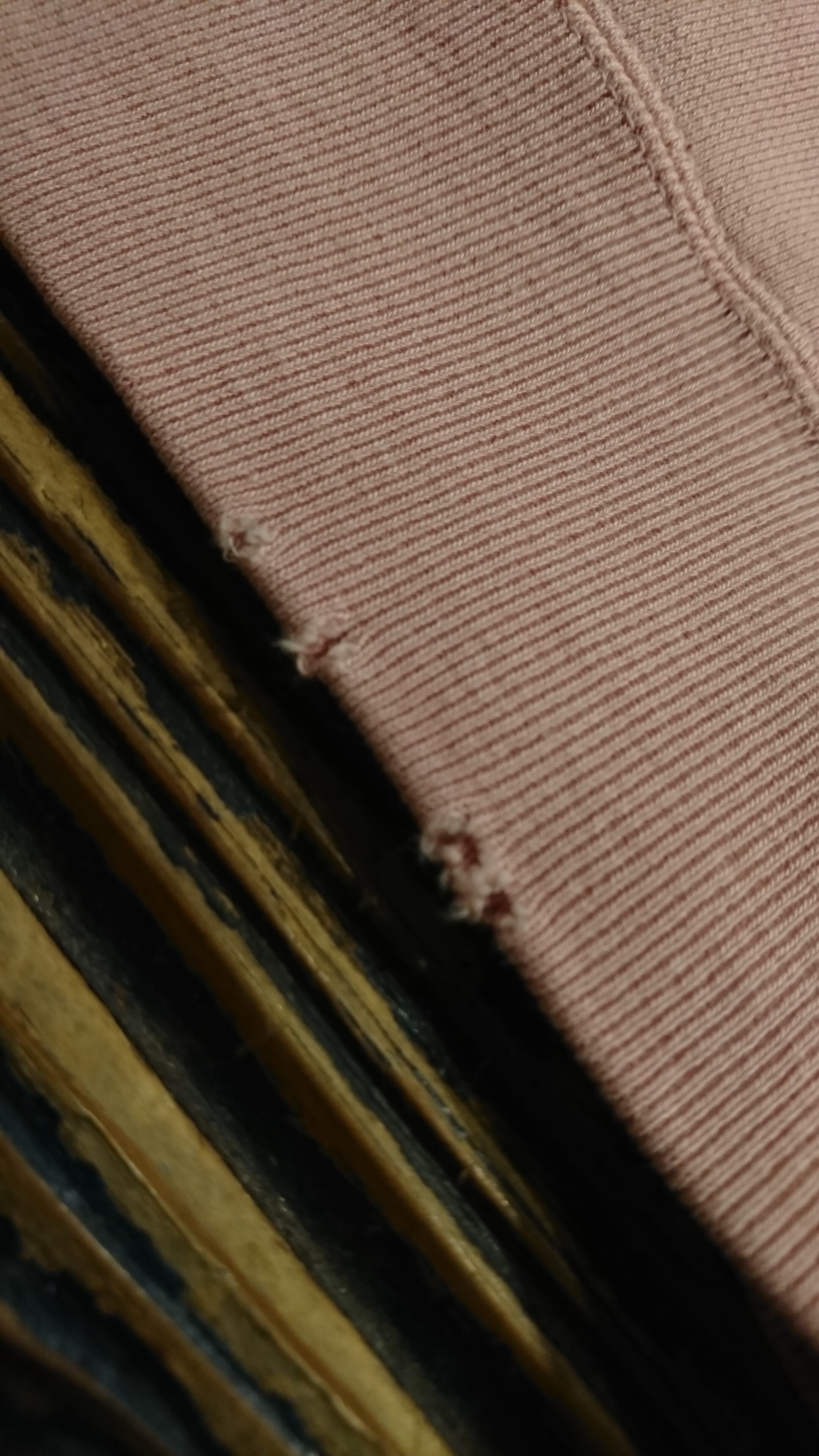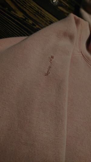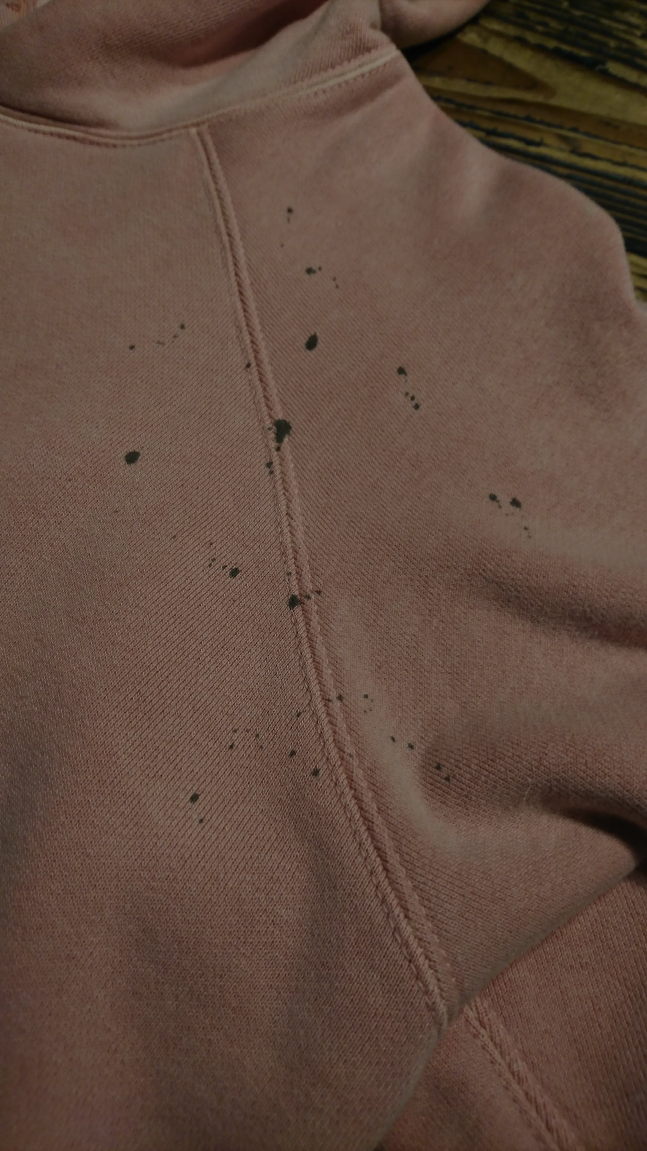 JACKSON MATISSEフードスウェットになります。ピンクカラーのエイジング。所々に飛ぶインク汚れに数ヶ所のダメージ加工。