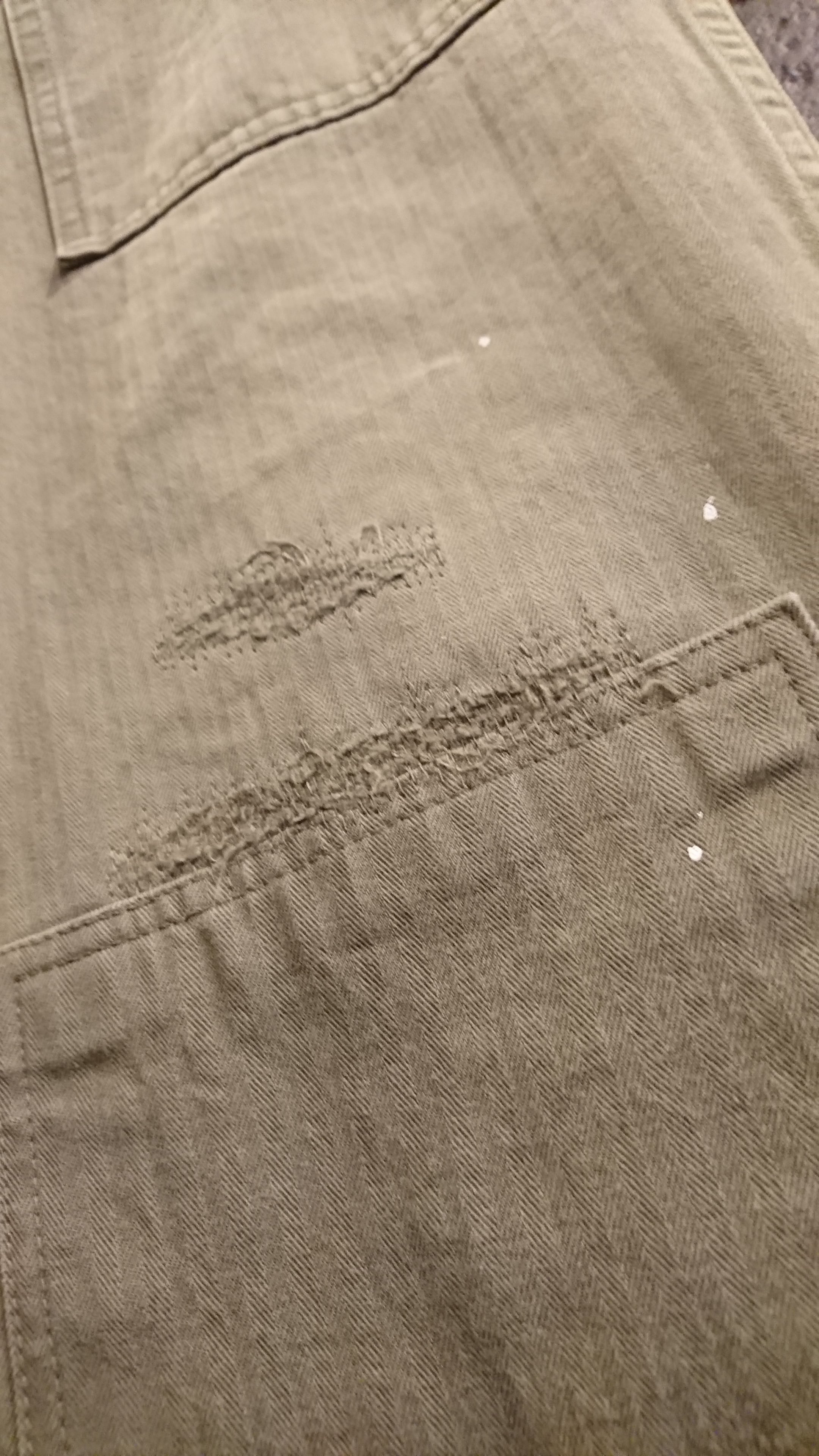 米軍ベイカーパンツの初期に存在したヘリンボーン生地バージョンM47再現し、リアルなダメージ、焼け、リペア加工。
