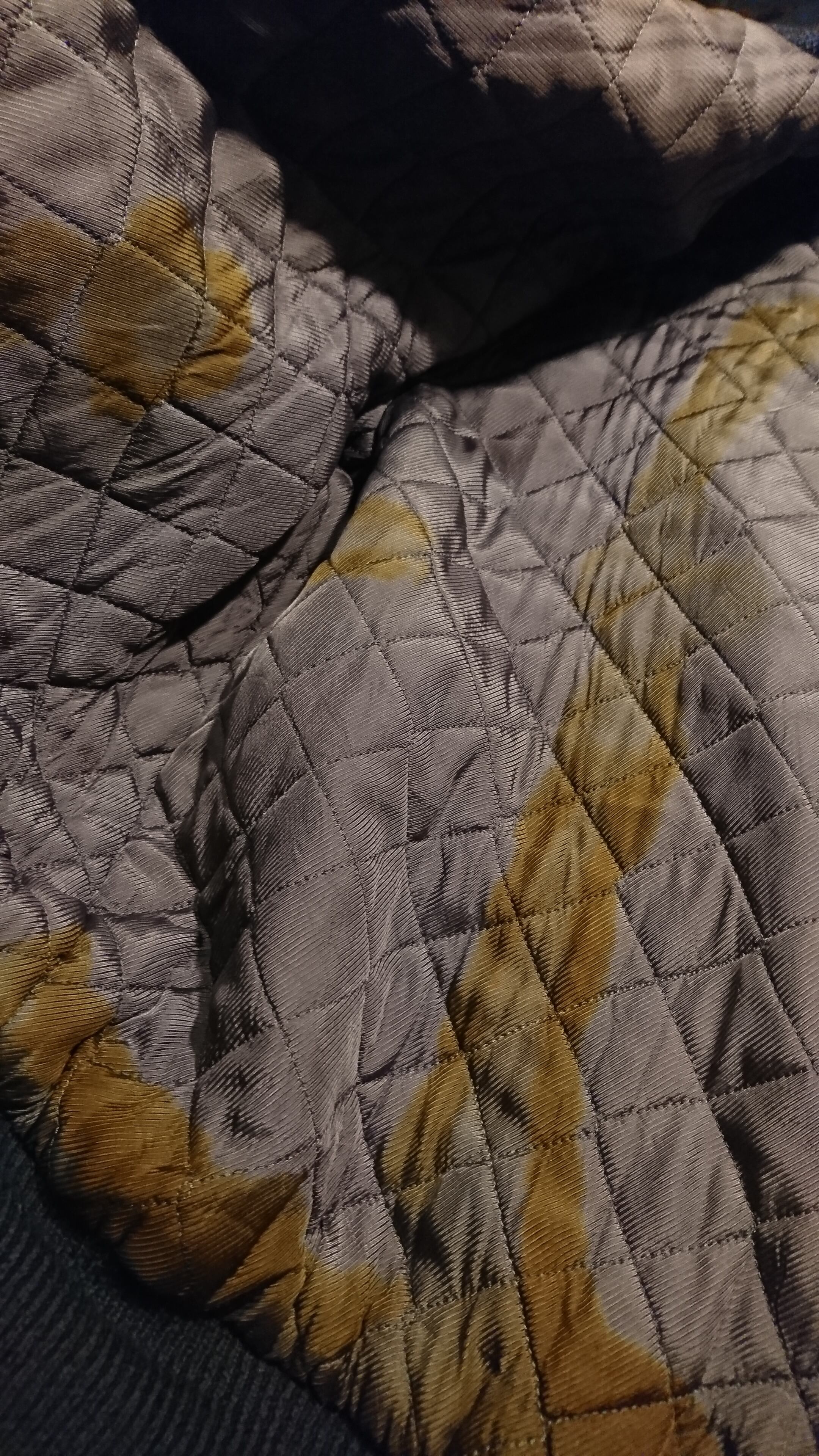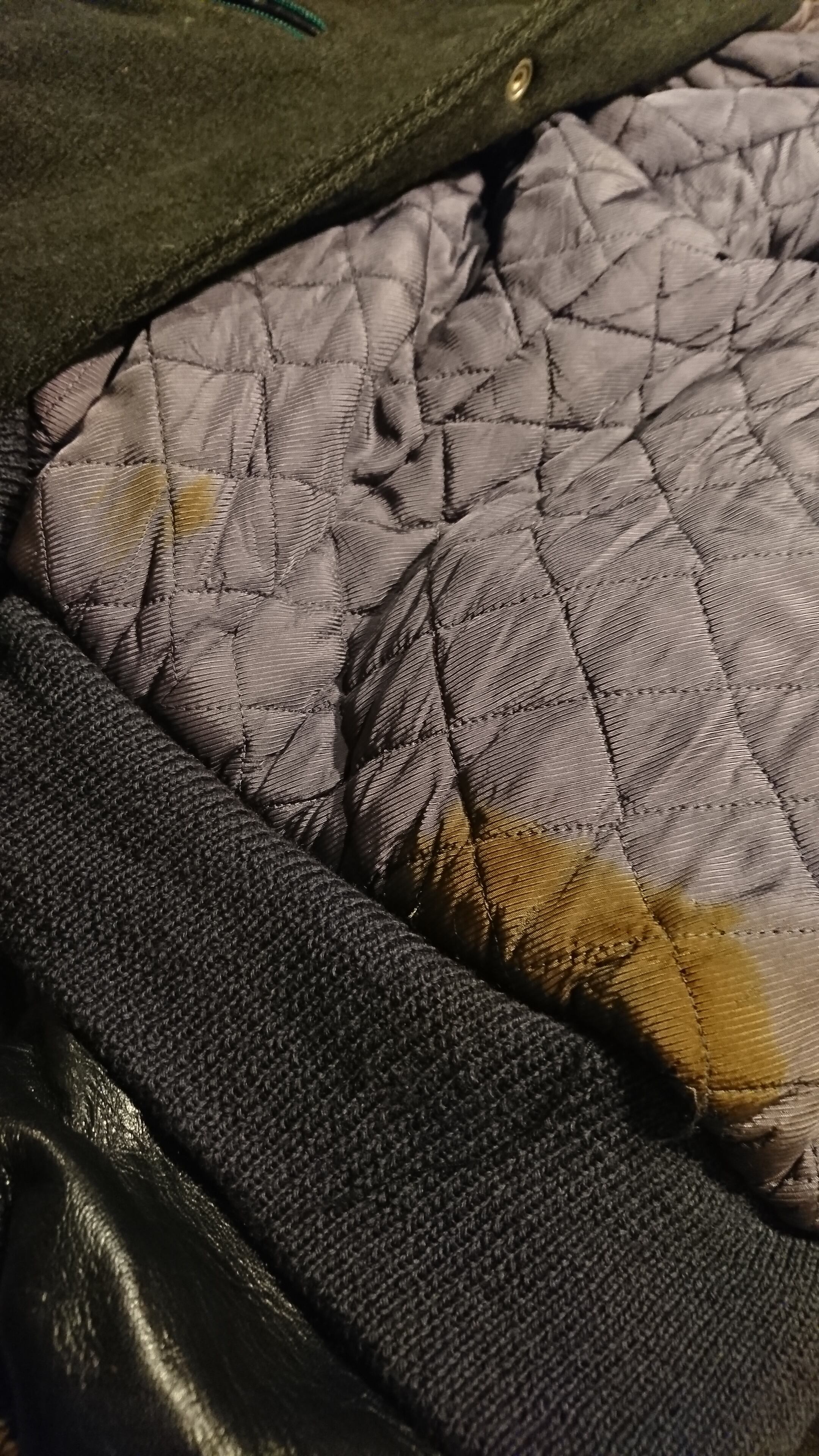 内側はキルティング仕様で所々染み汚れがあります。リブ部分に汚れと小さなホールがありますが着用に問題はありません。