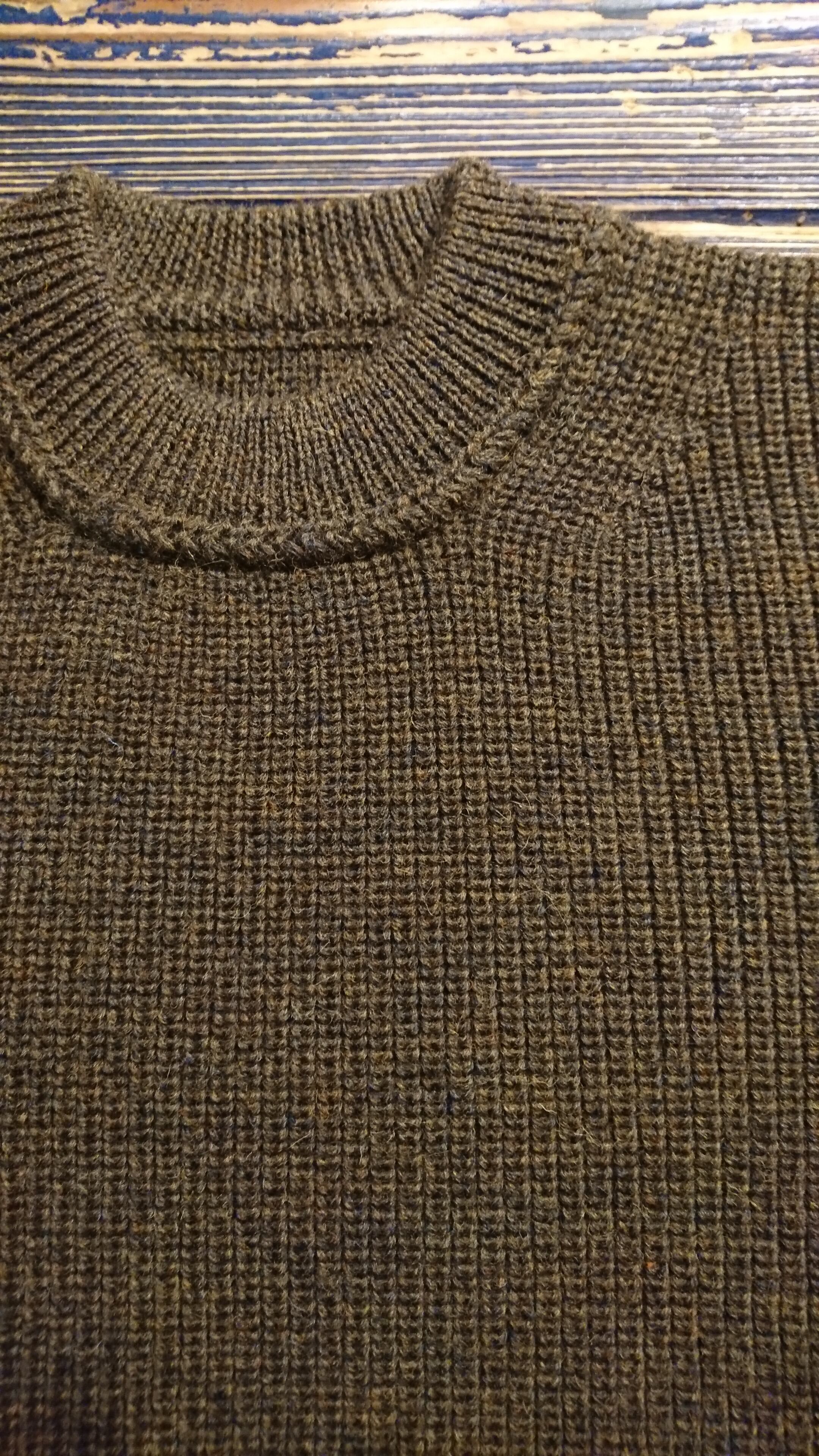 WASEWの作るフィッシャーマンセーターはブリティッシュウールと南アメリカのウールをブレンドした糸を使い畦編みで編むことでアメリカのセーターの様な重量感を出し、ミックスカラーの糸を使い奥深い色合いを出しています。