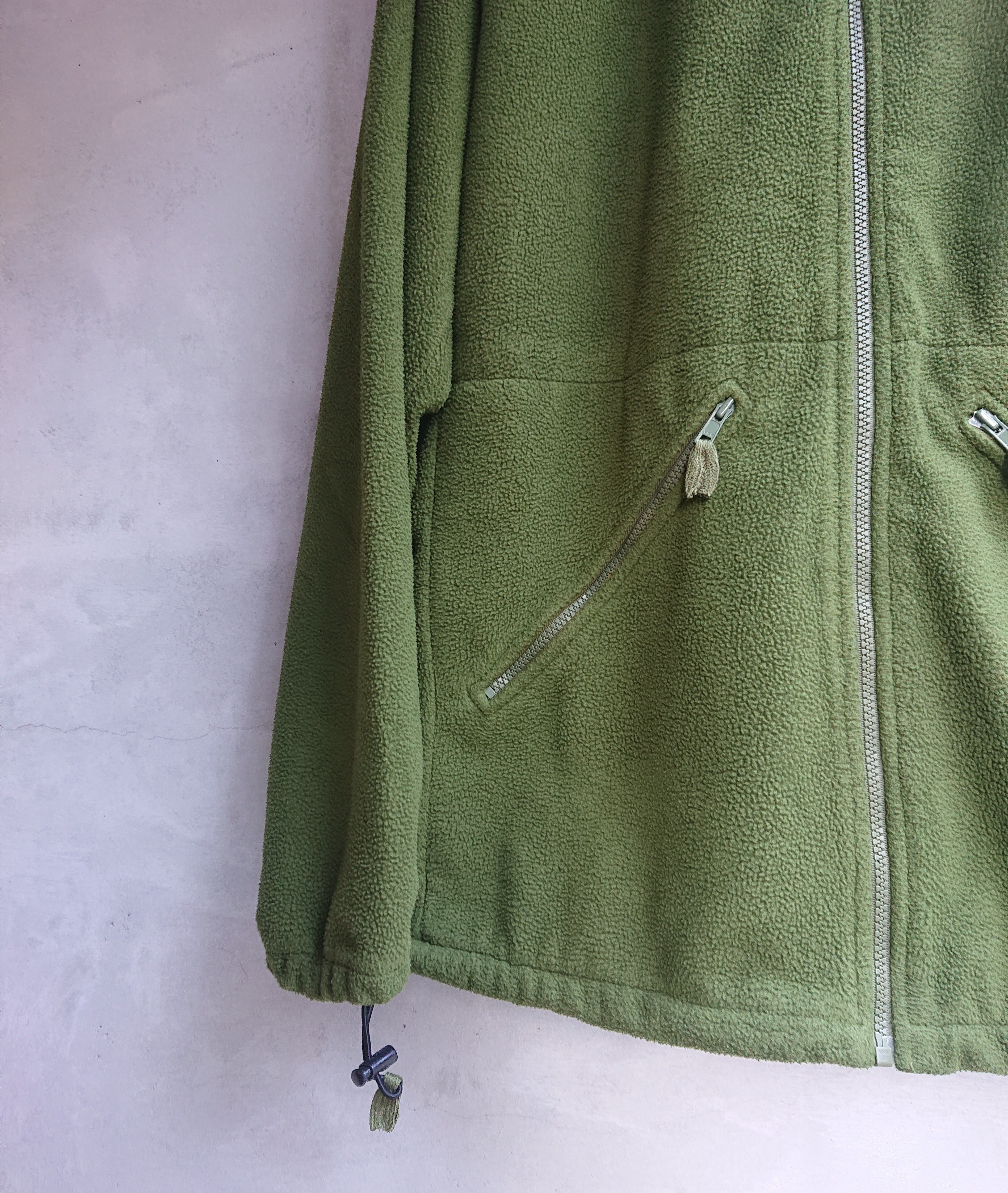 ゴム入りの袖口にはサムホールが備わっており、指を通しても着用できるデザイン。裾にはドローコードが付いてるので絞りが可能。「LINER Green Thermal」という名の通り、本来はアウターのライナーとして使用されているためにアウターとしても勿論、ライナーとしても使用できる機能性あるフリースジャケットです。