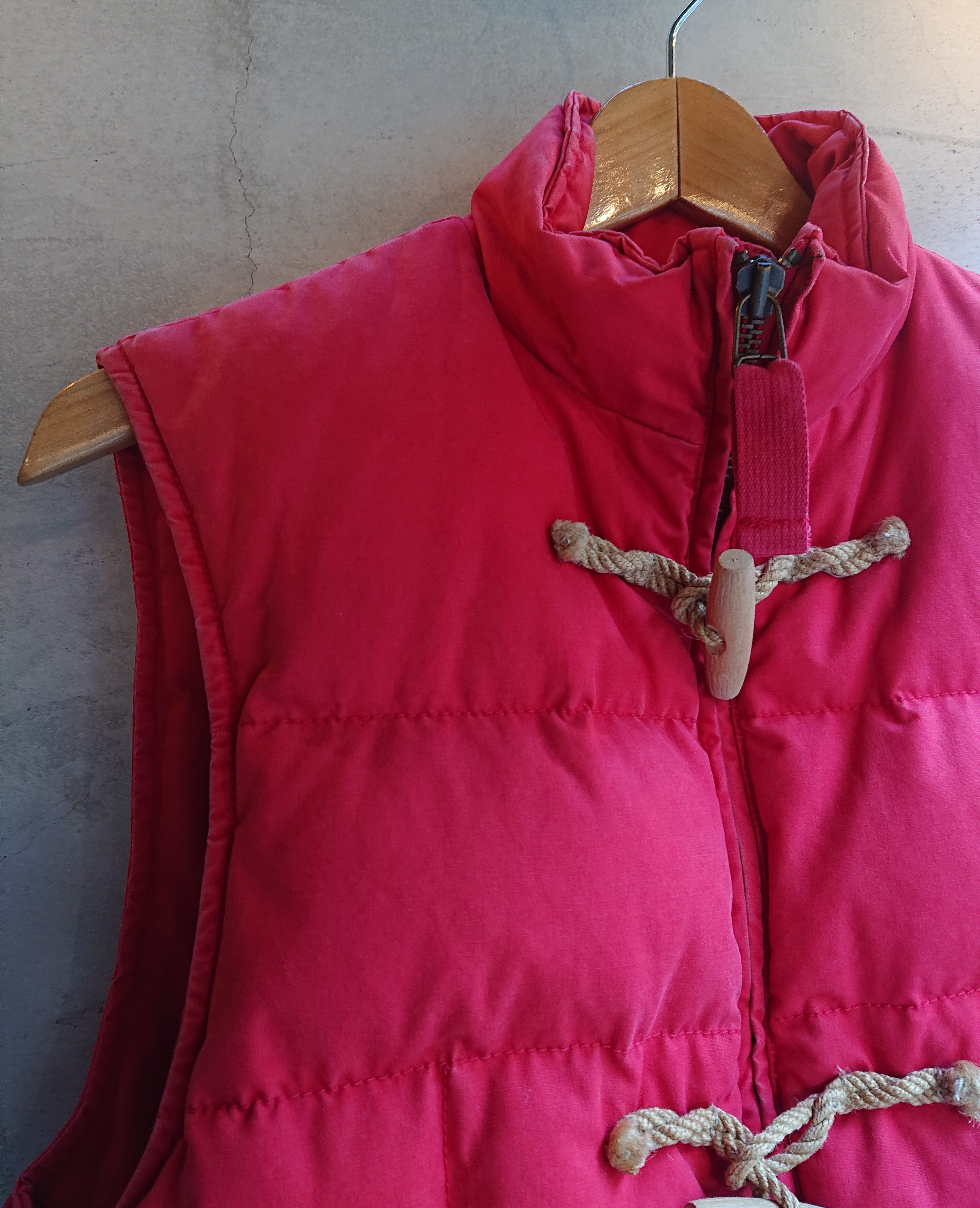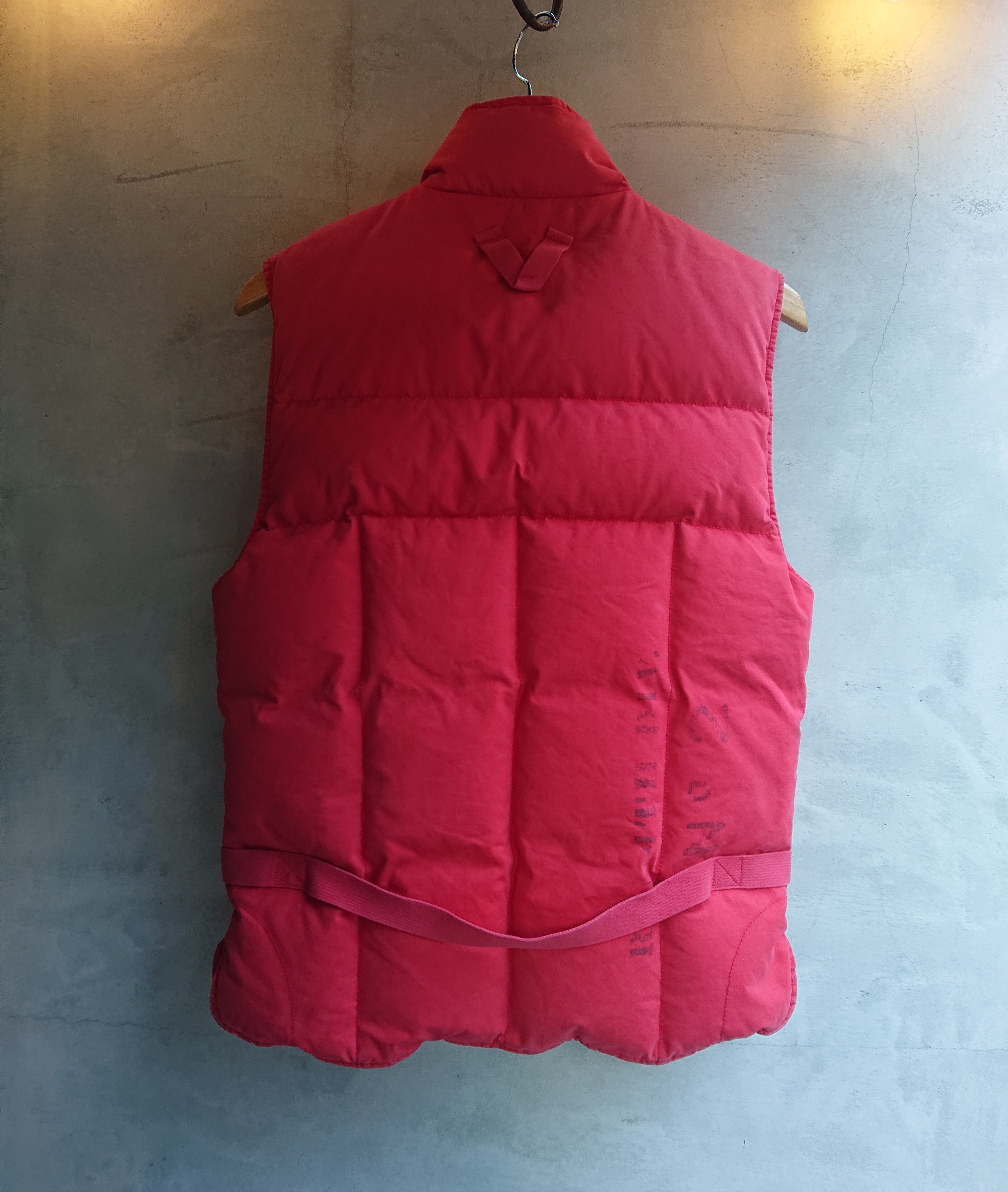 RalphLauren RUGBYのダウンベストになります。2004年にアメリカ・ボストンで誕生したRUGBY。ヴィンテージのミリタリー救命胴衣ベストのデザイン。フロントはトグル仕様。全体的に少し色褪せた赤に背中裾に入るステンシルプリント。
