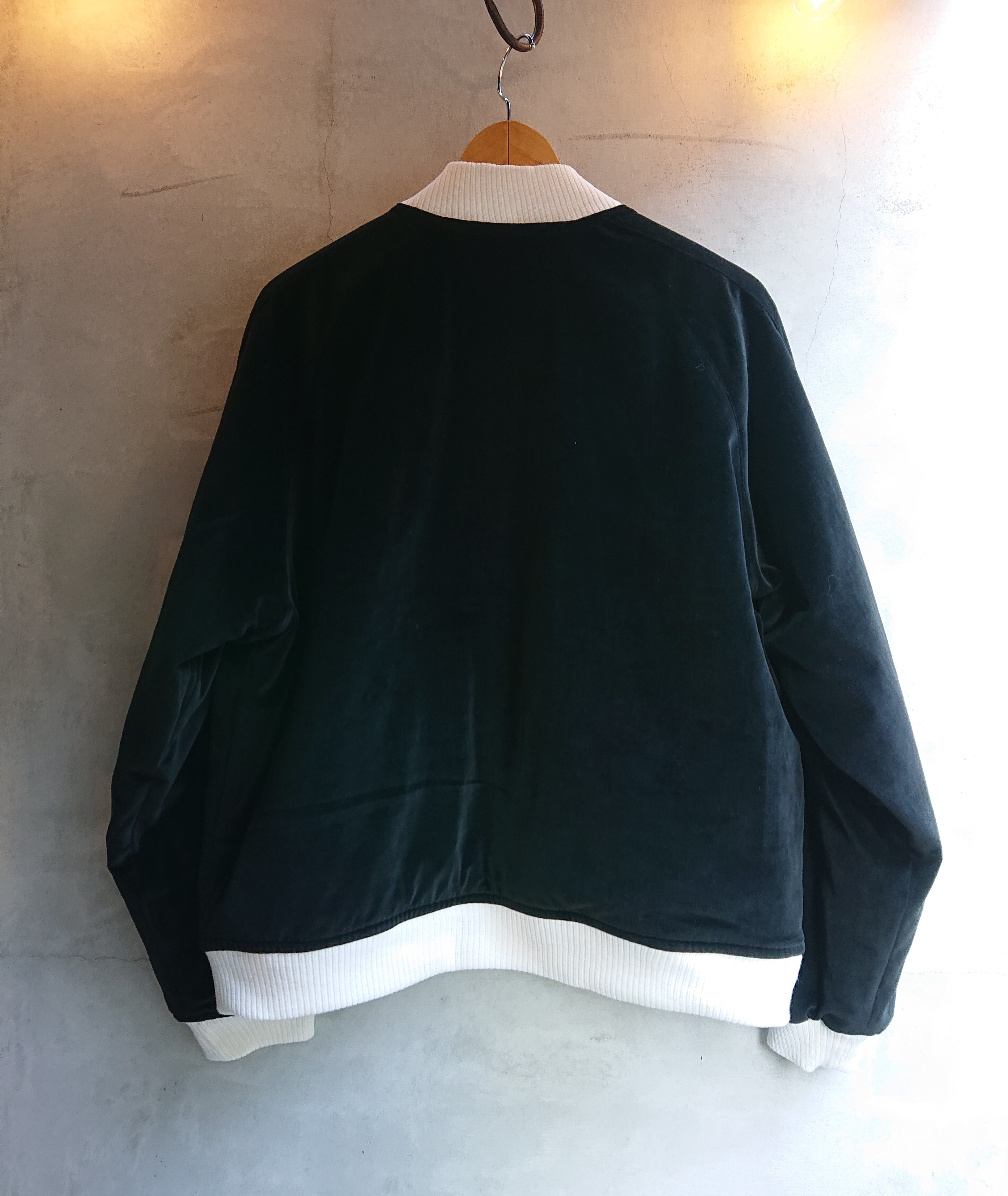 別珍とサテンのリバーシブルスカジャンです。50sのスカジャンの様にリブは白を配色しており、別珍サイドでは黒と白のコントラストが際立ち、サテンサイドでは薄いベージュ単色のソリッドカラーを楽しめます。インサレーションには高性能素材のClimashield®を使用しているので保温性は抜群です。ラグランスリーブなので中綿が入っていても肩周りが膨らむことなく、シルエットをきれいに保ちます。