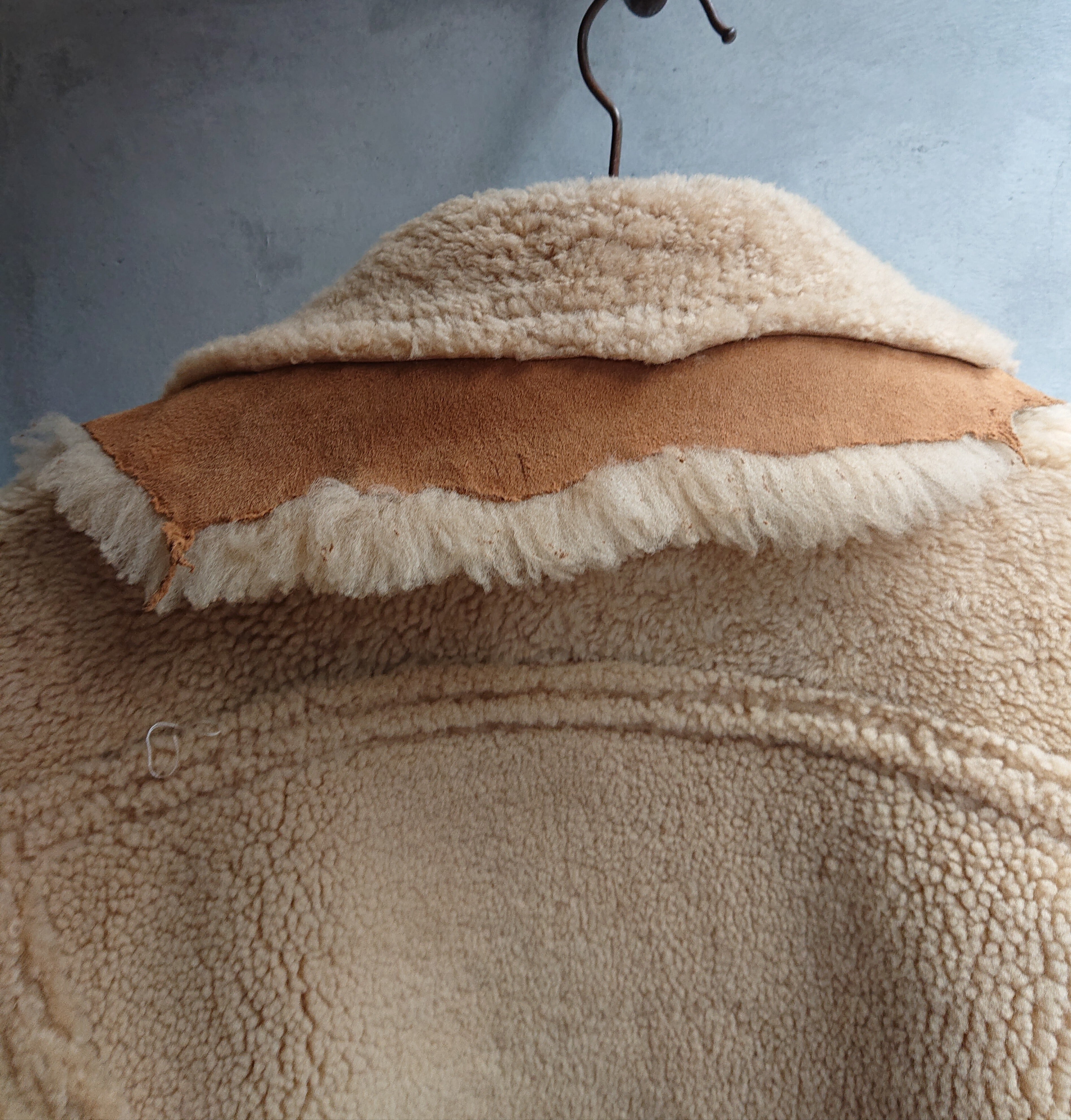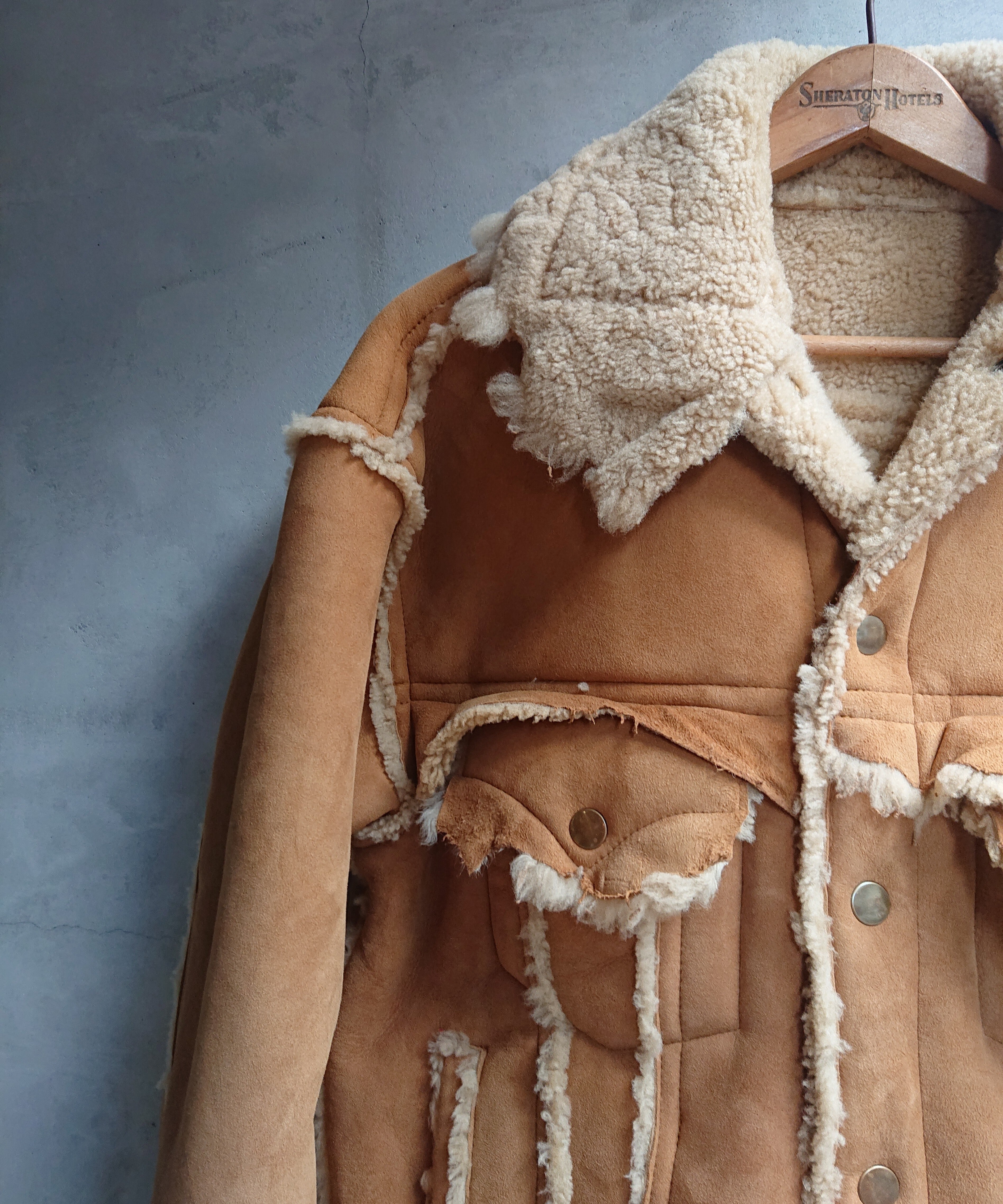 全て断ち切り(切りっぱなし)で処理し、エリ、ポケット、ヨーク、裾、袖口は元々のムートンが持つナチュラルエッジをデザインとして落とし込んでおりますので、どれも全く同じ物が存在しない完全なる一点物になります。