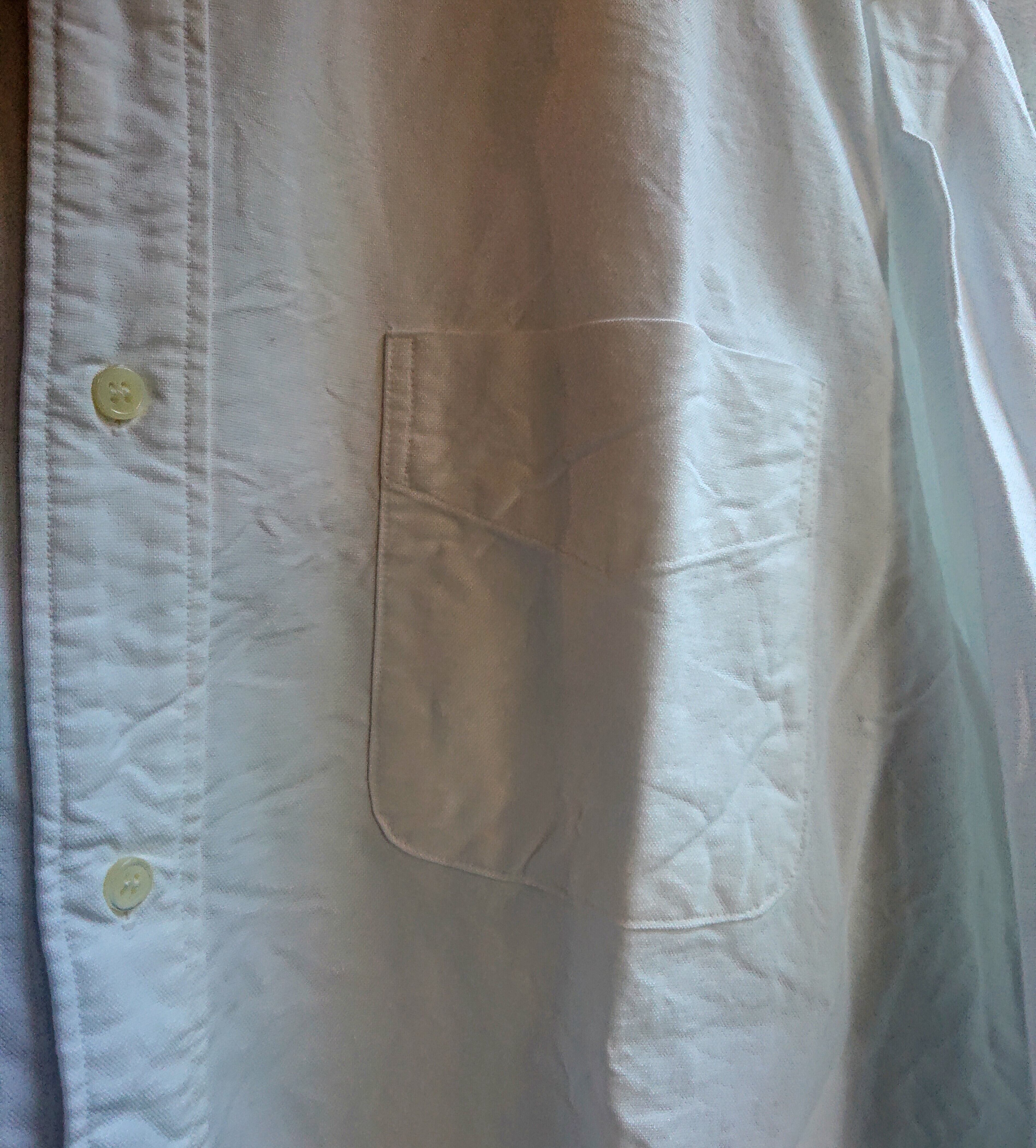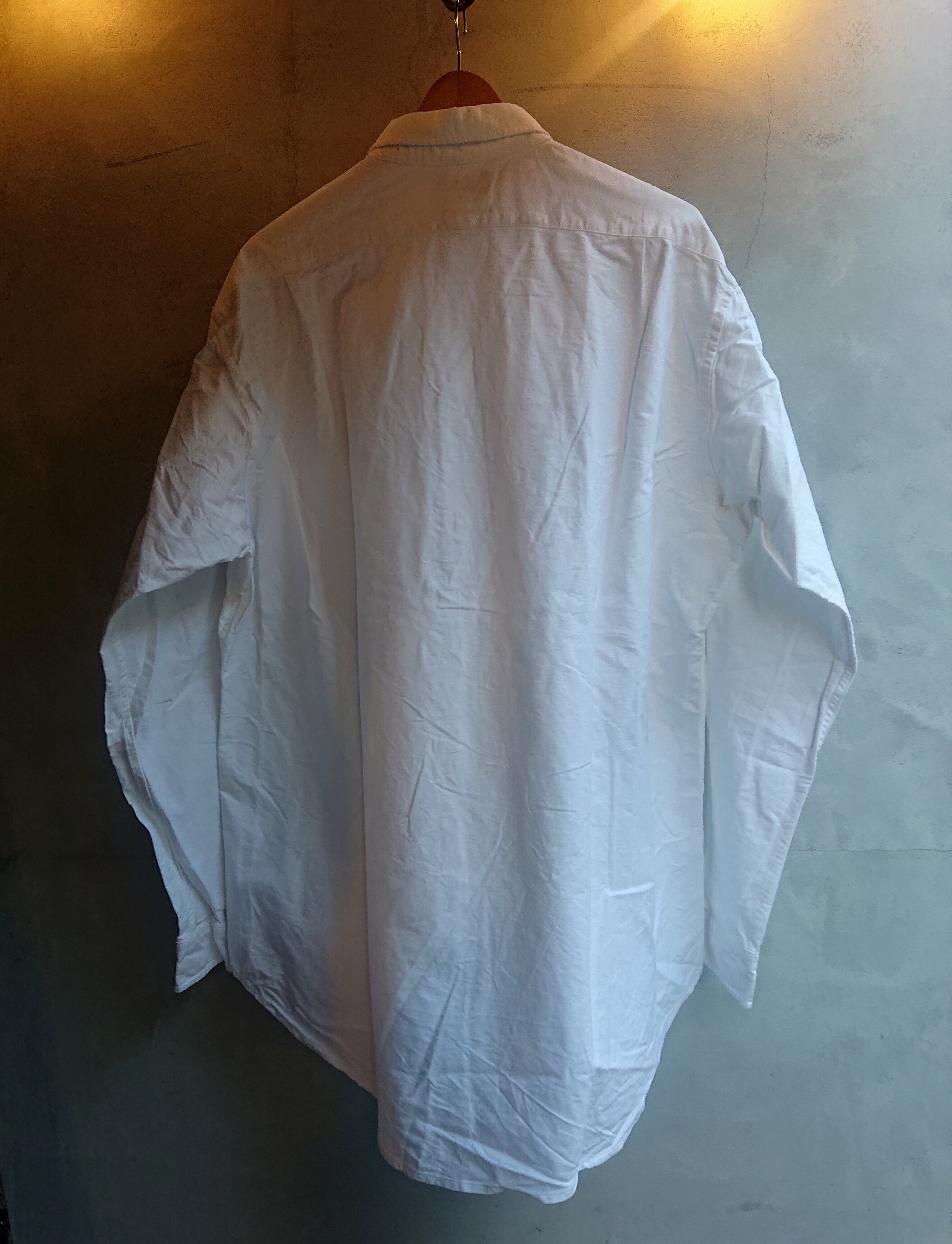 ガサッと洗いざらした若干厚手のオックスフォード生地は旧き良きアメリカを感じるが、いたってベーシック。衿と、大き目のサイズバランスによりブランドらしさを表現するが、ありそうでない主張の少ない90sを感じるアイテム。