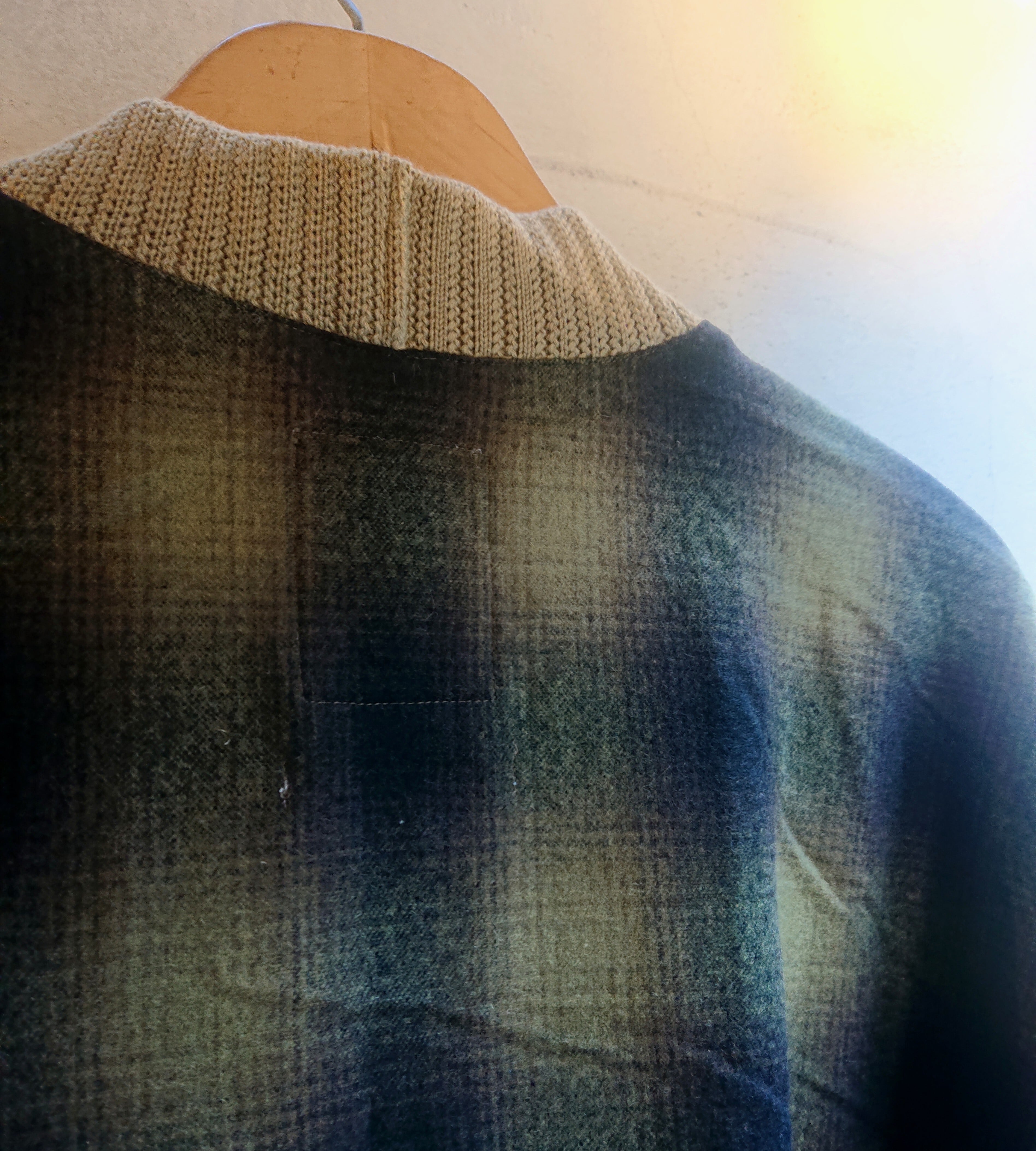 50年代から60年代に見られる布帛生地のカーディガン。有名なところでは、ペンドルトンであろうが日本のファッションには、馴染みが浅い。サイズバランス、デザインで落とし込みづらいのであろう。